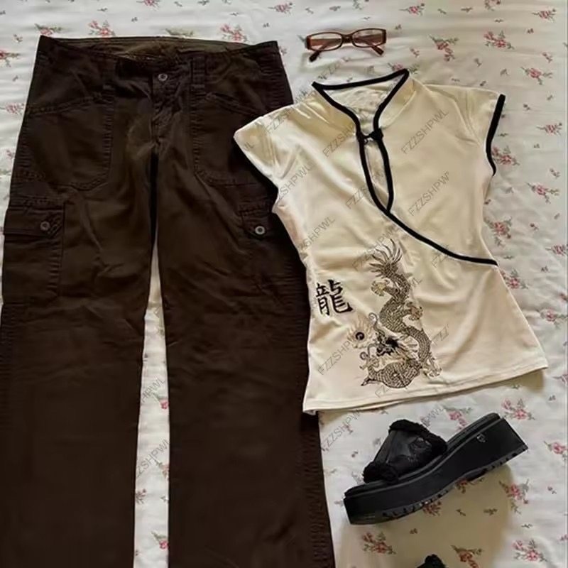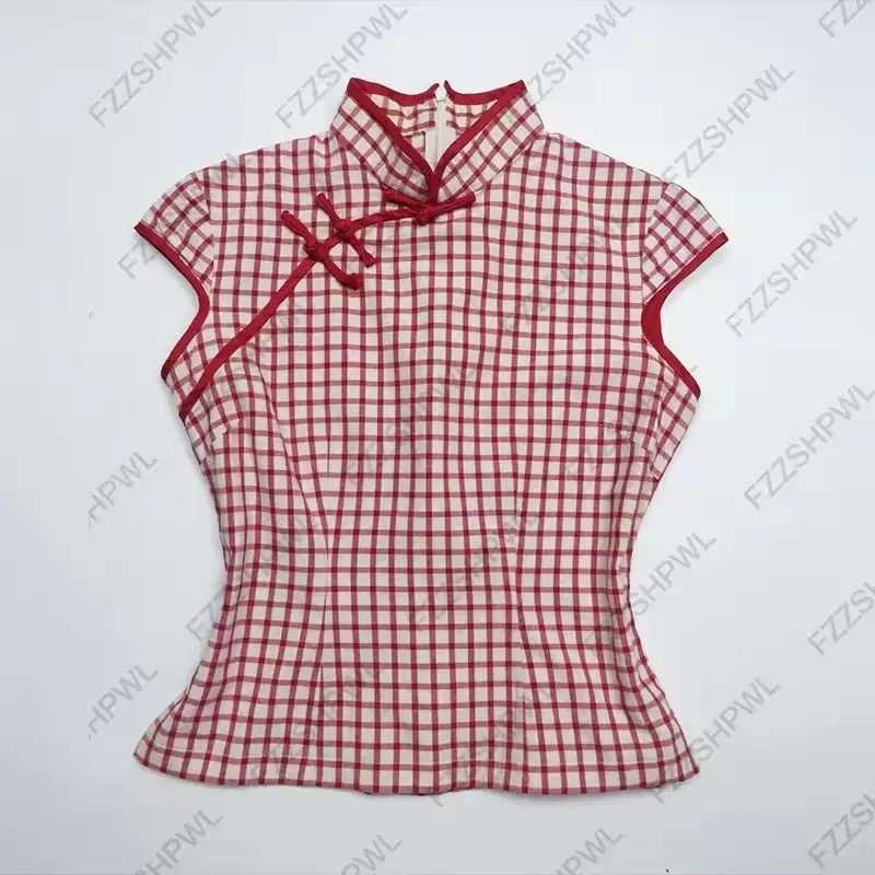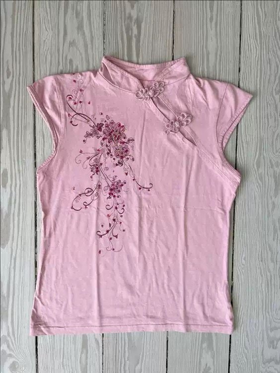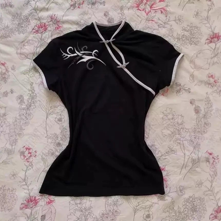 TOP跨境新款国风设计感印花拼色立领盘扣旗袍式短袖修身T恤上衣女 [Original Page Link]