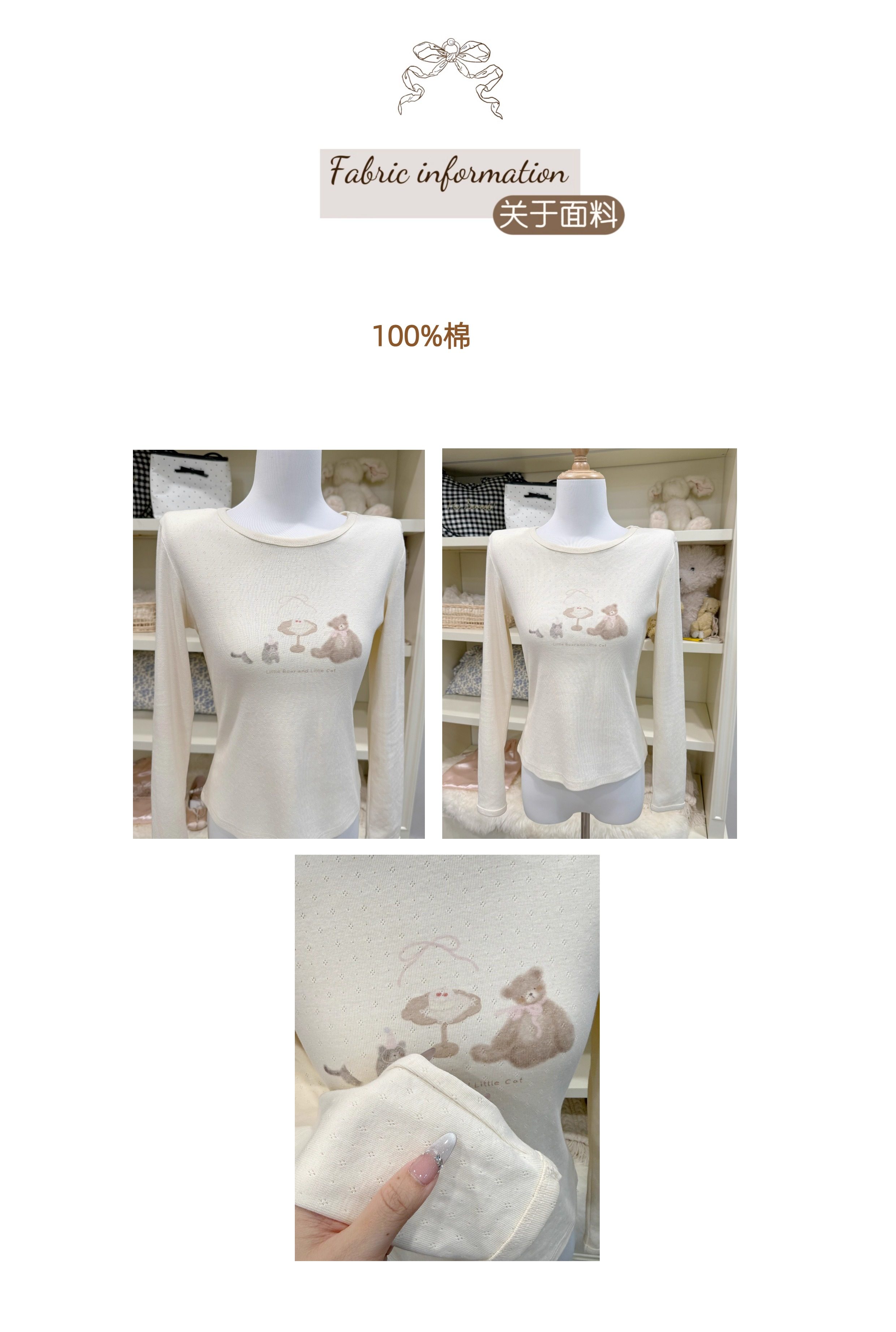 DOLL Original - Little Bear Croissant - Apricot Print Long-Sleeve T-Shirt Women's Autumn New Versatile Casual Round Neck Top
