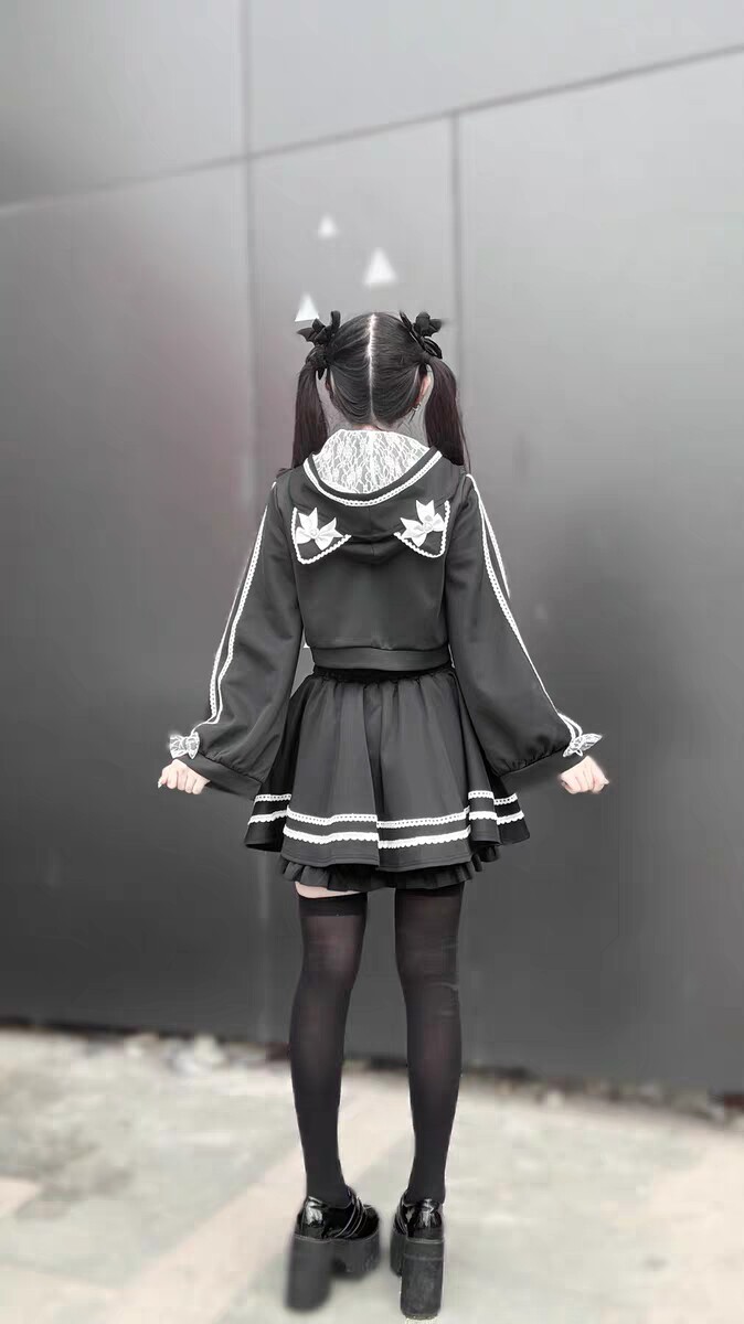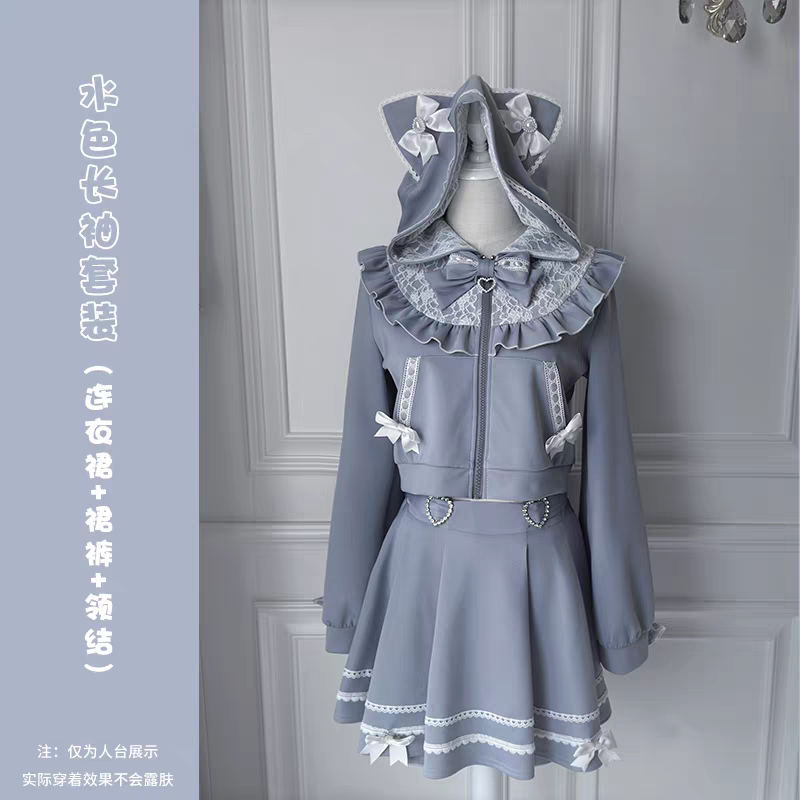 亚文化少女猫耳甜心秋冬可爱运动服长袖短外套半裙黑色水色套装 [Original Page Link]