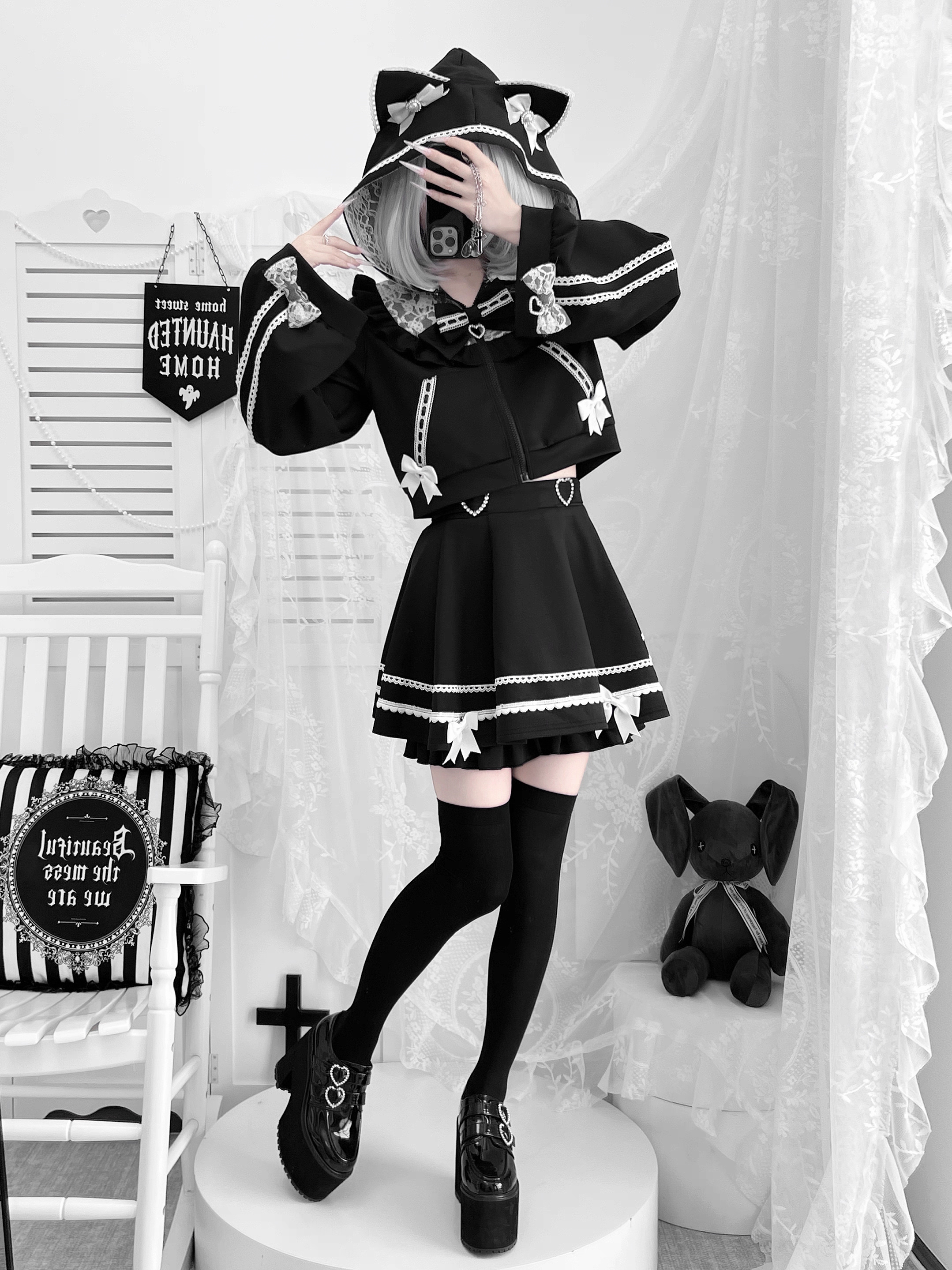 Subculture Girl Cat Ear Sweetheart Autumn and Winter Cute Sports Suit Long Sleeve Short Jacket Skirt Black and Watercolor Set