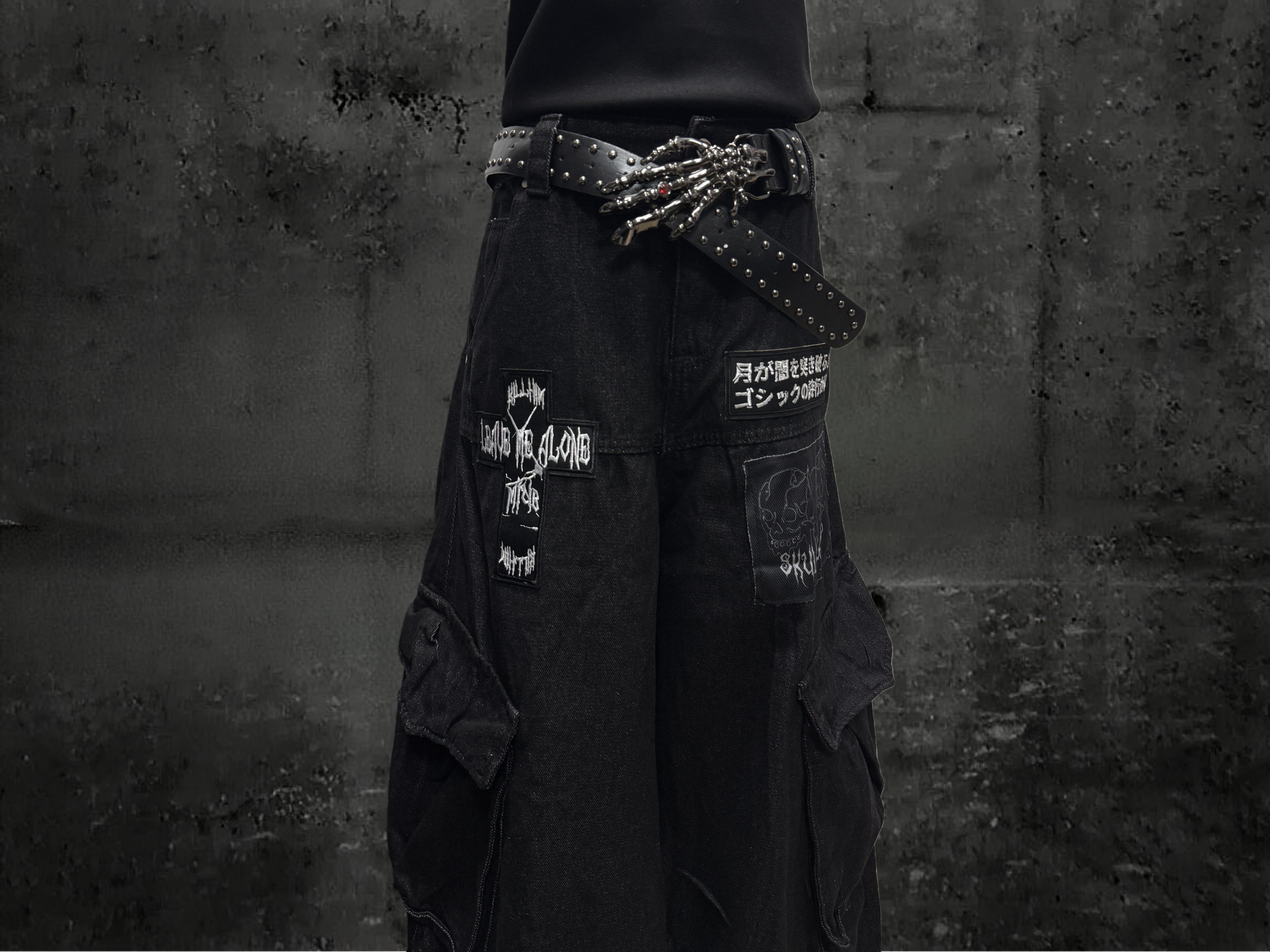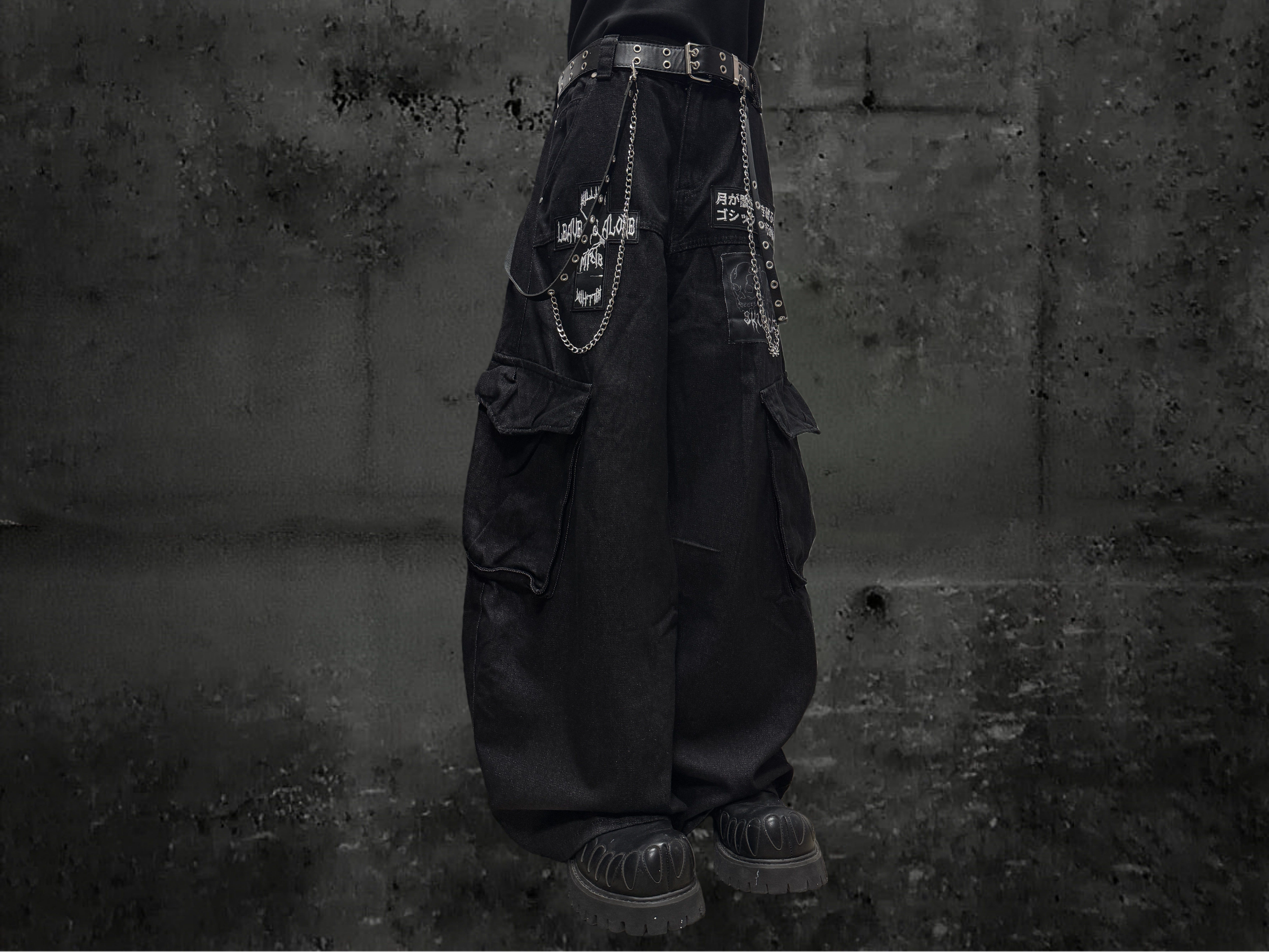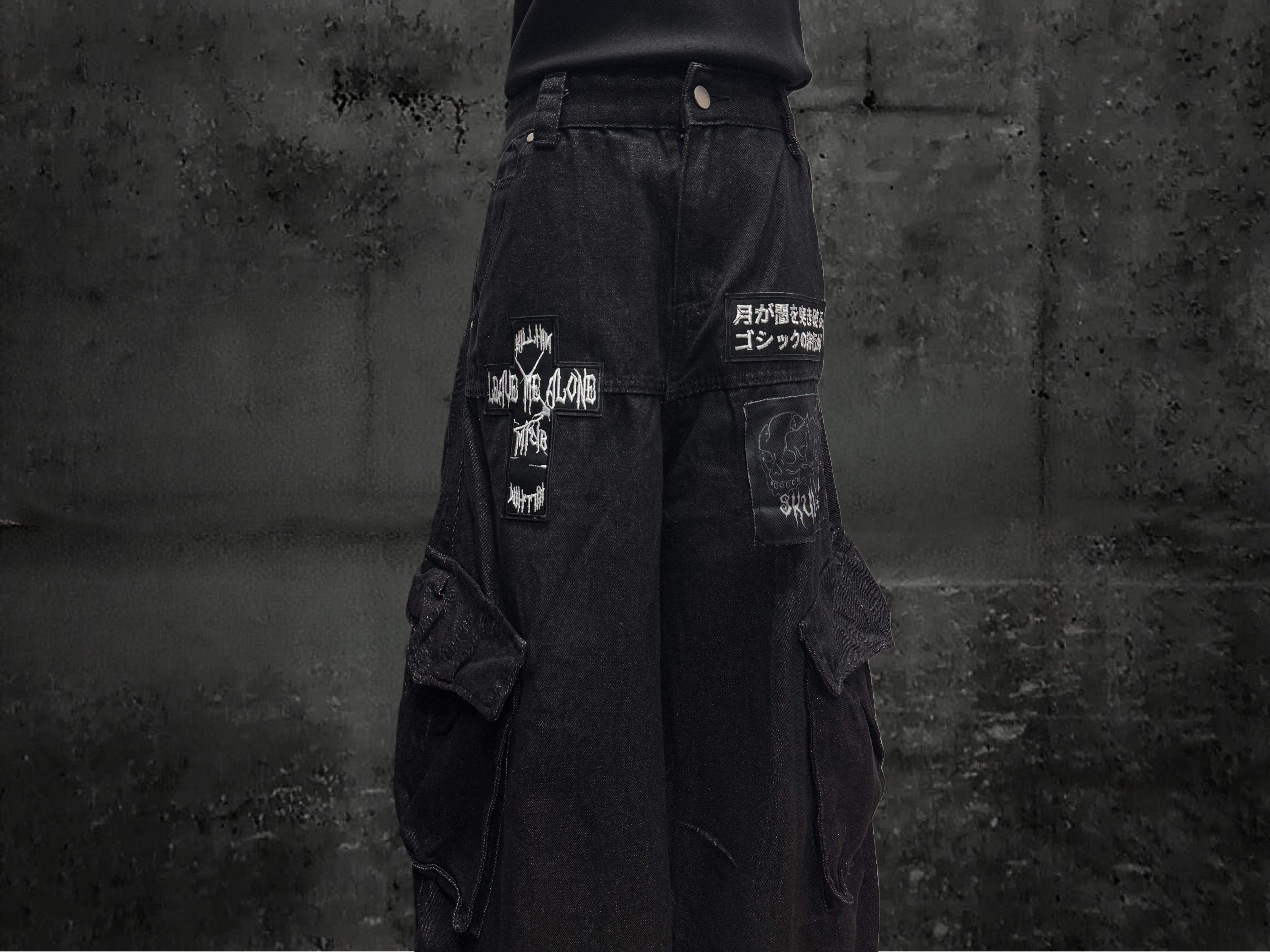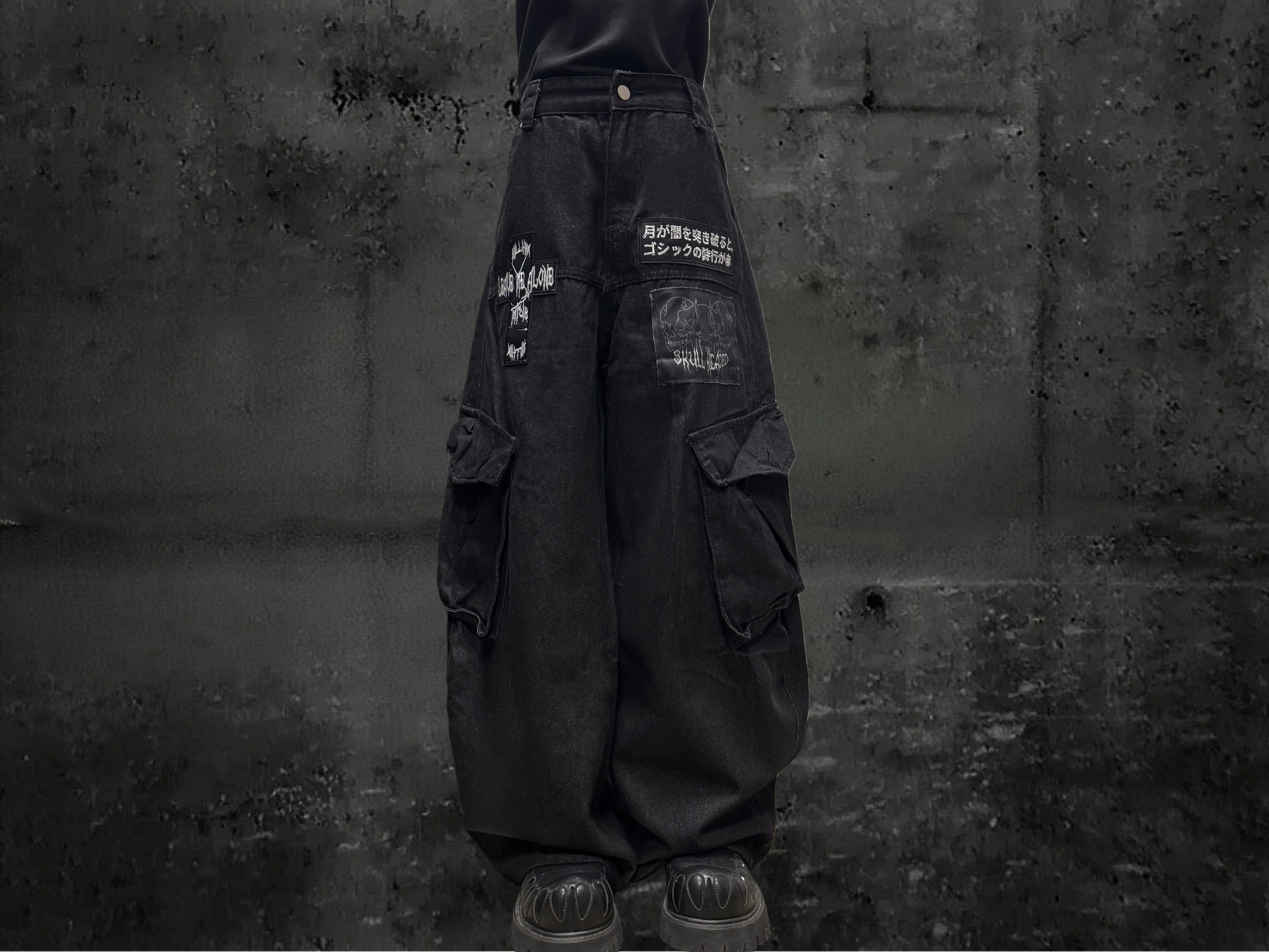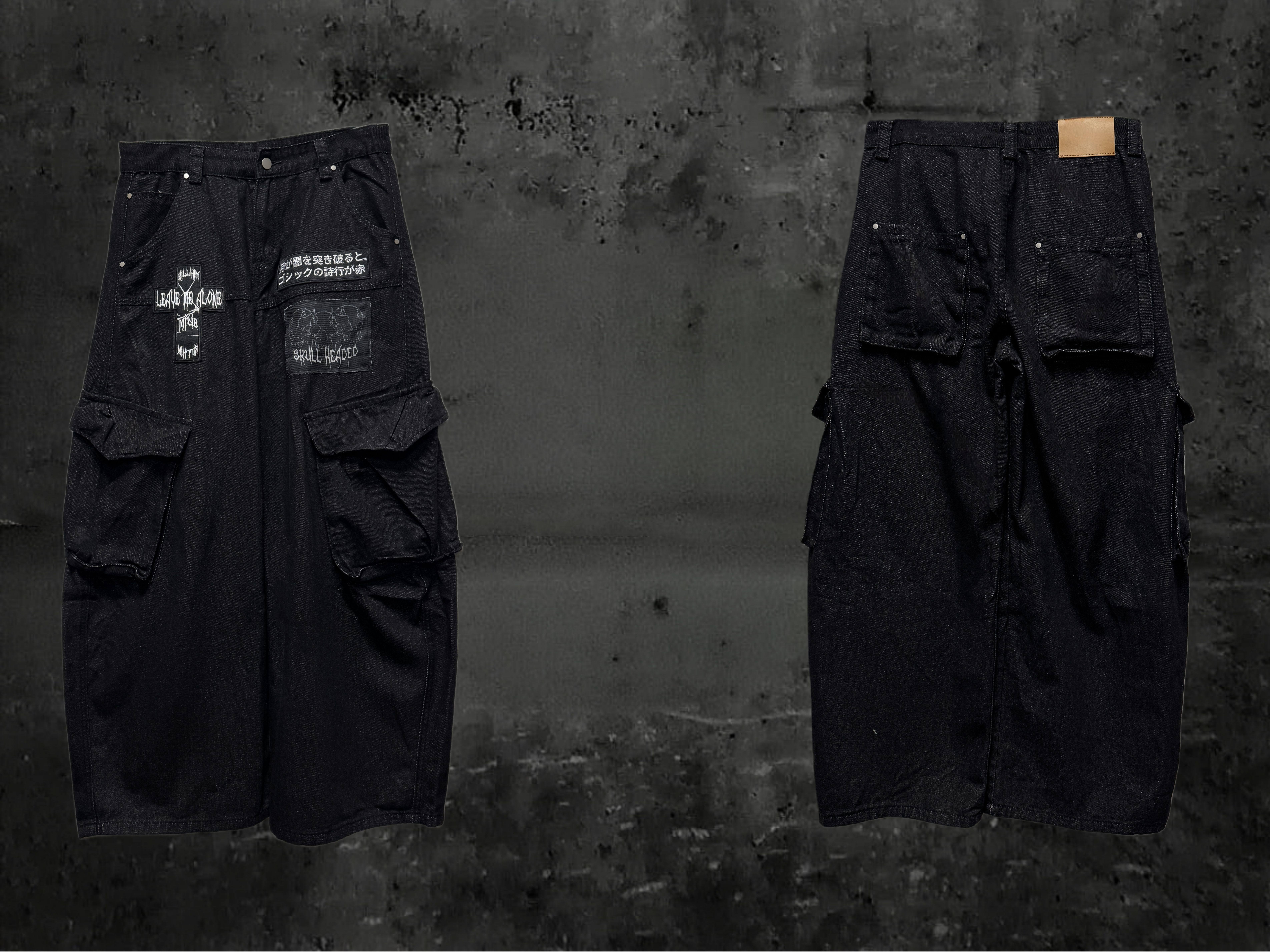 Miub美式复古暗黑工装口袋牛仔裤男女中性废土风皱褶贴布阔腿长裤 [Original Page Link]