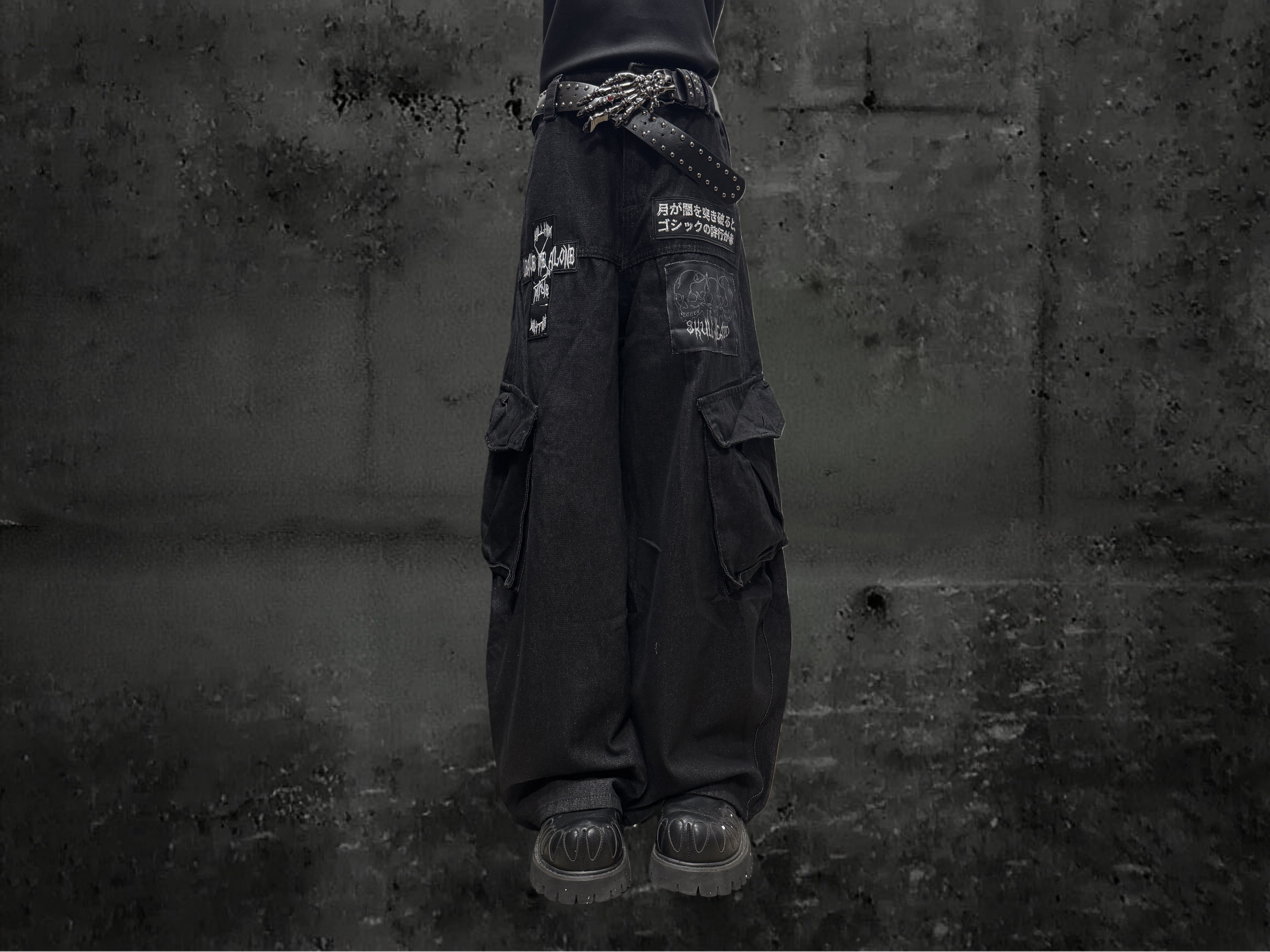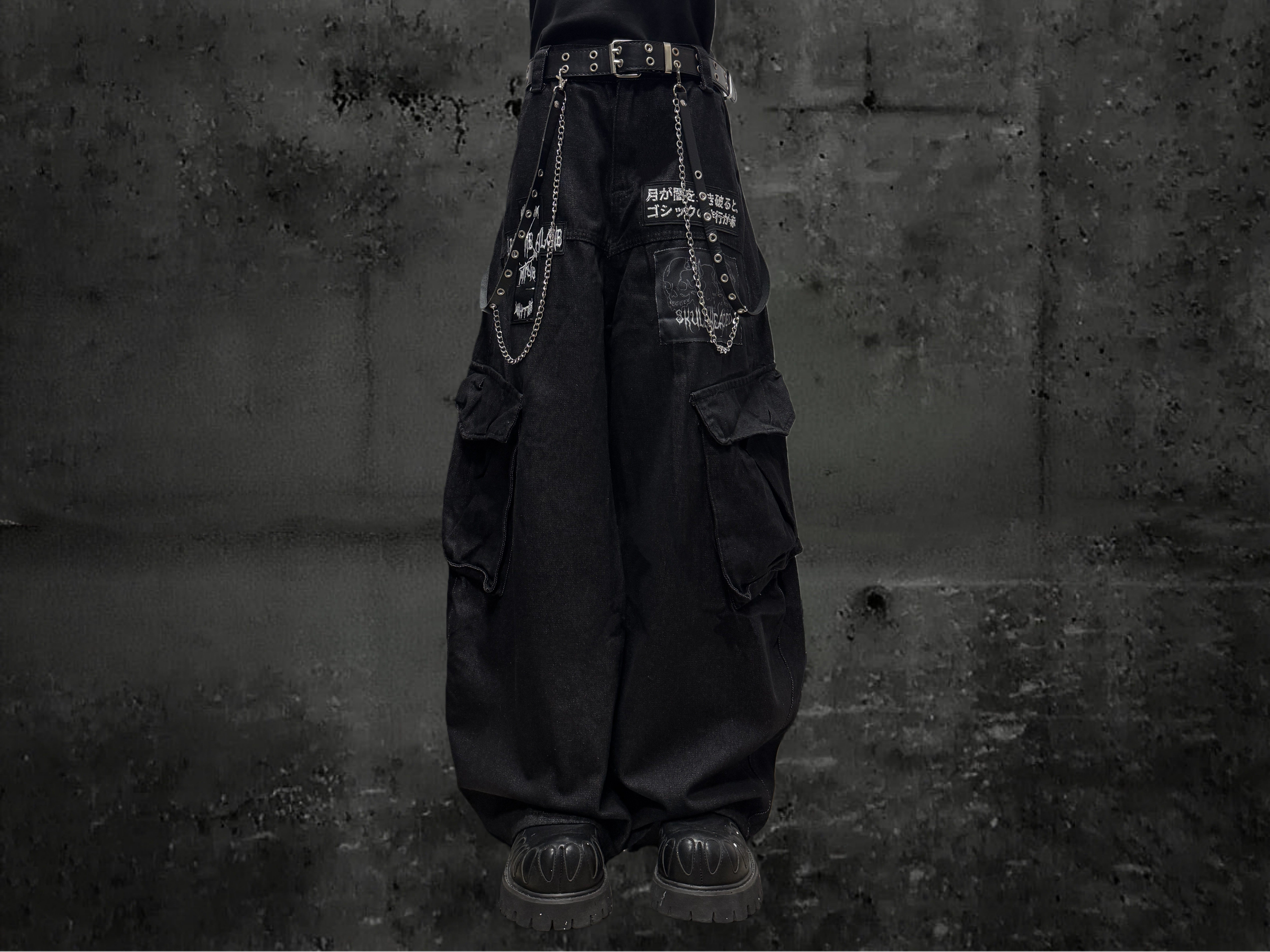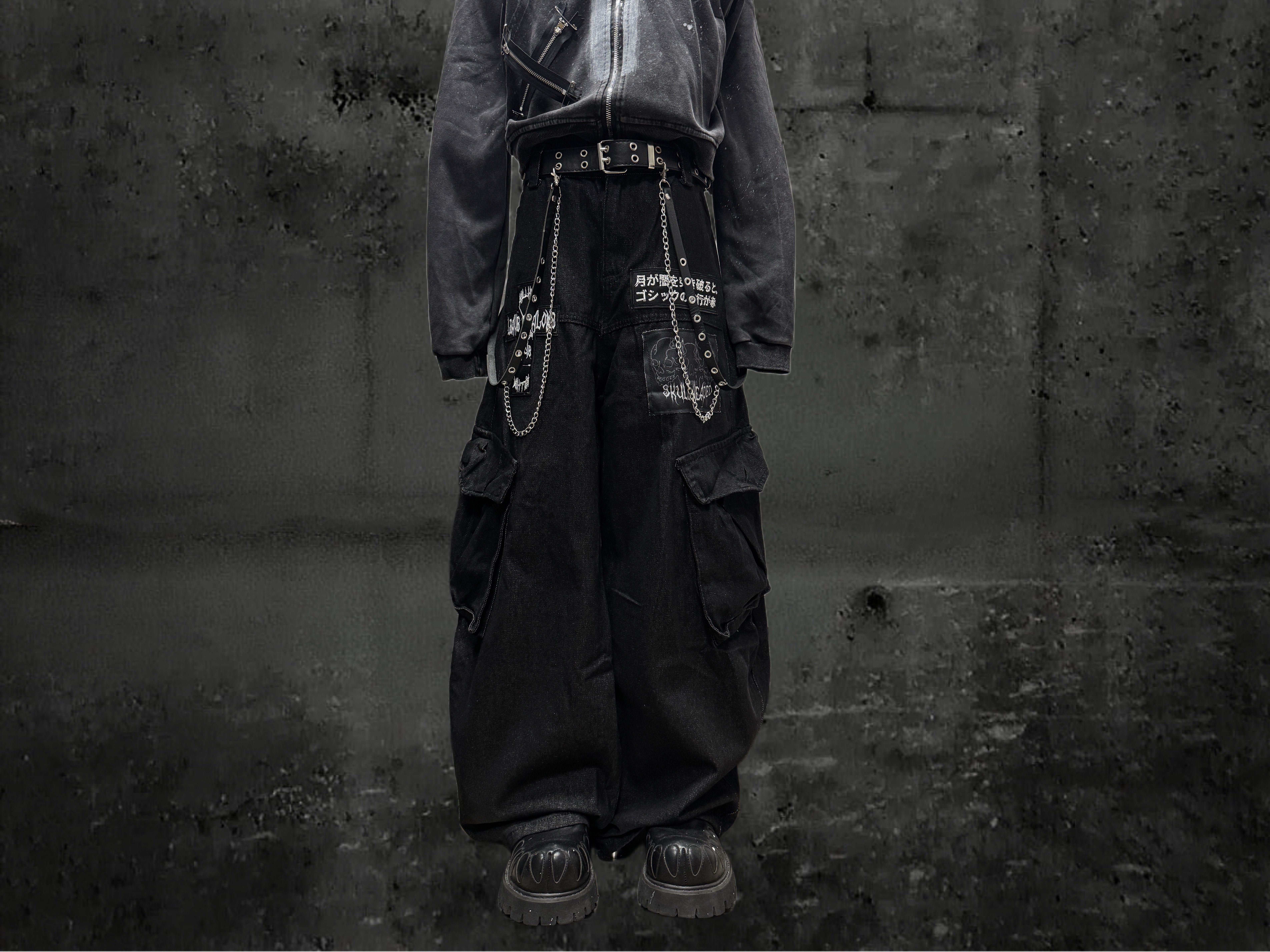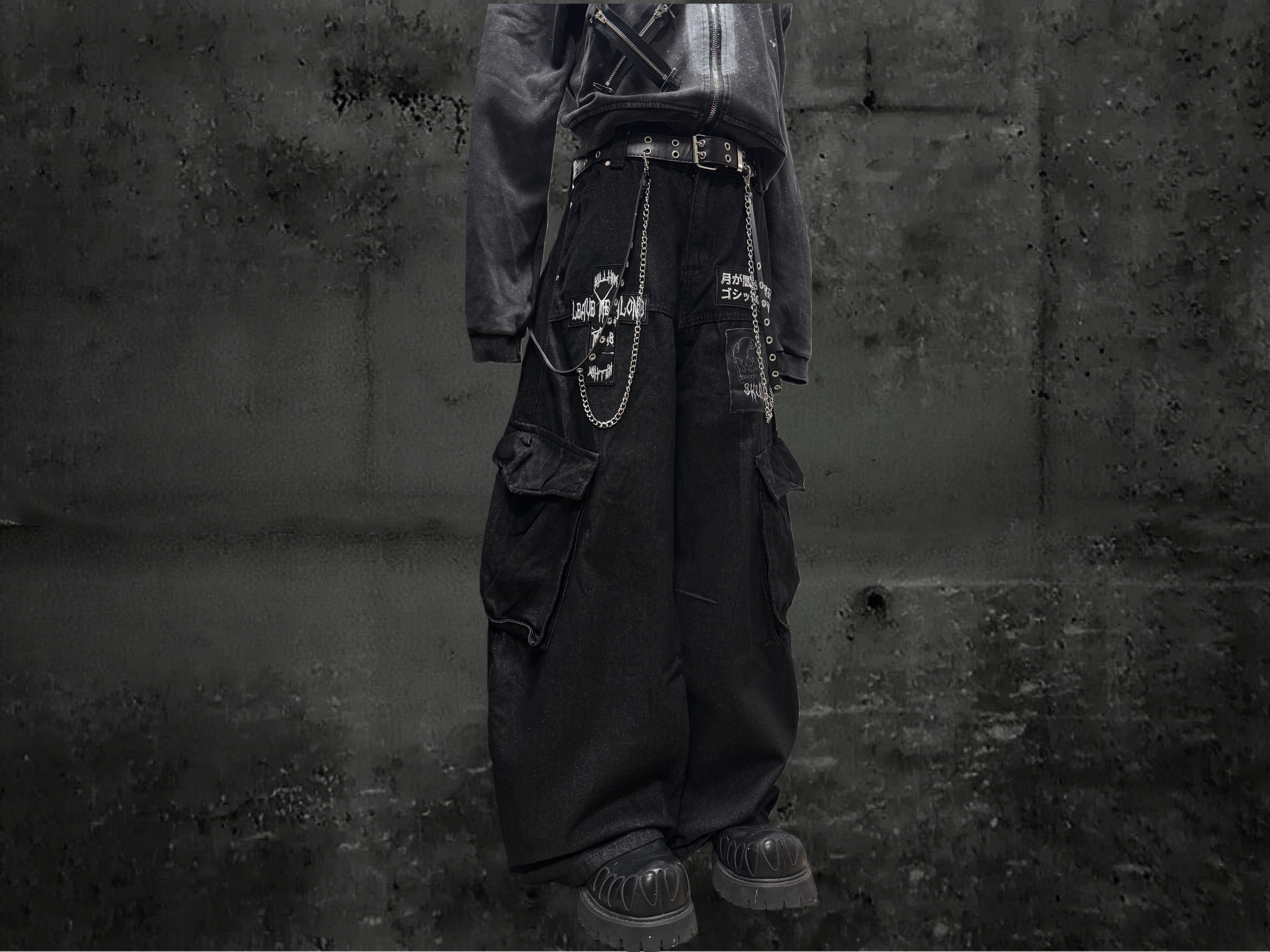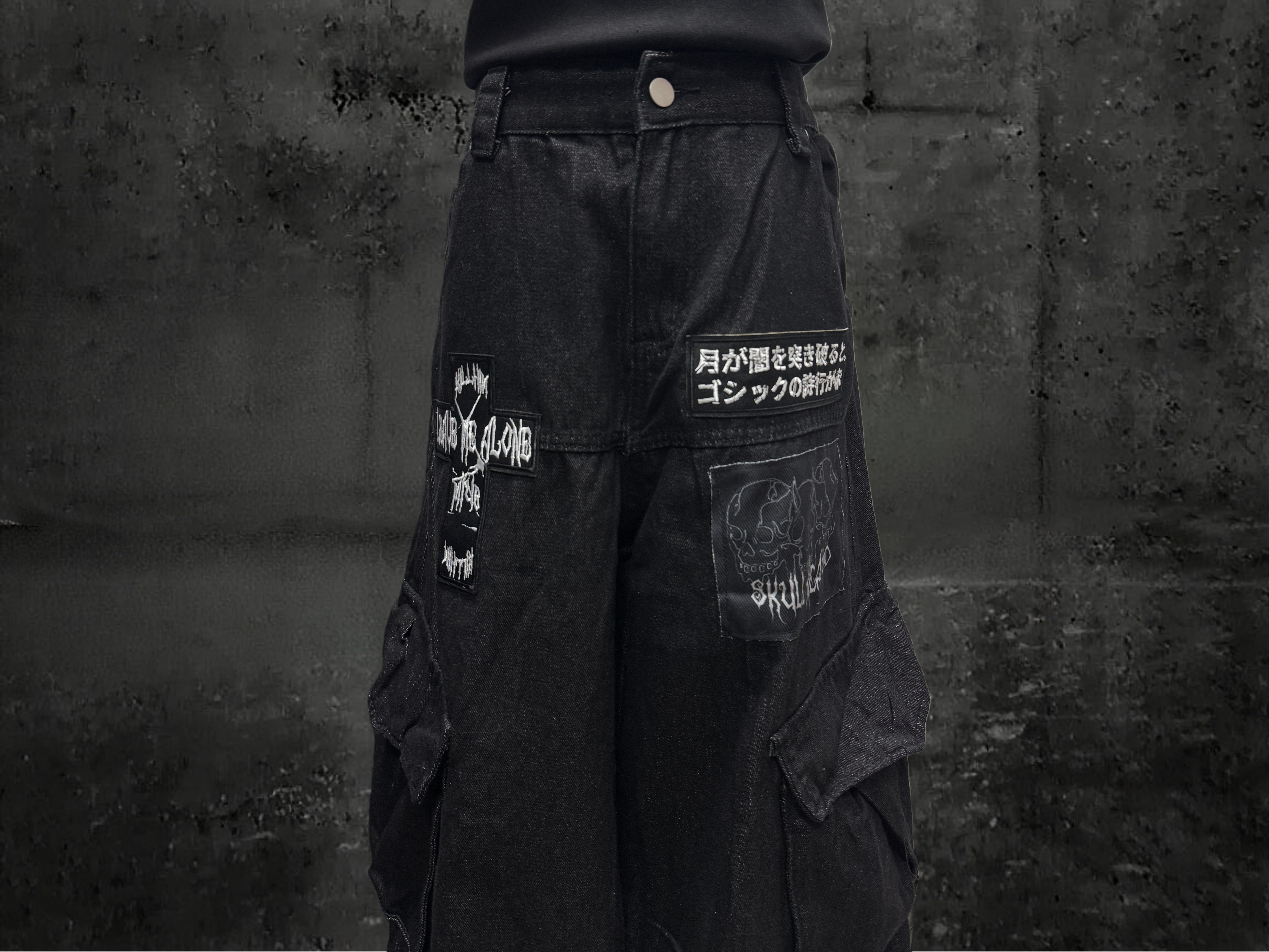 Miub美式复古暗黑工装口袋牛仔裤男女中性废土风皱褶贴布阔腿长裤 [Original Page Link]