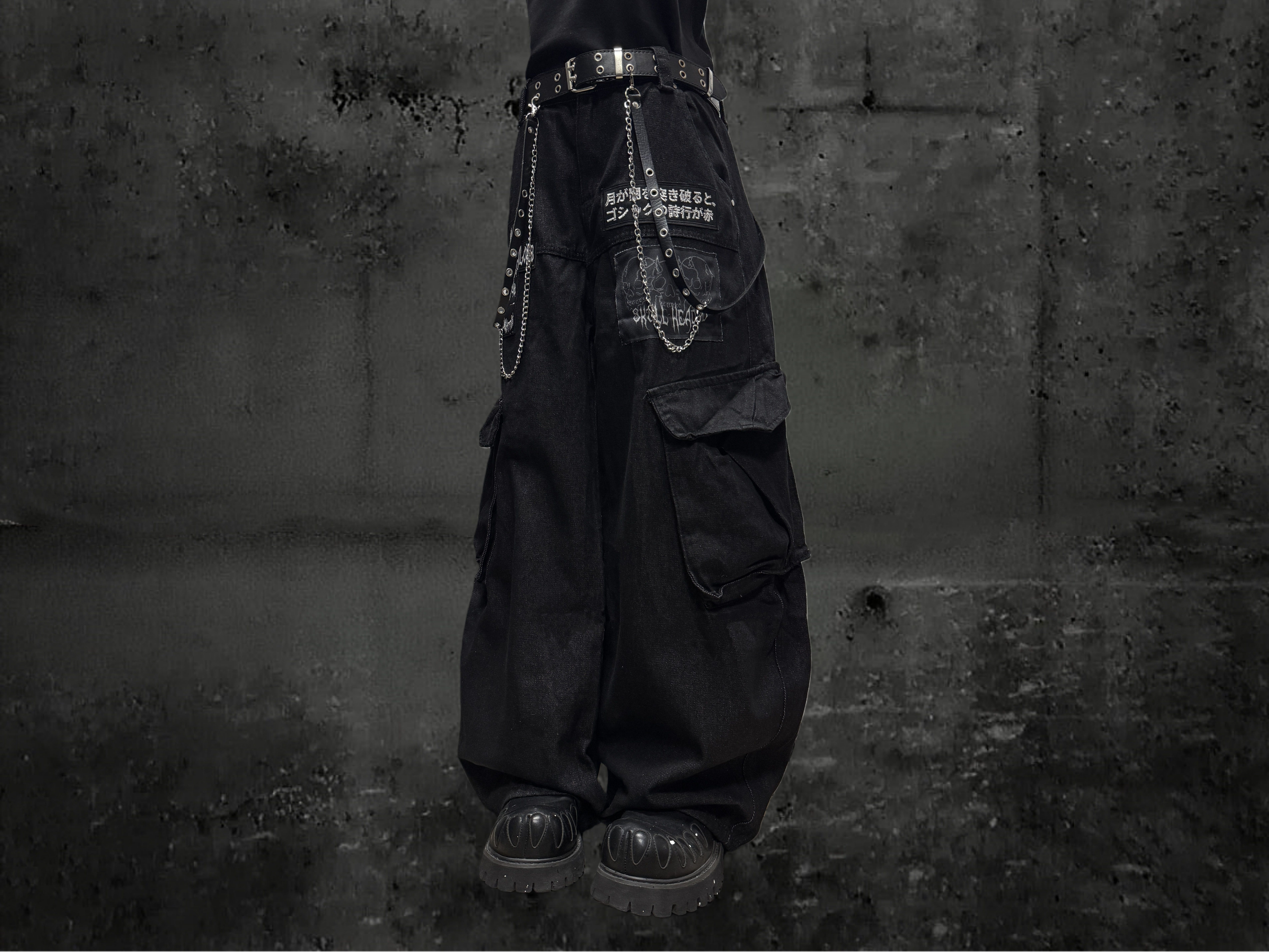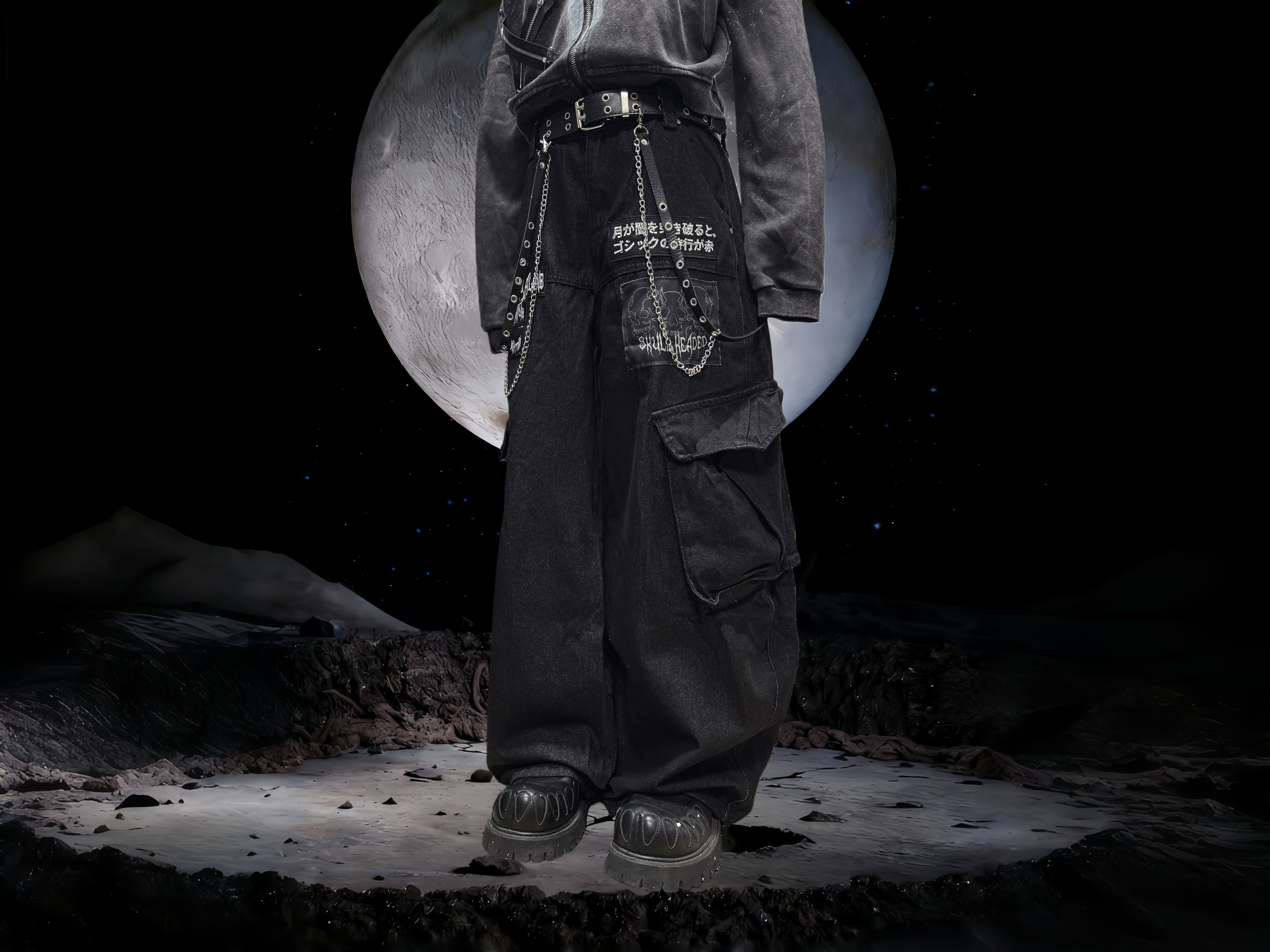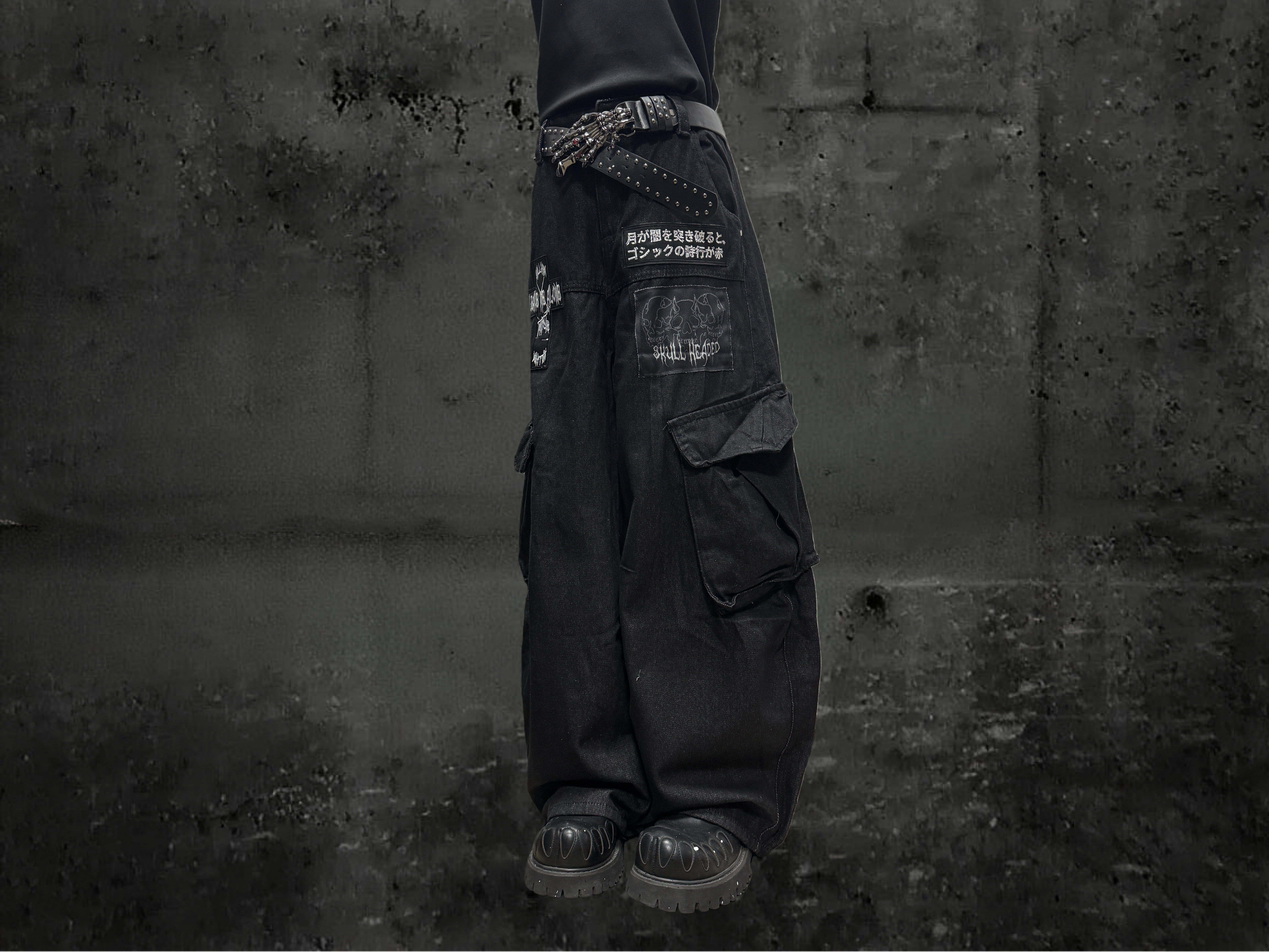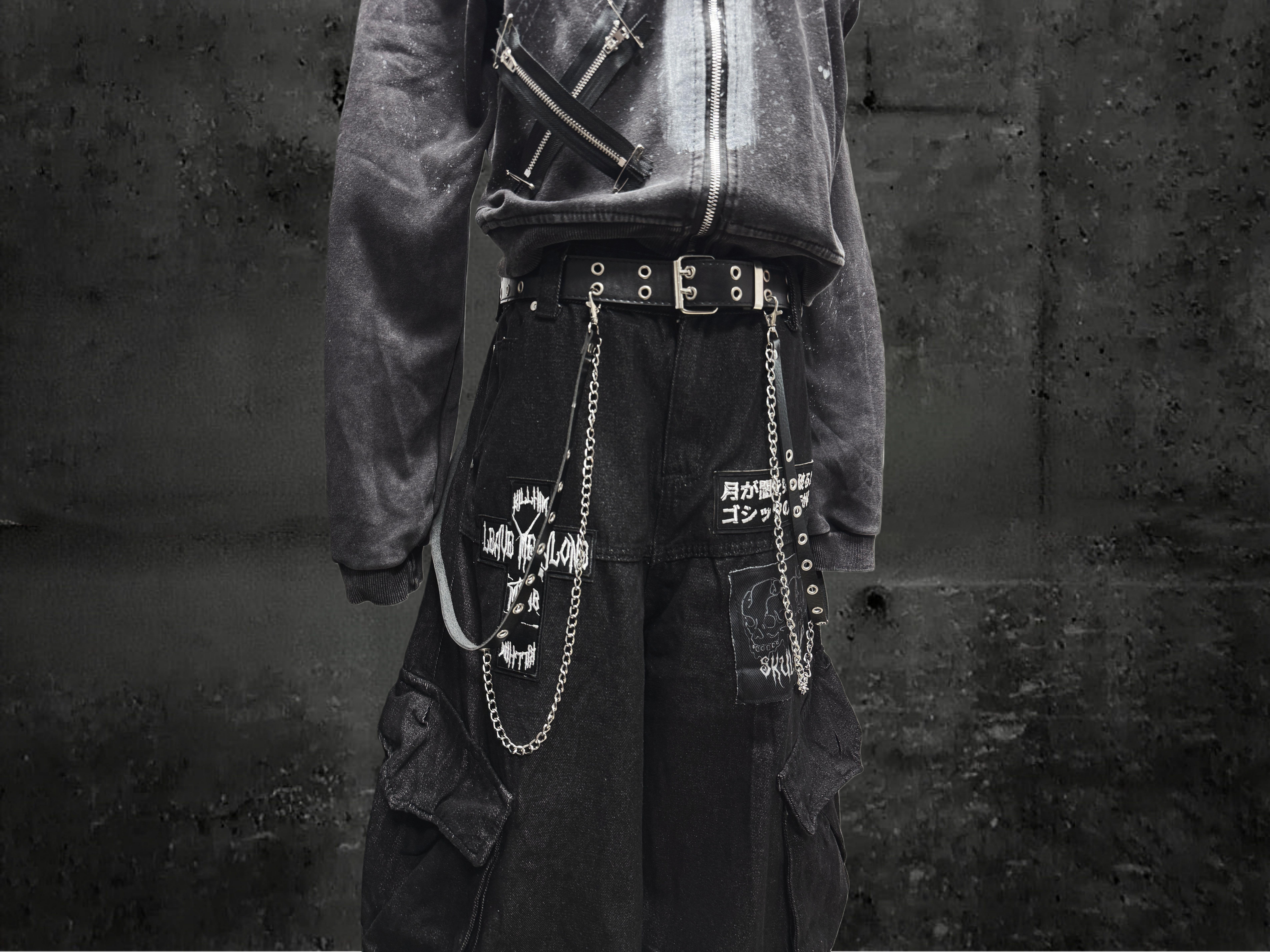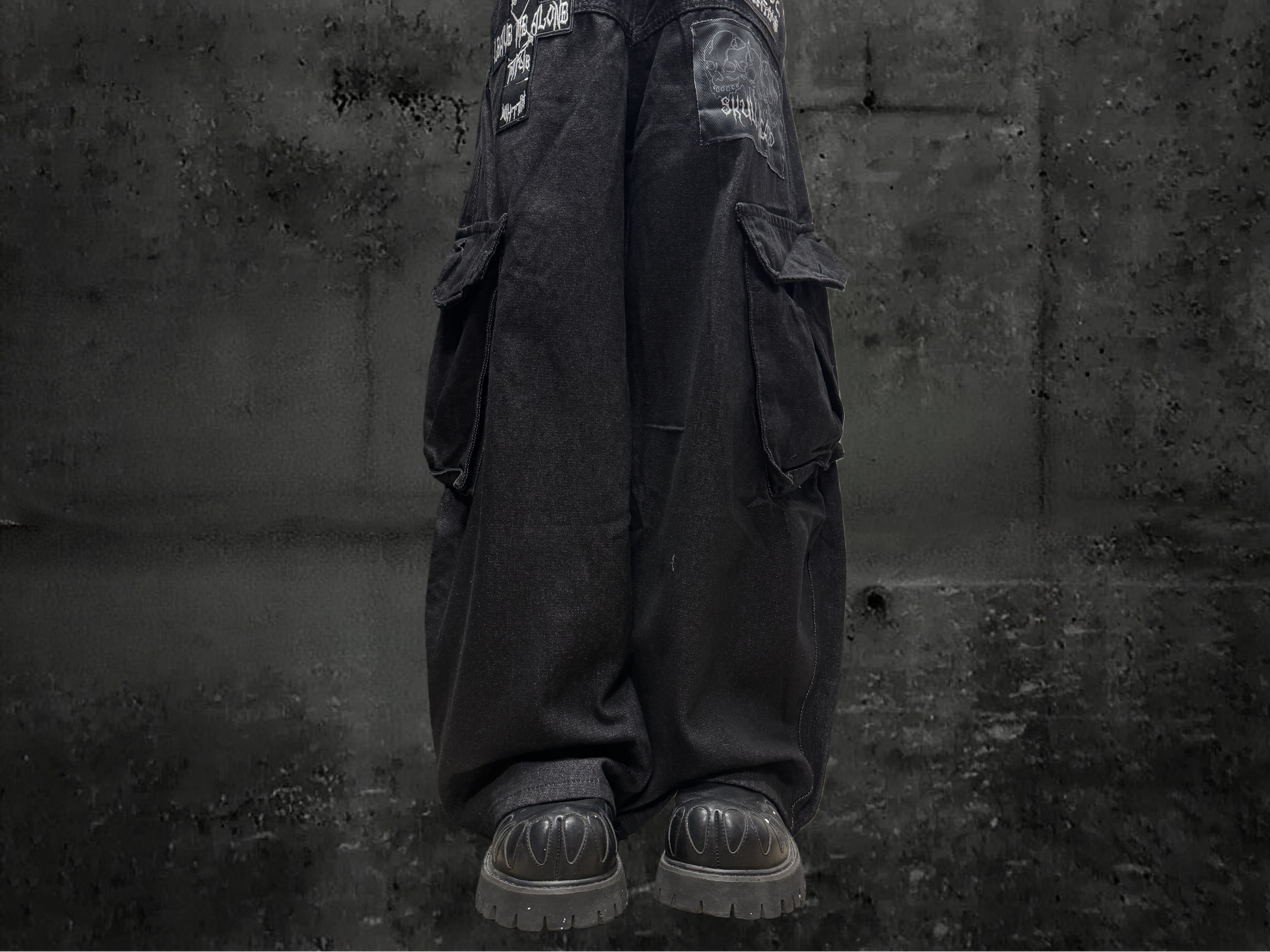 Miub美式复古暗黑工装口袋牛仔裤男女中性废土风皱褶贴布阔腿长裤 [Original Page Link]