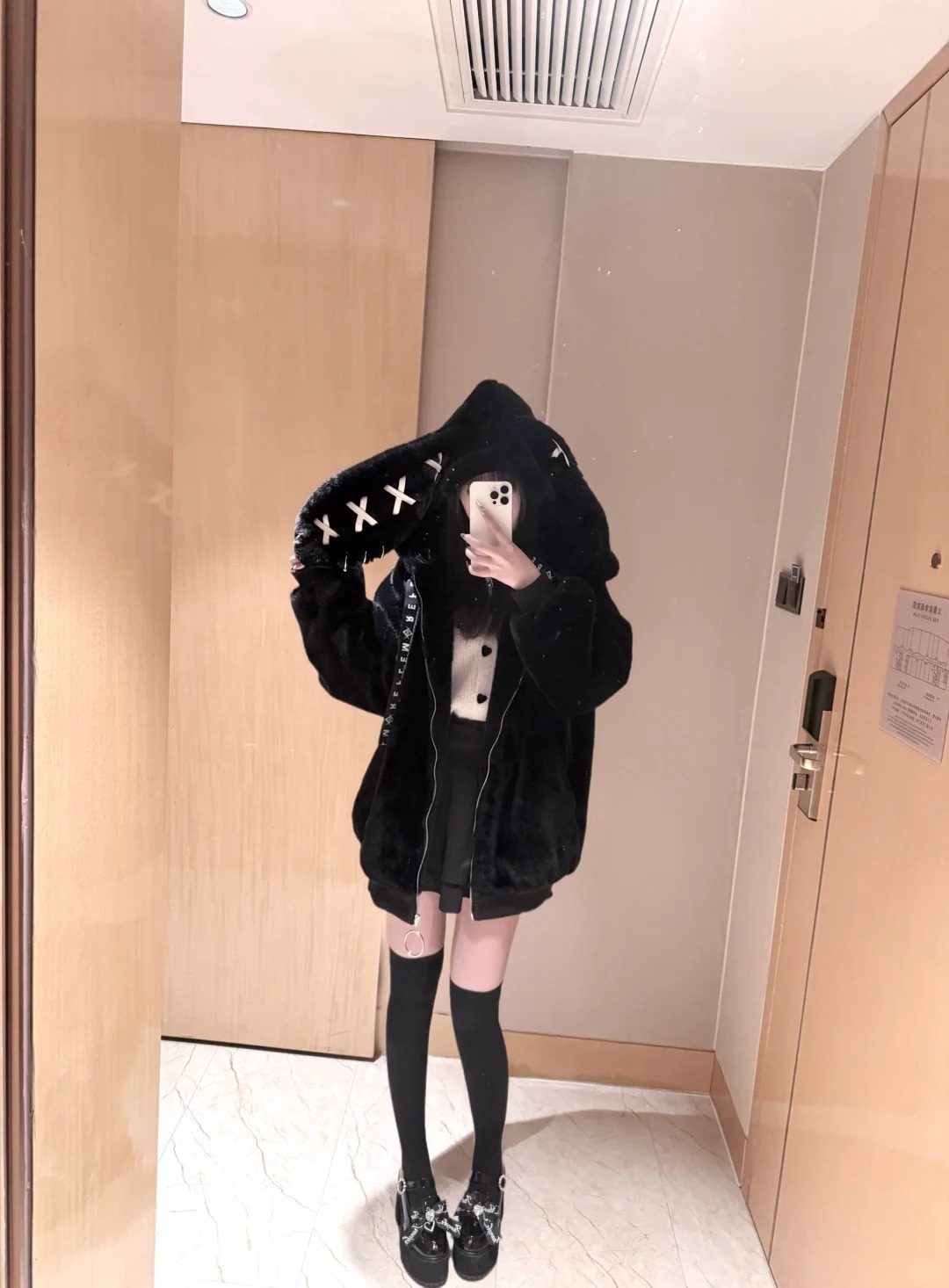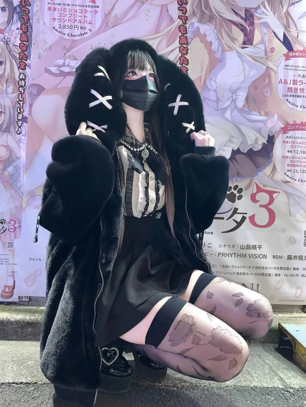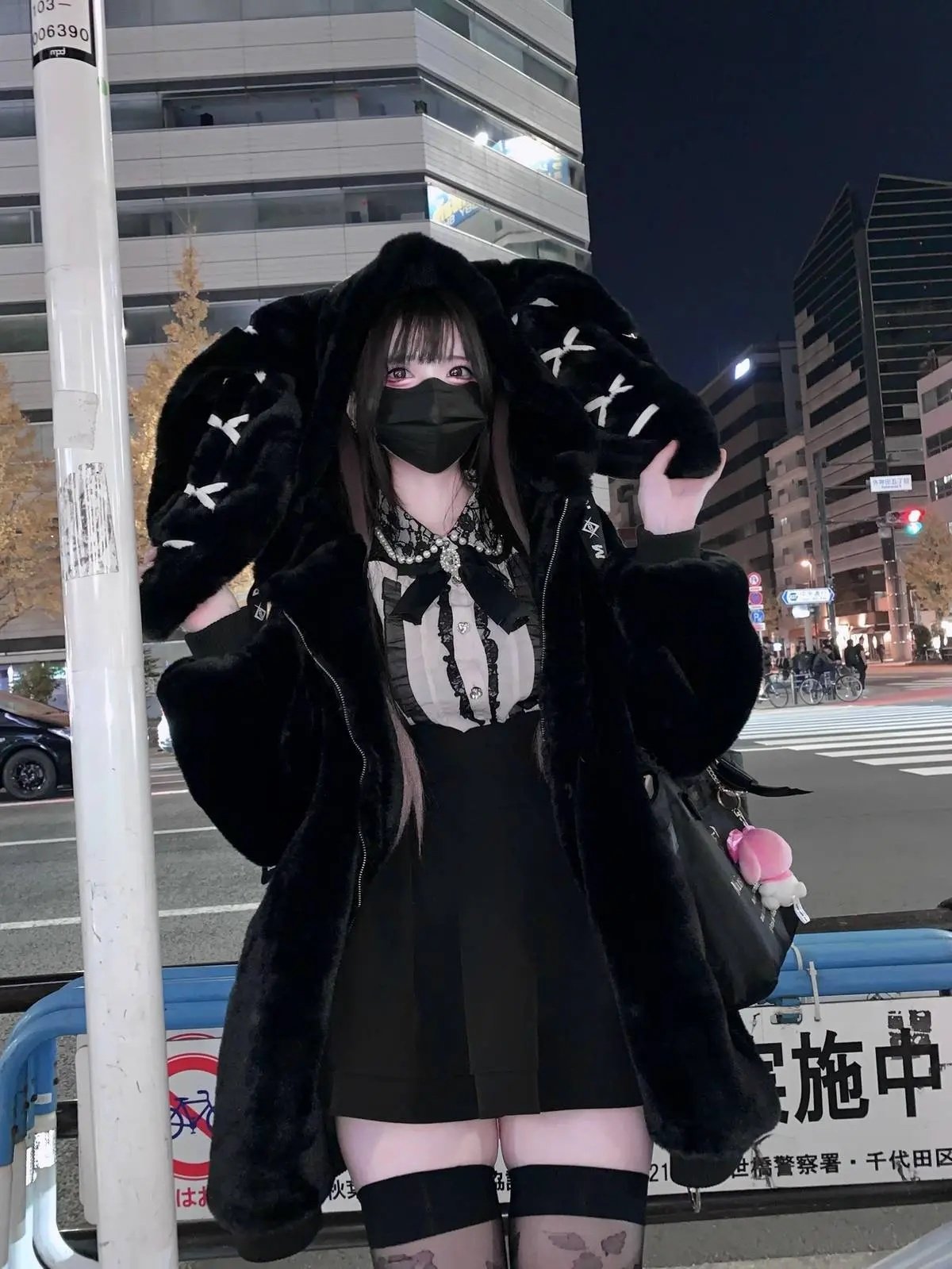 Women's 2025 New Style Japanese Harajuku Rabbit Ear Dark Punk Fur Mid-Length Coat