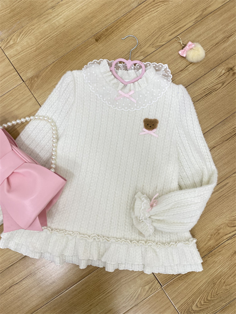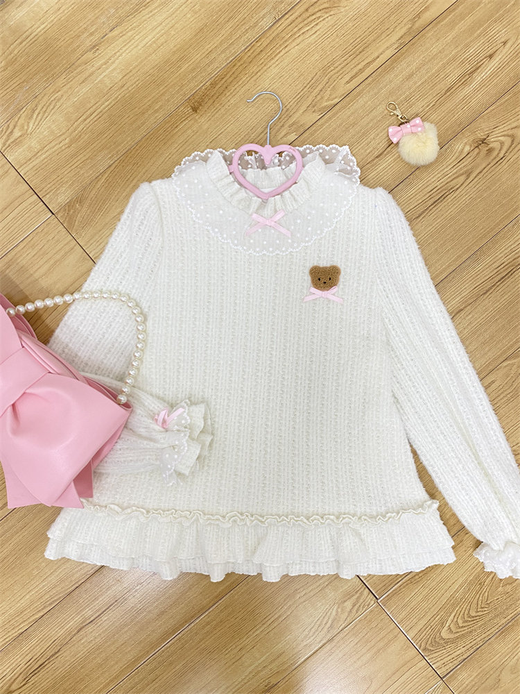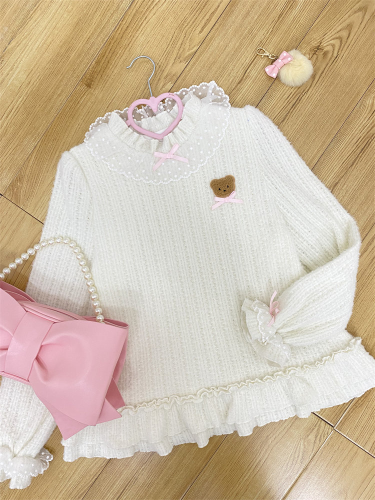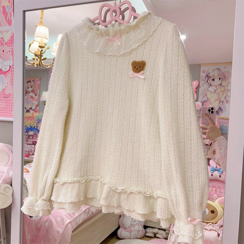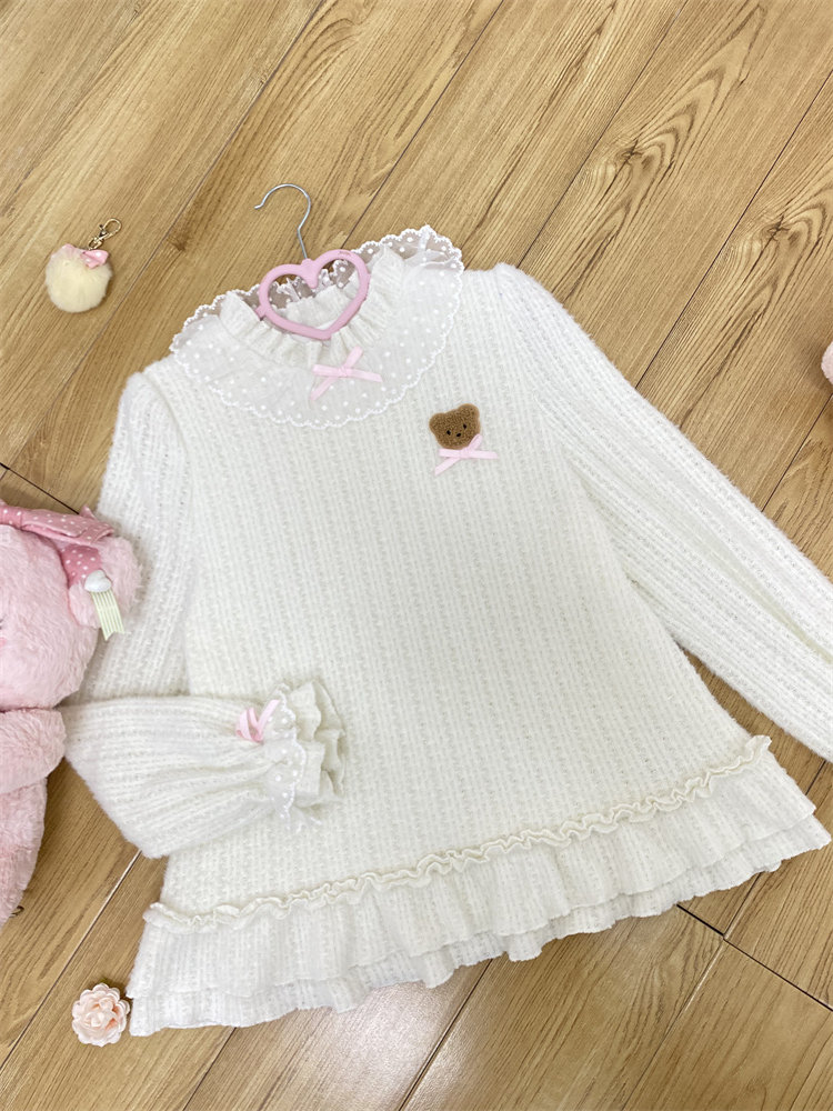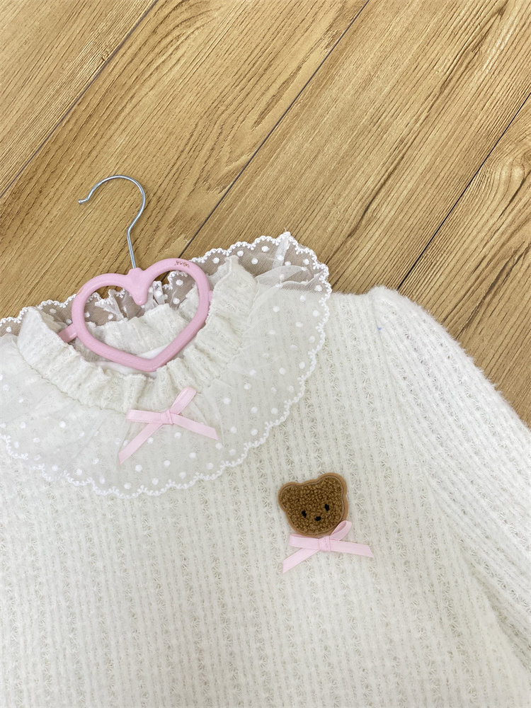 【To Alice】熊之原创小熊针织加绒打底衫女秋冬学院风蕾丝边显瘦 [Original Page Link]