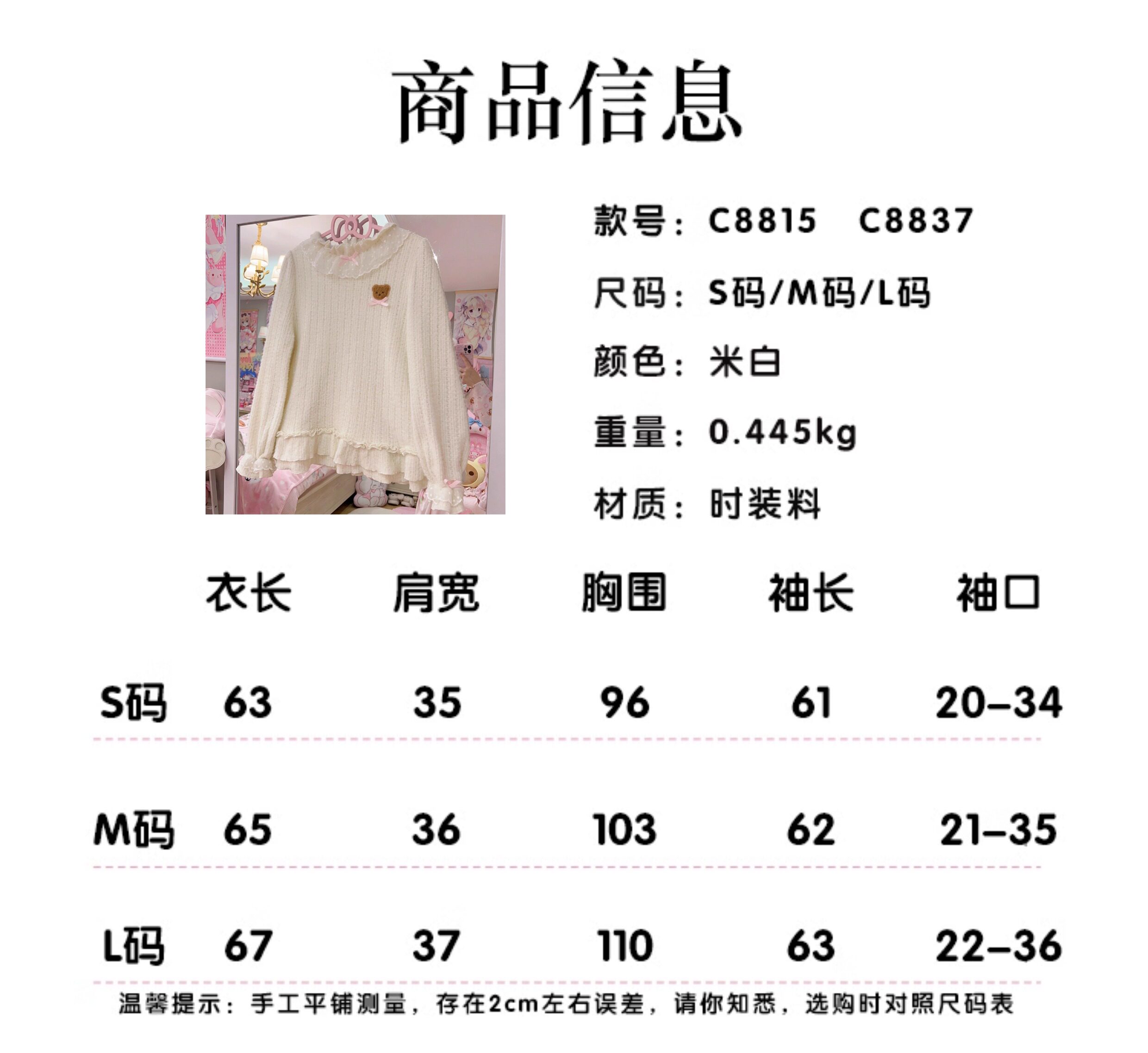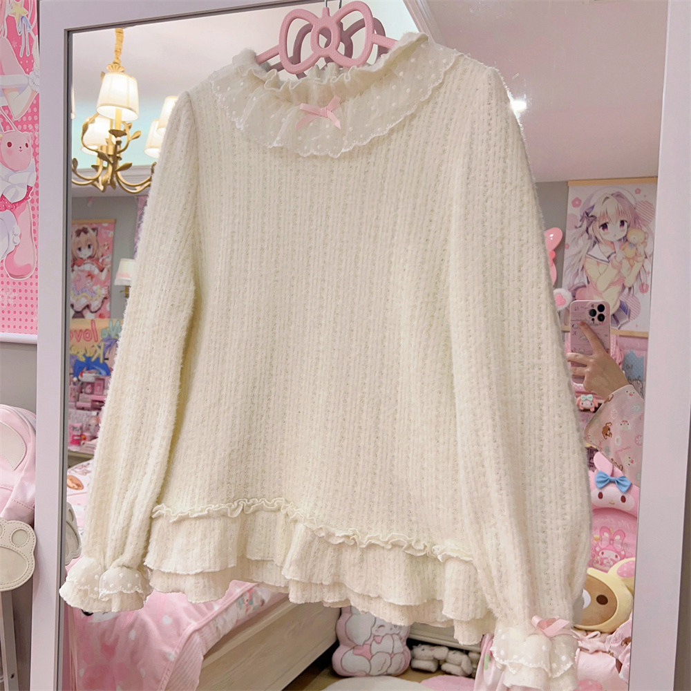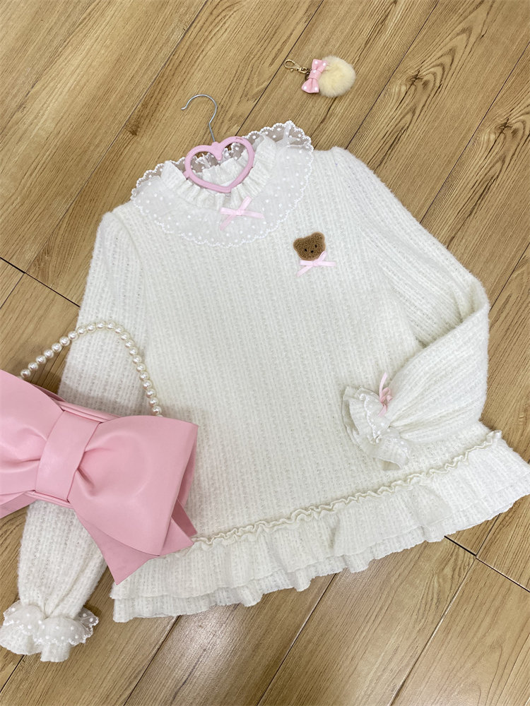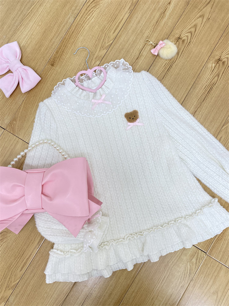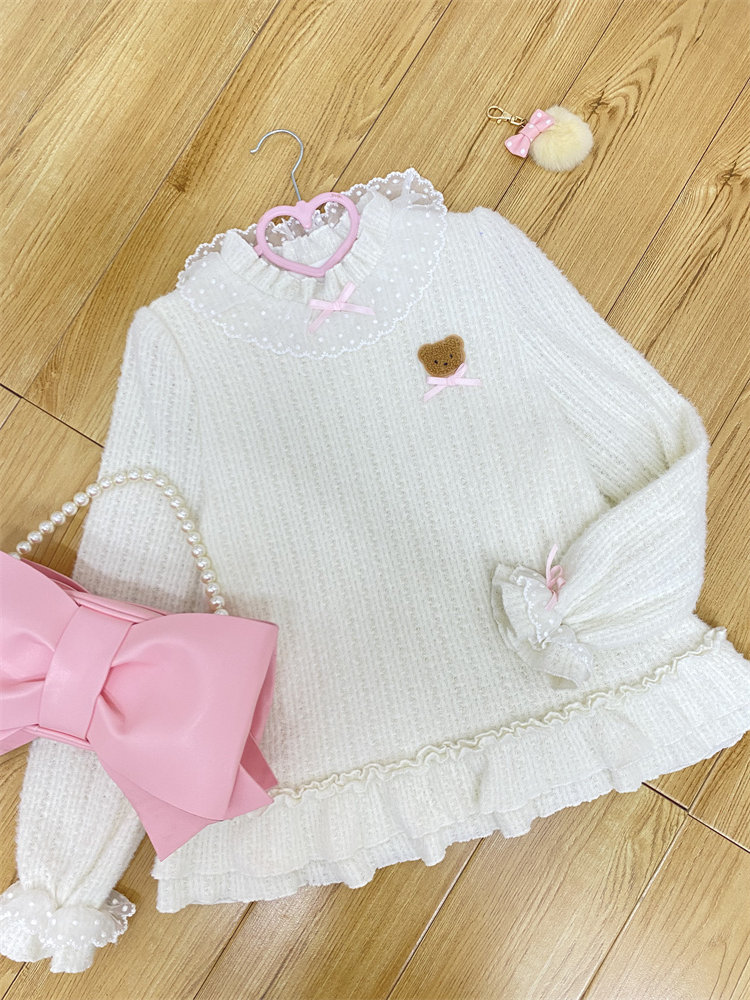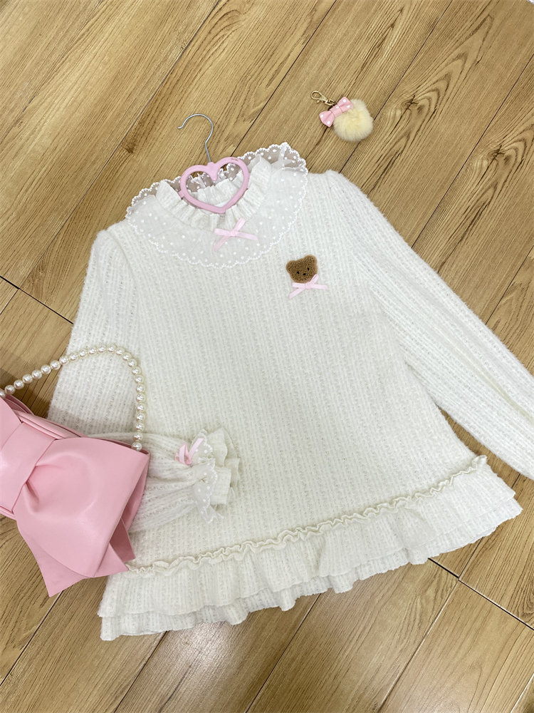 【To Alice】熊之原创小熊针织加绒打底衫女秋冬学院风蕾丝边显瘦 [Original Page Link]
