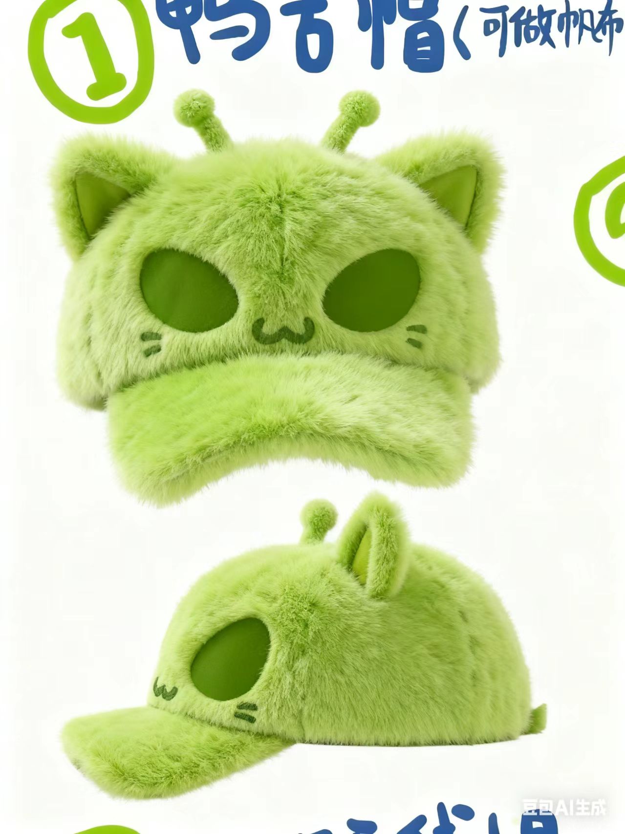 小红书爆款外星小猫鸭舌帽毛绒帽冬季保暖绿色小猫帽子 [Original Page Link]