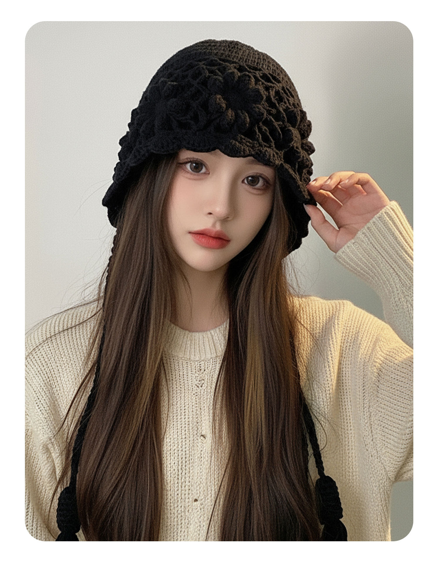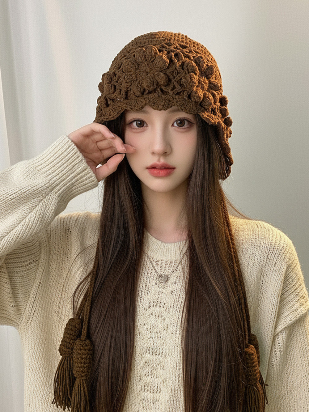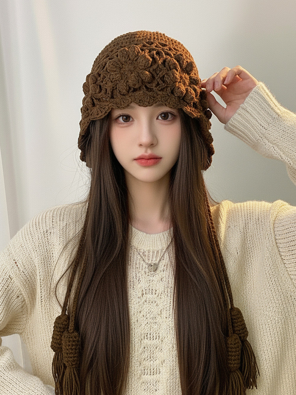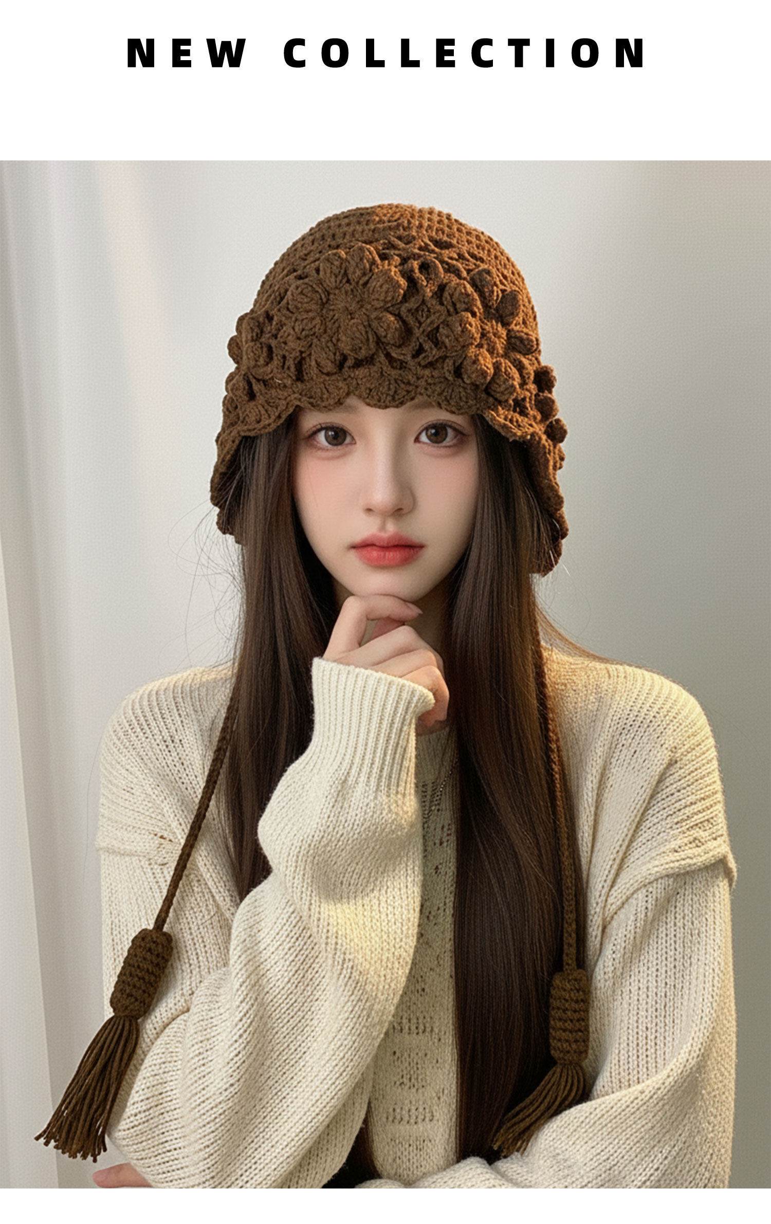 Thickened double-layer hand-crocheted floral tassel wool hat for women, perfect for autumn and winter, stylish and flattering, makes your face look smaller.