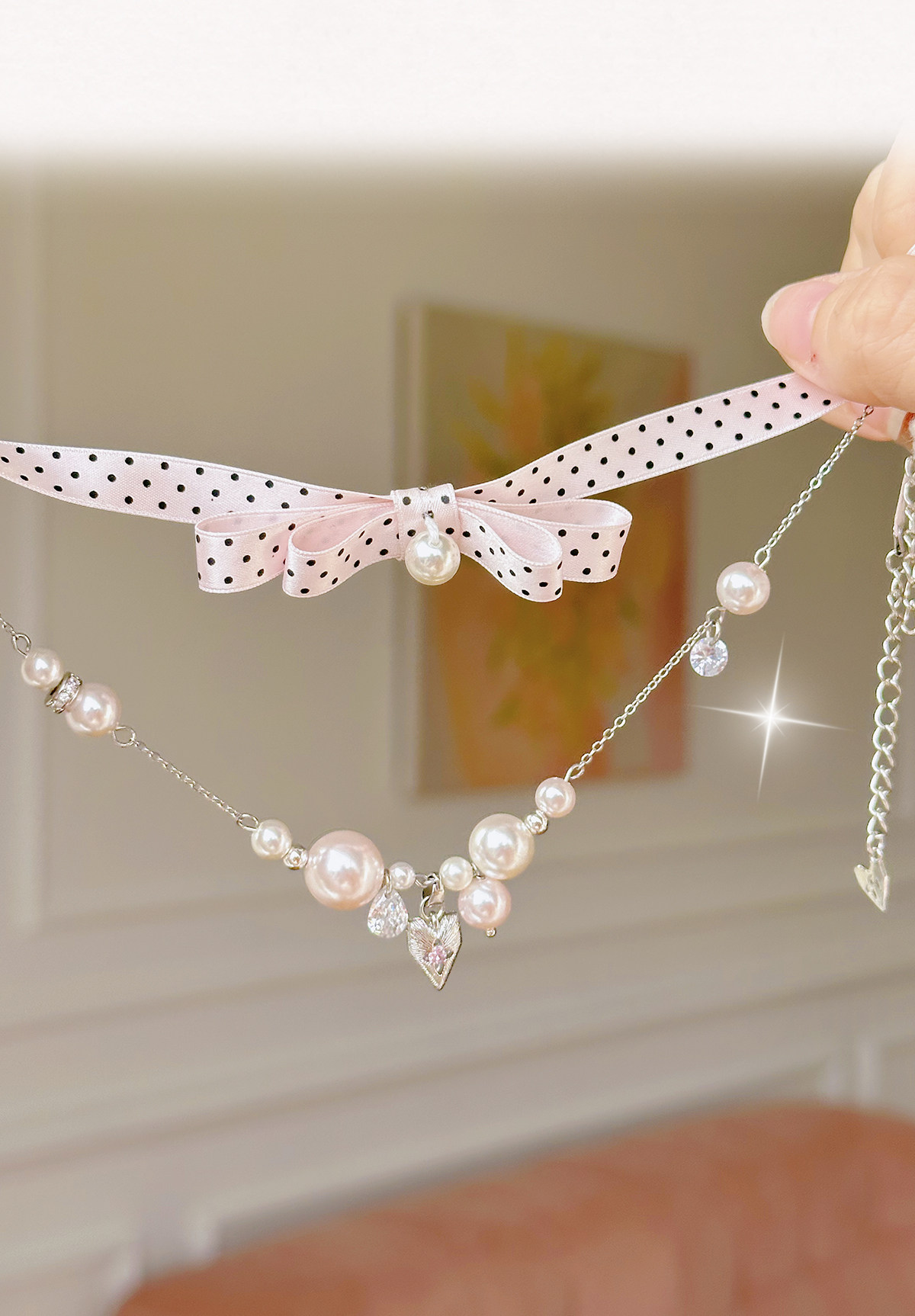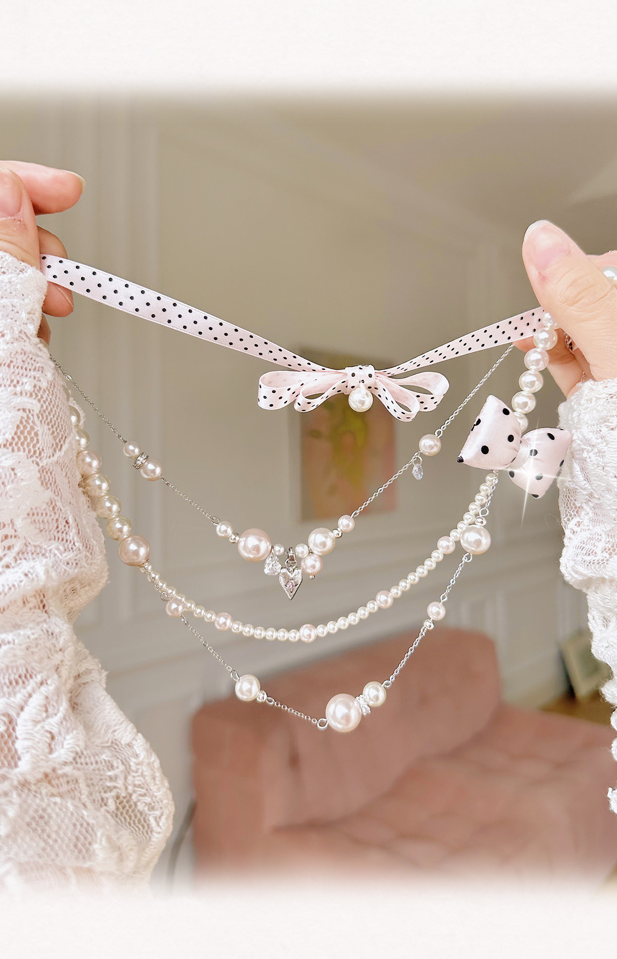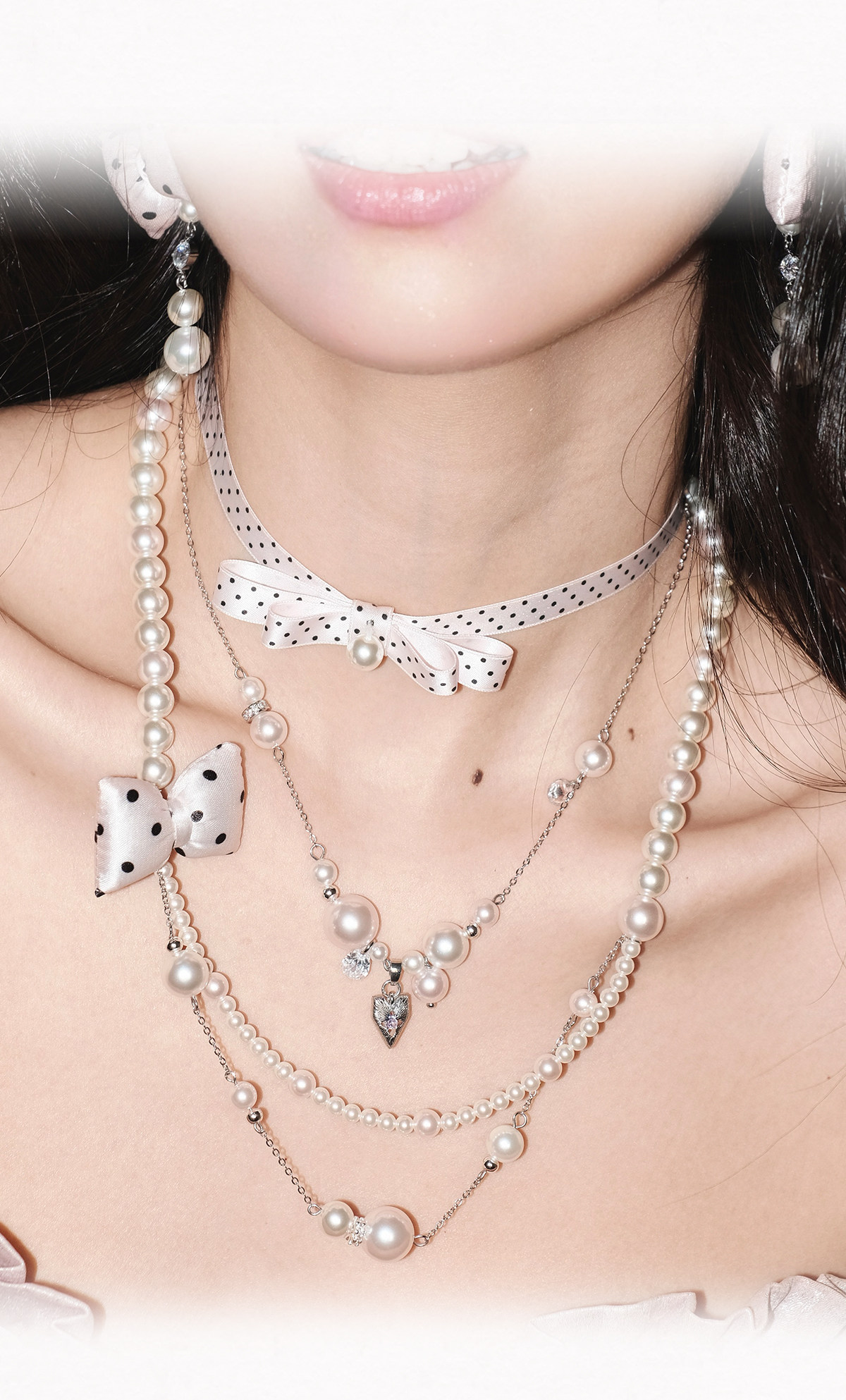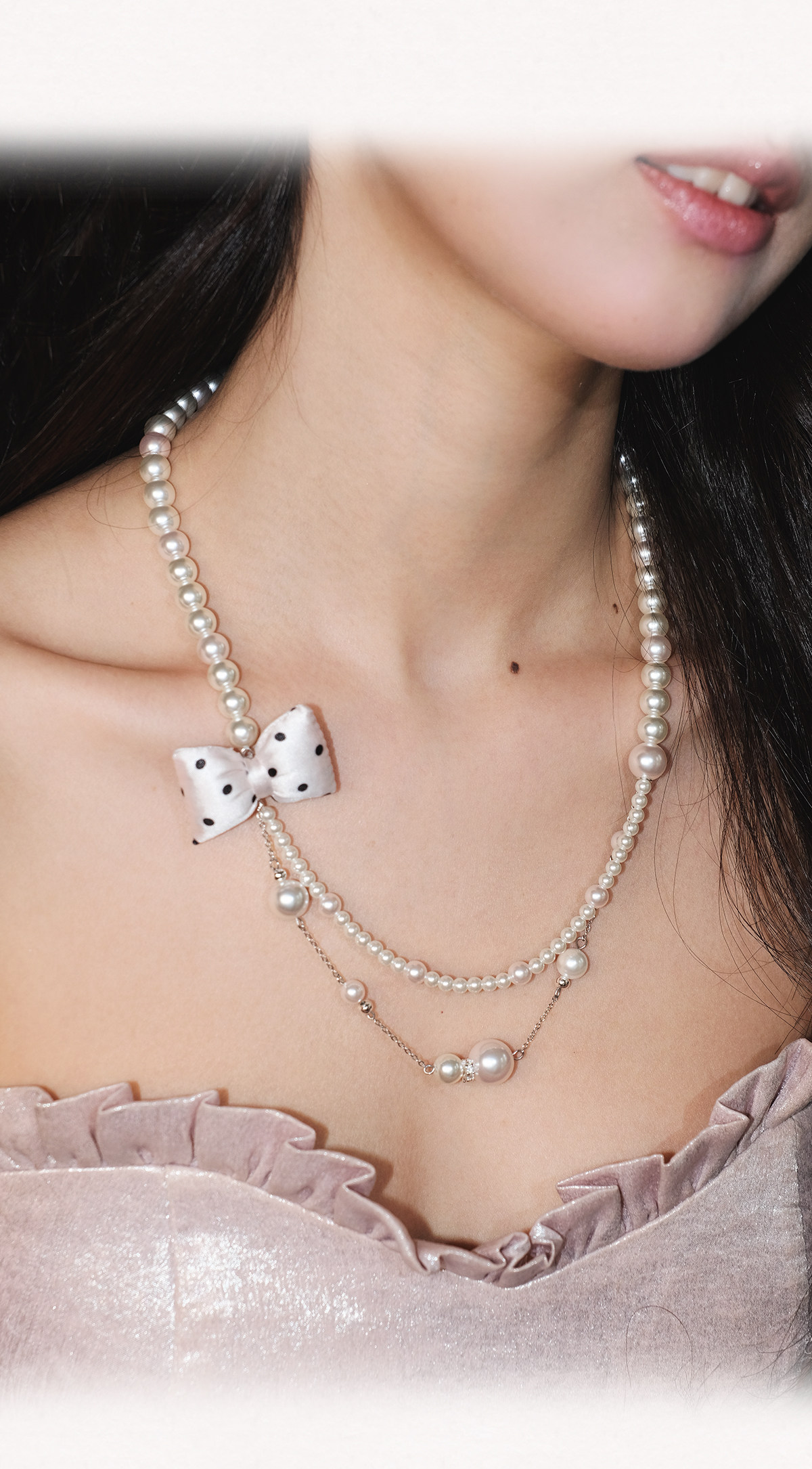 Polka dot lovers, Miu style! Original niche satin bow pearl necklace, double-layer long sweater chain.