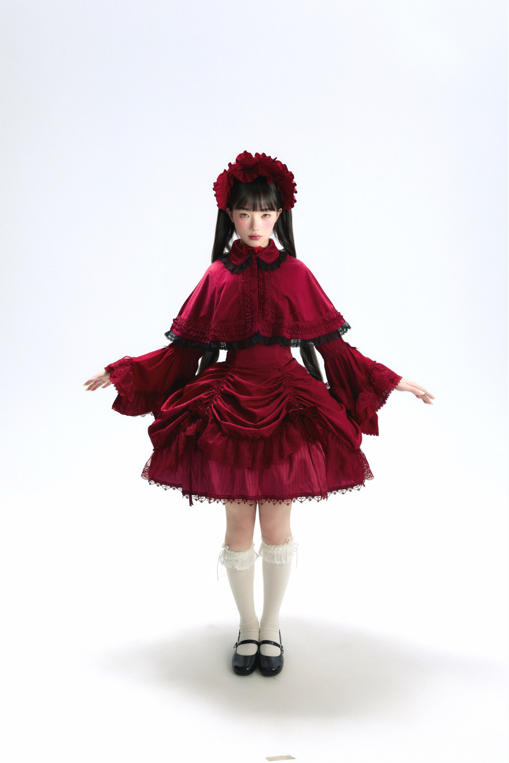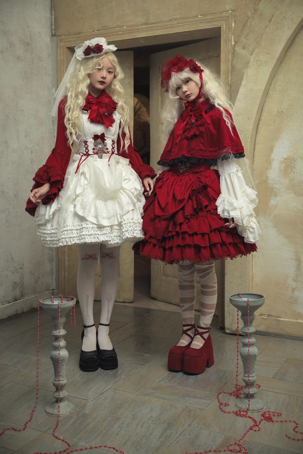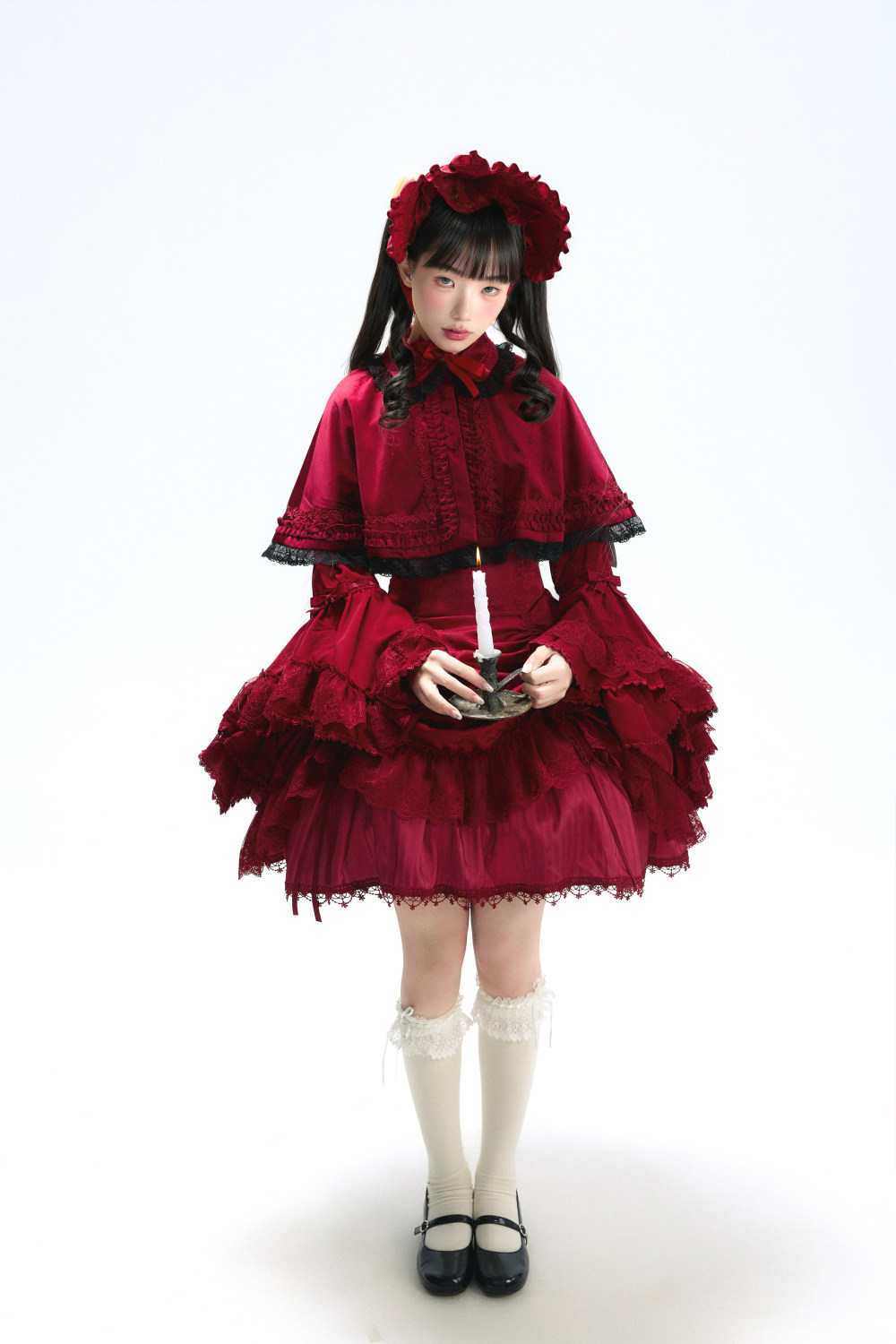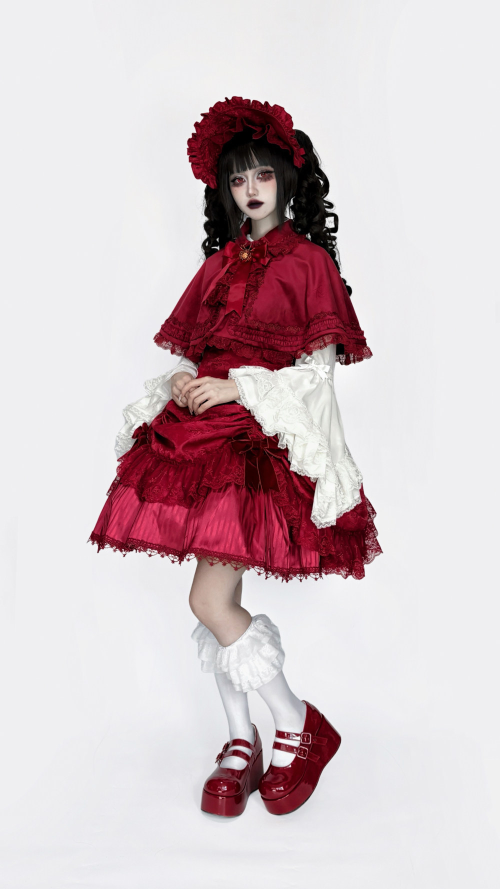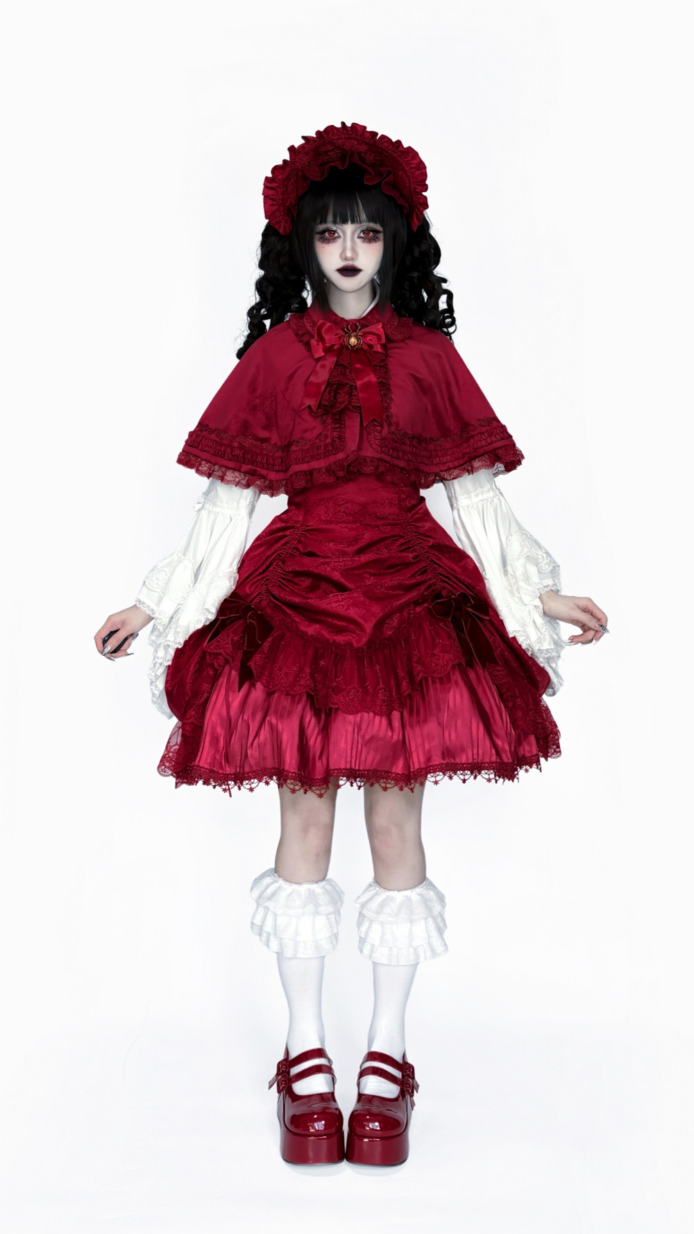 红色JSK4型 搭配红蕾丝红丝绒斗篷 黑蕾丝红丝绒斗篷 姬袖衬衫 蕾丝领结