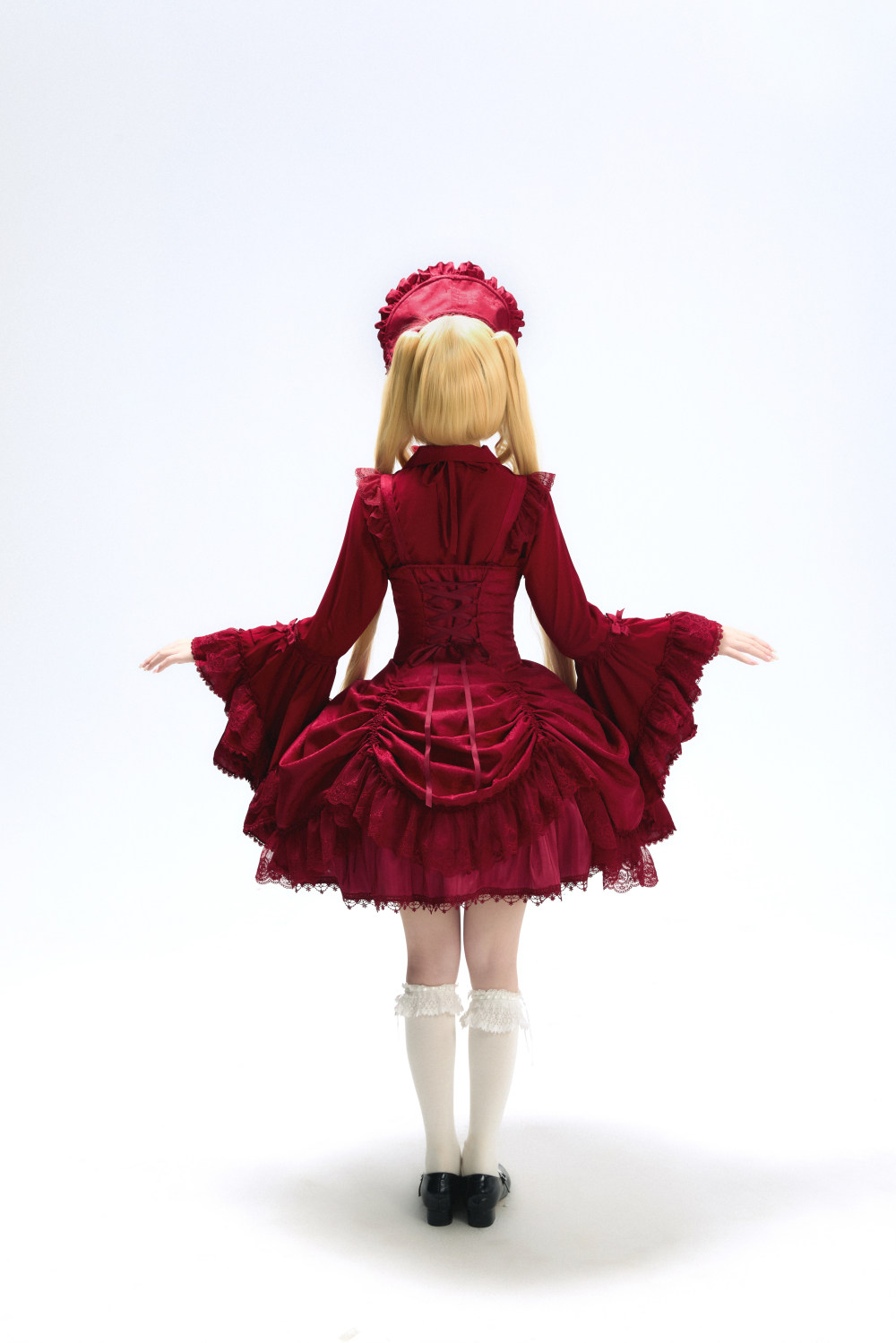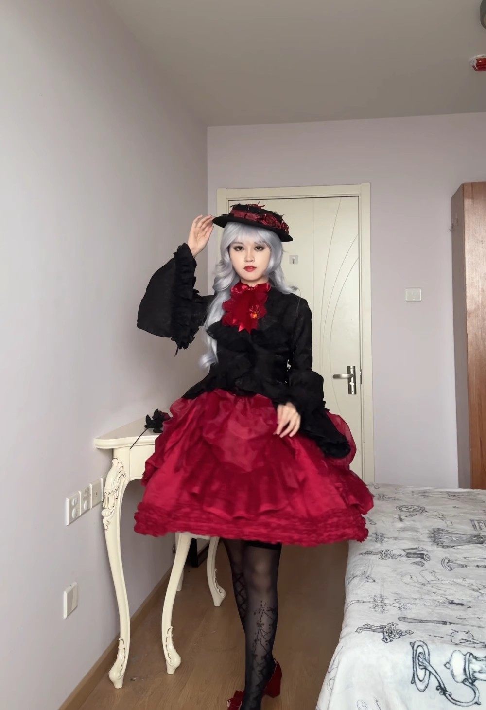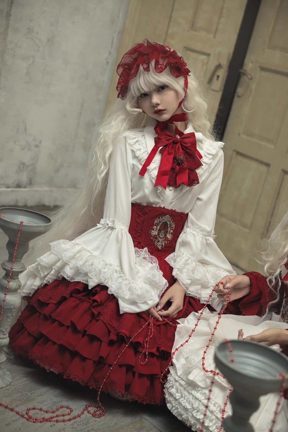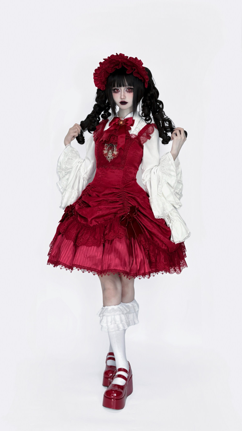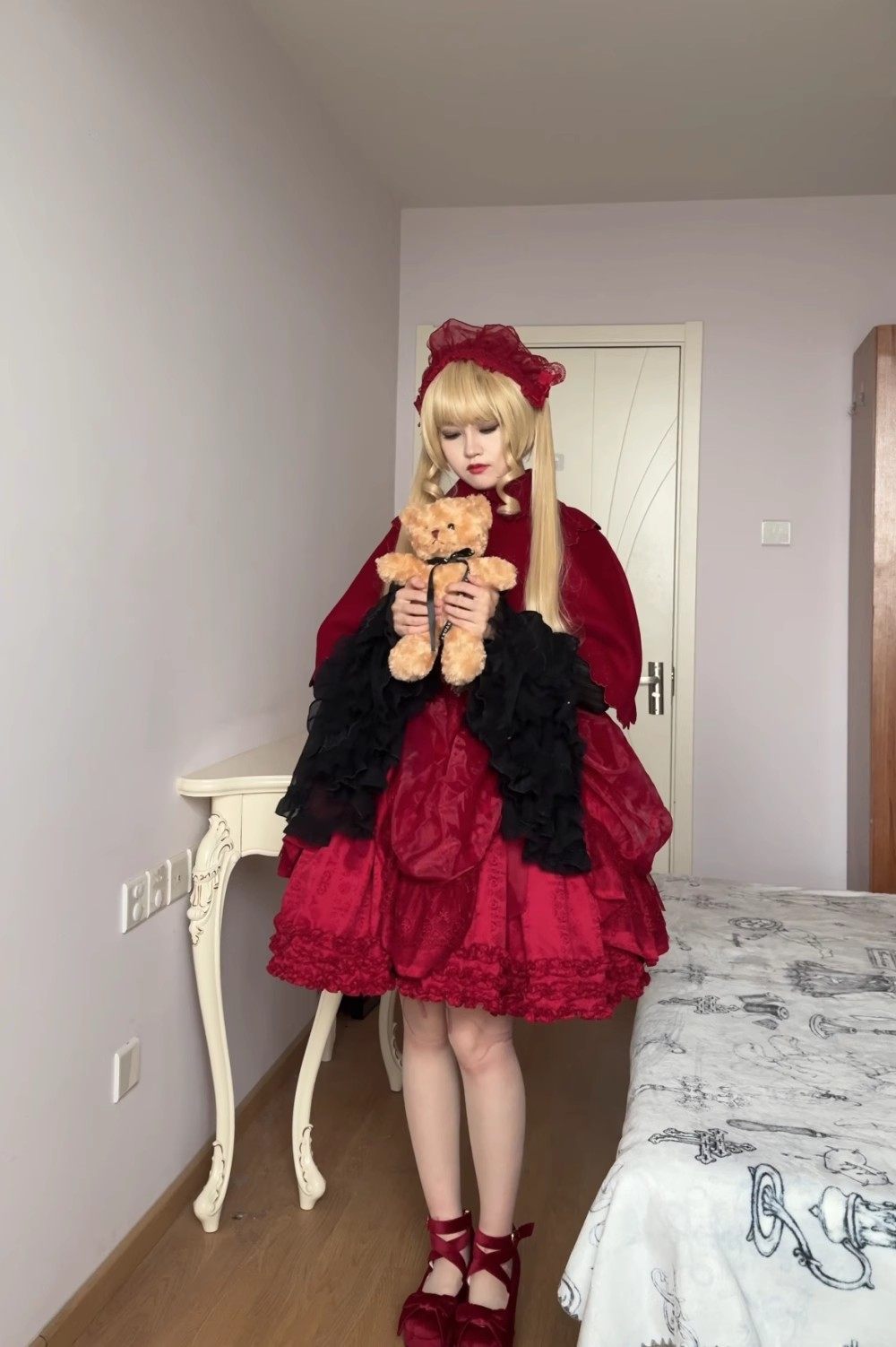 红色JSK4型 搭配红蕾丝红丝绒斗篷 黑蕾丝红丝绒斗篷 姬袖衬衫 蕾丝领结