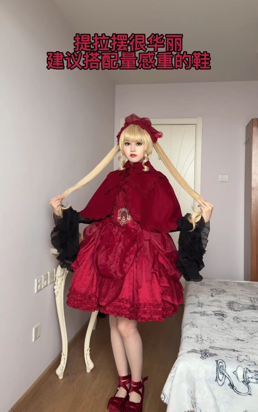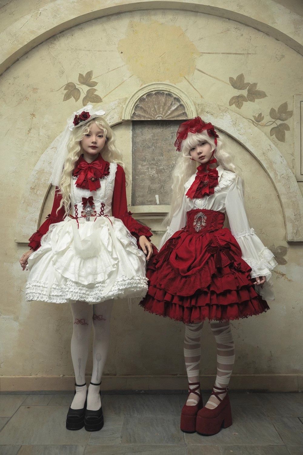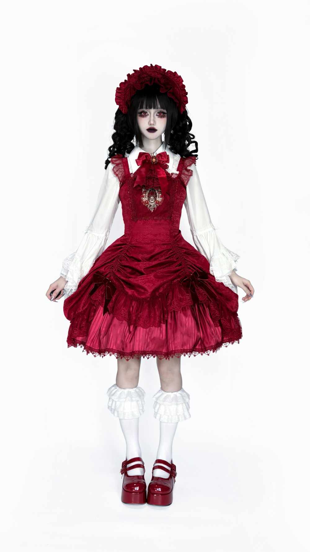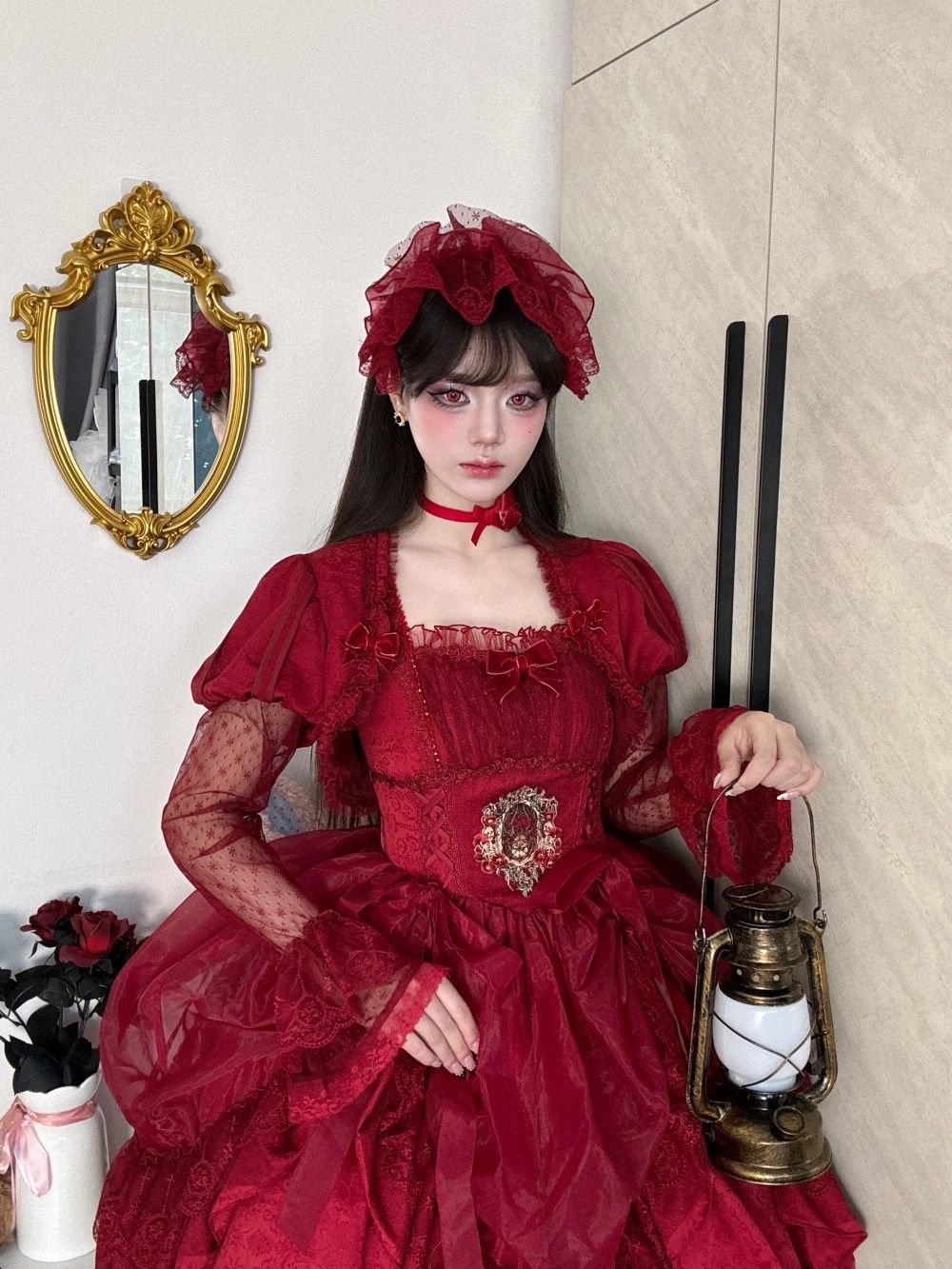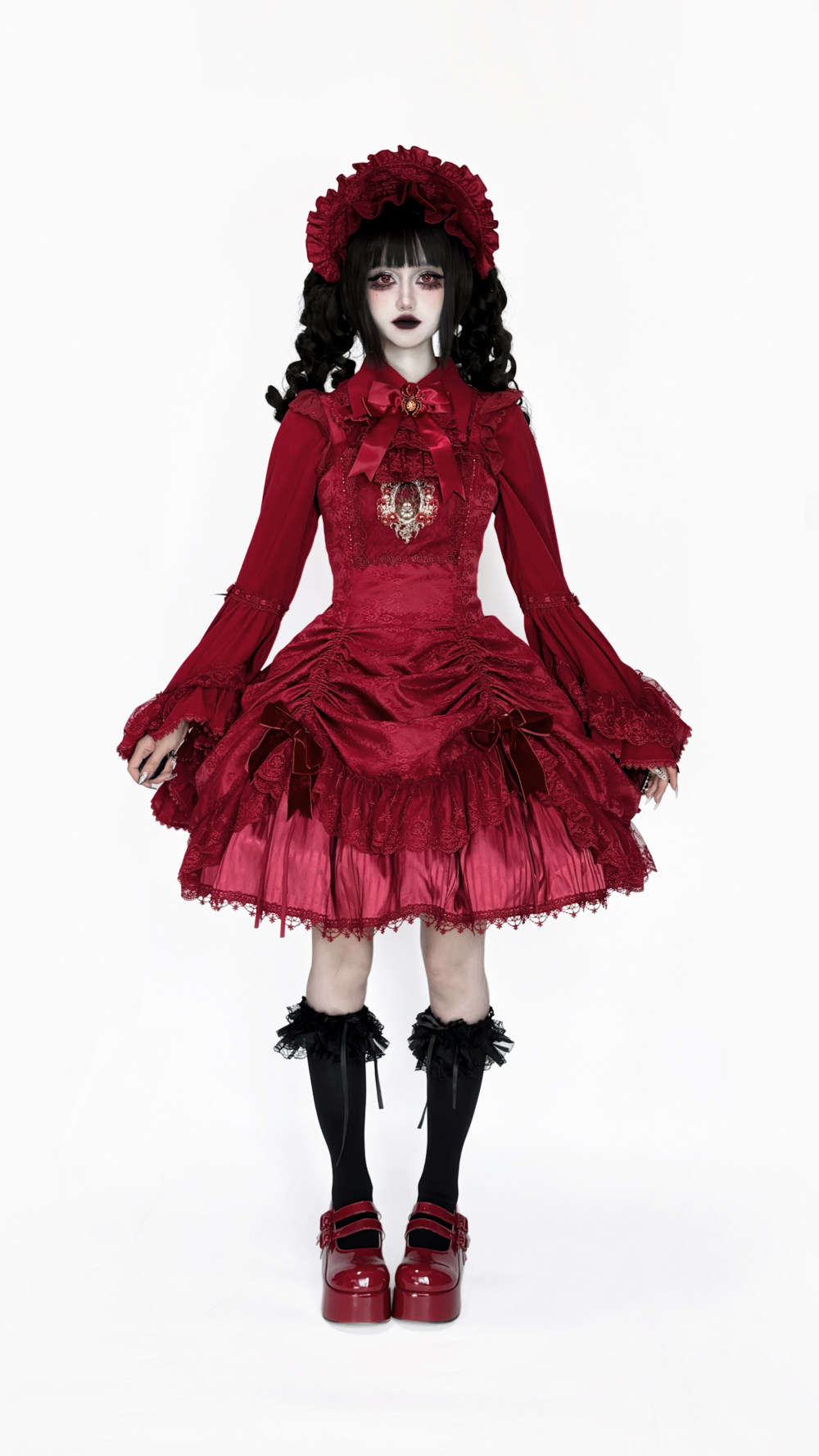 红色JSK4型 搭配红蕾丝红丝绒斗篷 黑蕾丝红丝绒斗篷 姬袖衬衫 蕾丝领结