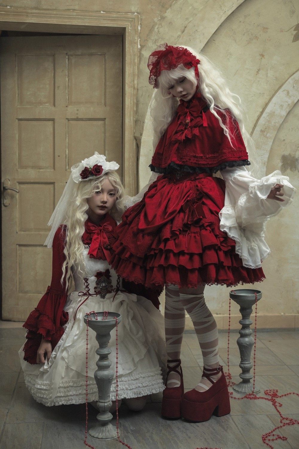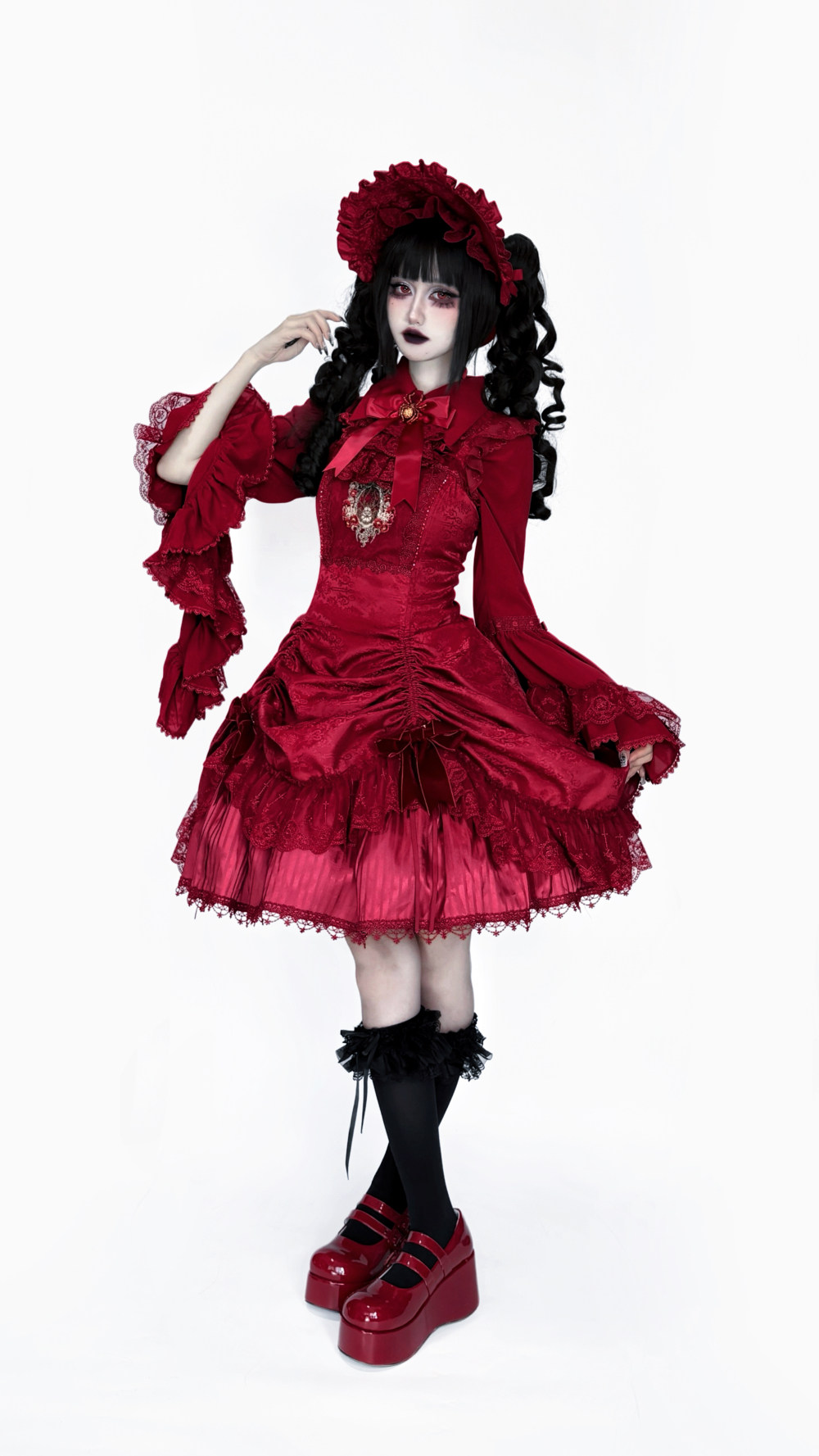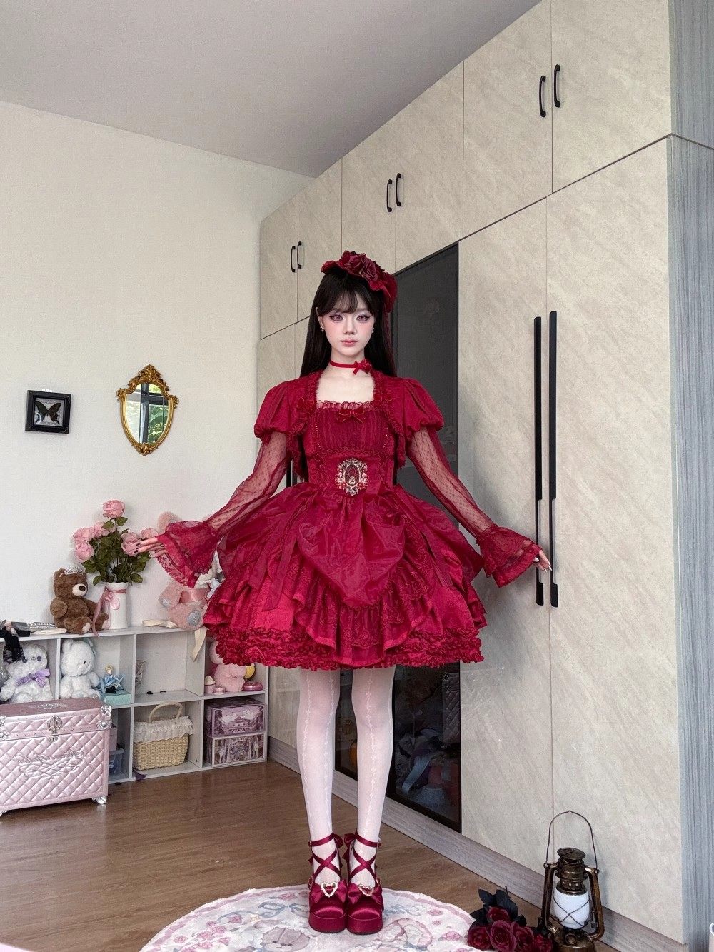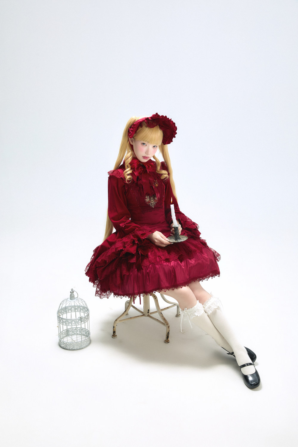 红色JSK4型 搭配红蕾丝红丝绒斗篷 黑蕾丝红丝绒斗篷 姬袖衬衫 蕾丝领结