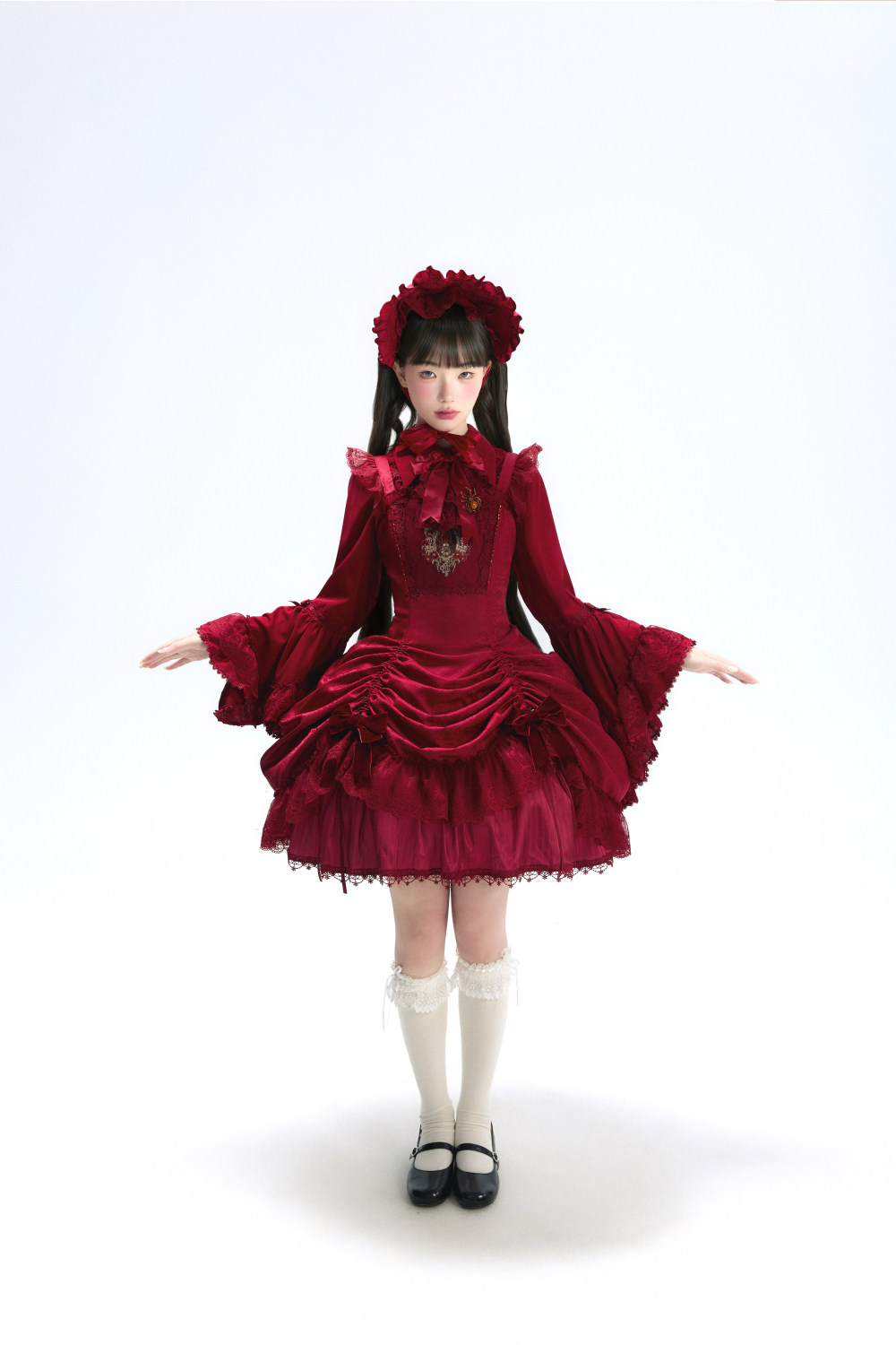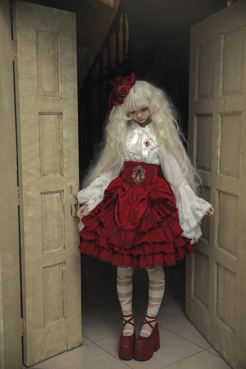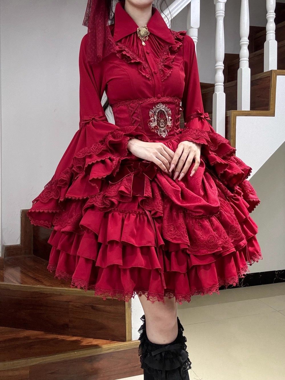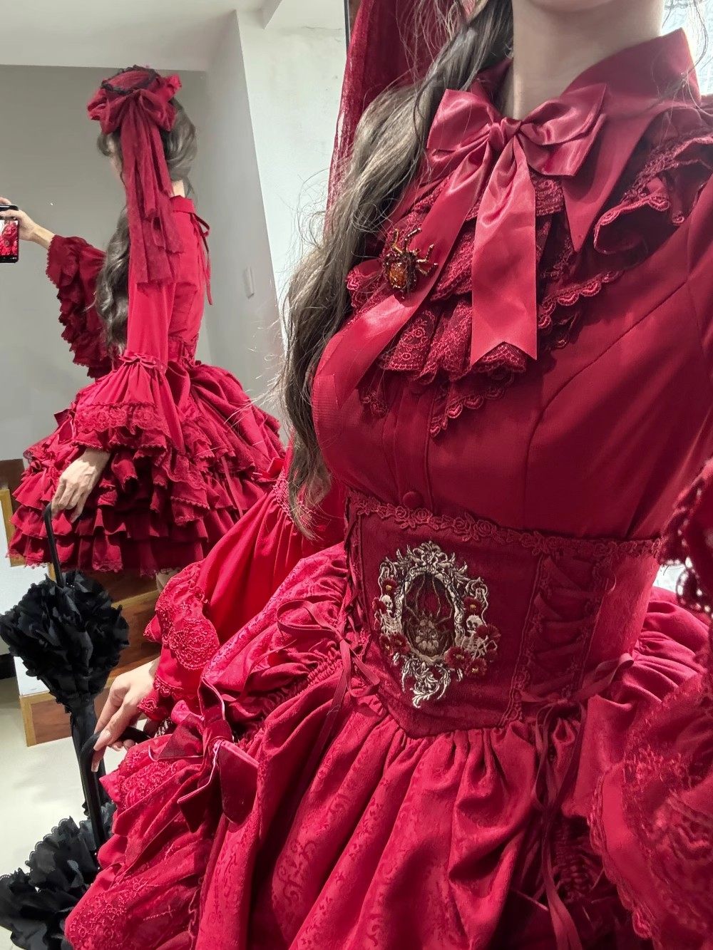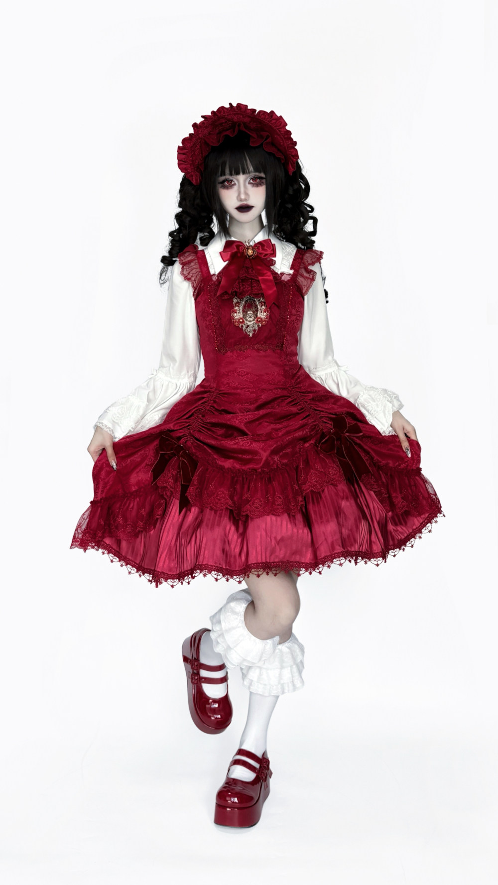 红色JSK4型 搭配红蕾丝红丝绒斗篷 黑蕾丝红丝绒斗篷 姬袖衬衫 蕾丝领结