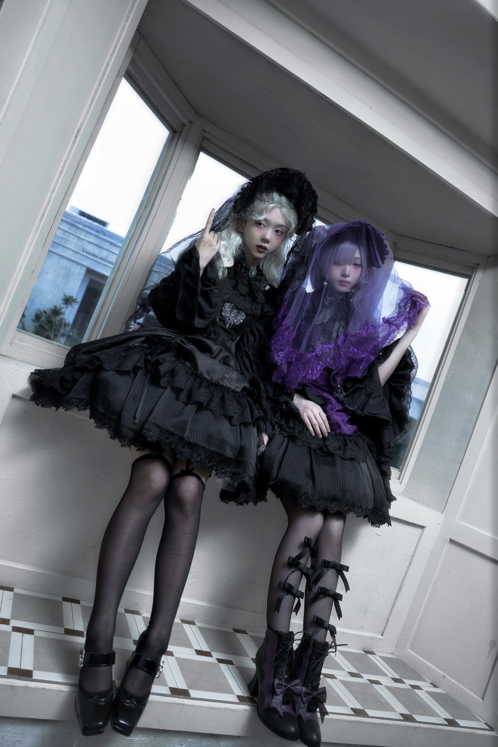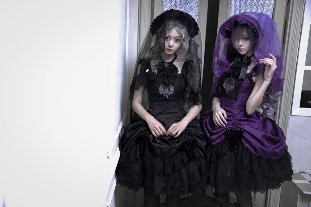模特173 二尾穿着哑光珠光纱版JSK3型 暗纹斗篷 花朵帽 黑色领结 黑色蕾丝坎肩