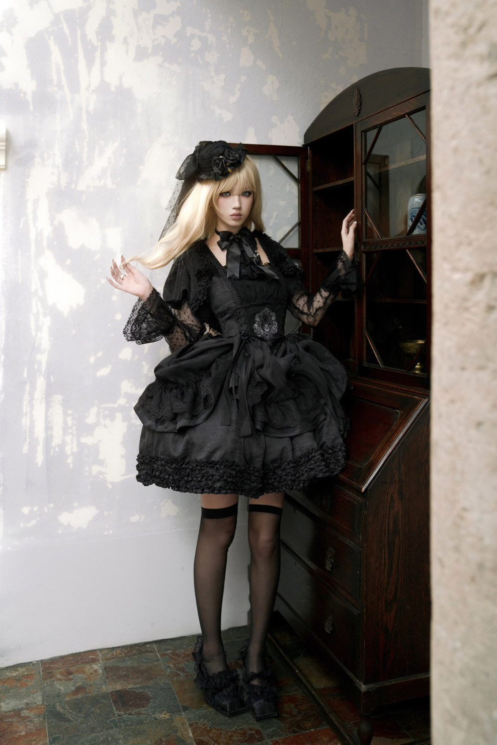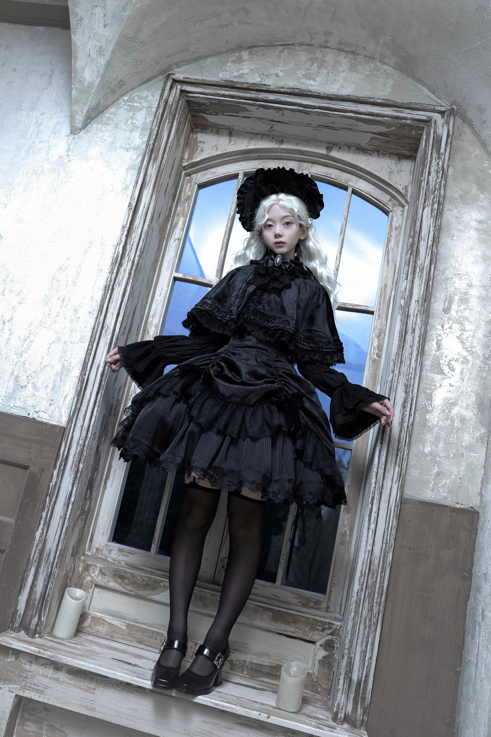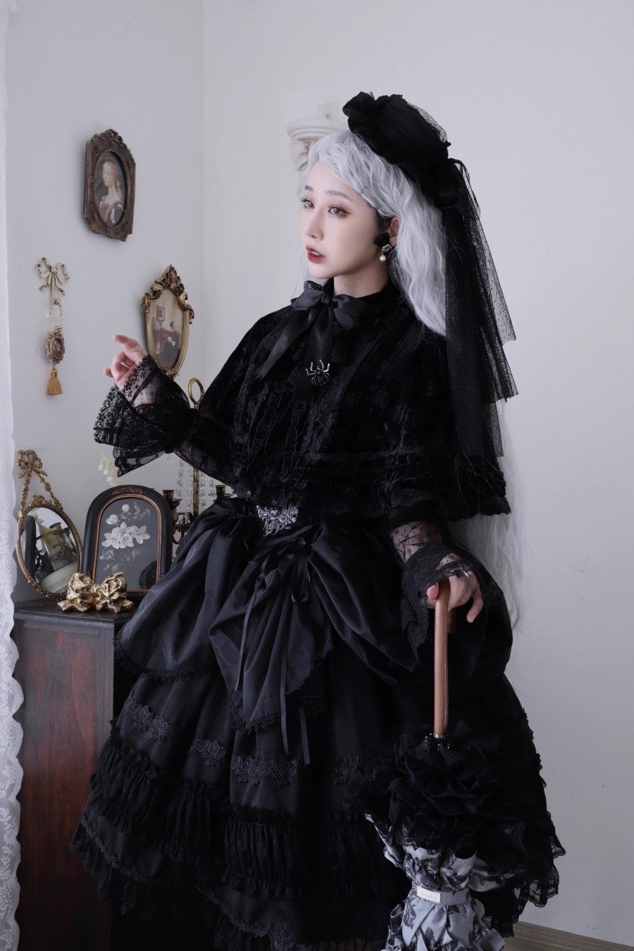 模特163 穿着哑光细闪纱版黑色JSK2型短款蕾丝 暗纹斗篷 花朵帽 黑色领结 黑色蕾丝坎肩