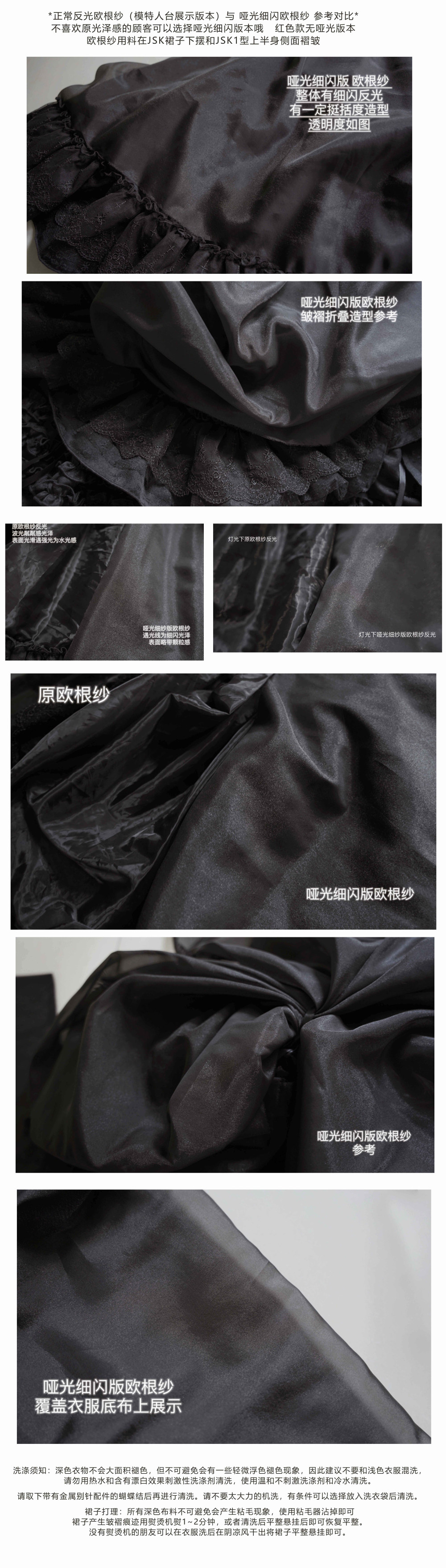 *JSK黑色可选有正常反光版欧根纱,和哑光细闪版欧根纱,不选哑光细闪版选项的都是正常反光欧根纱*