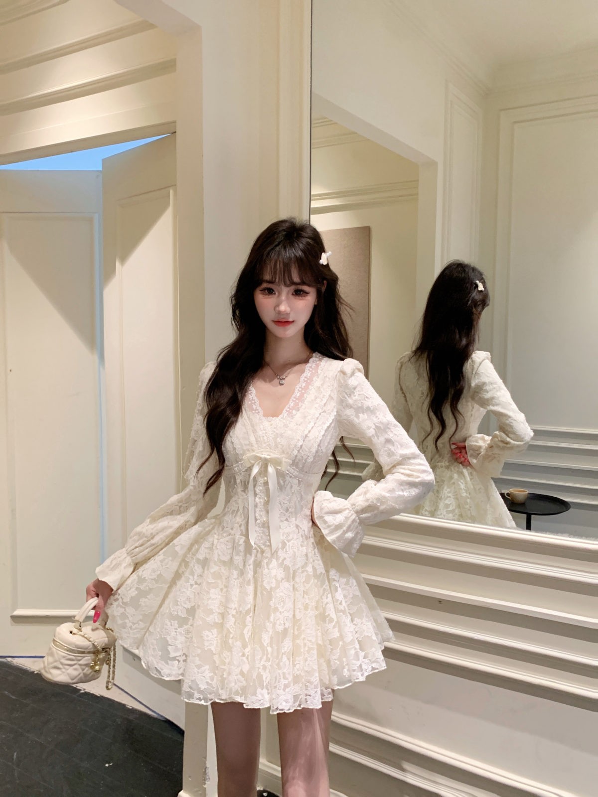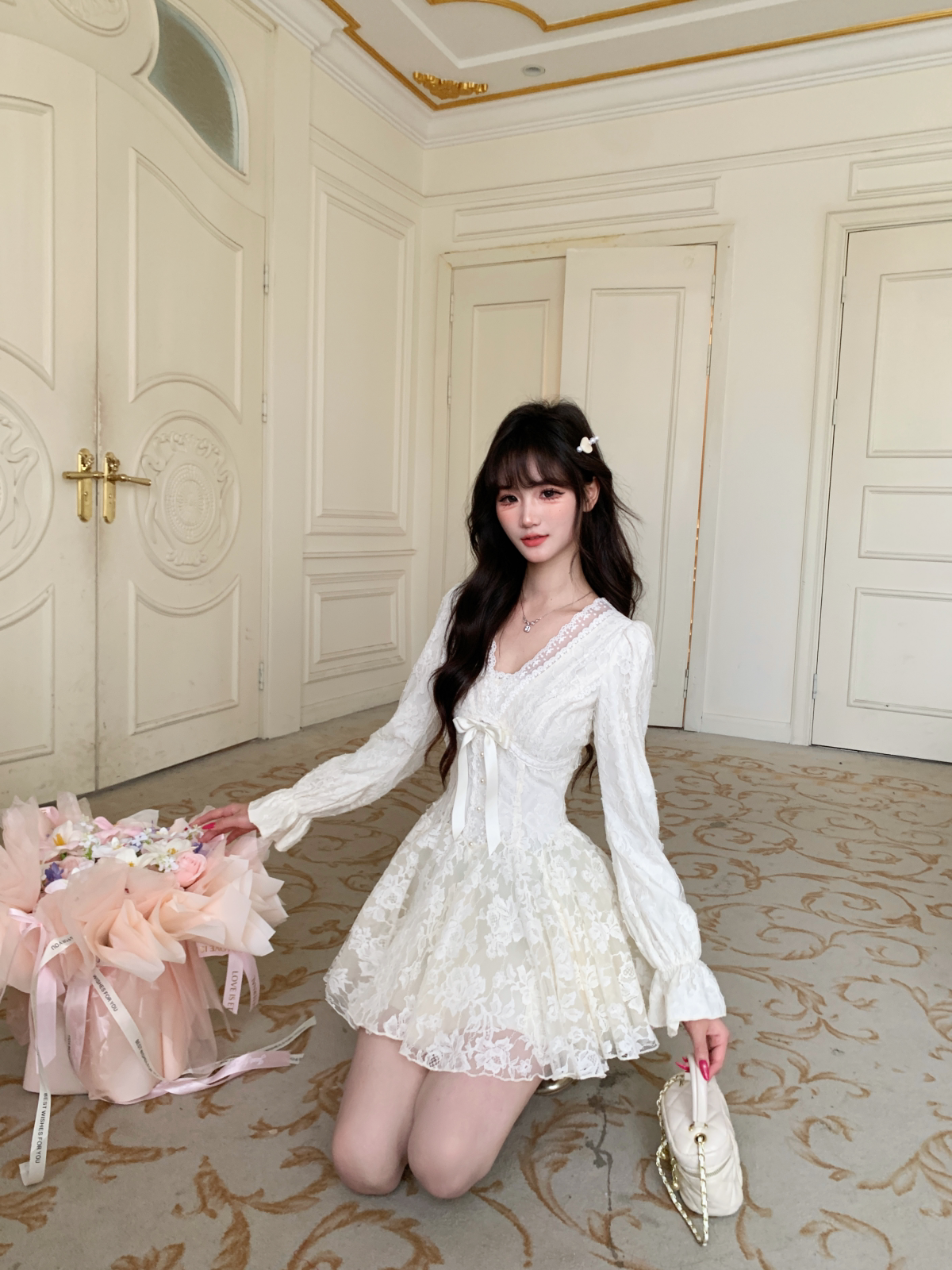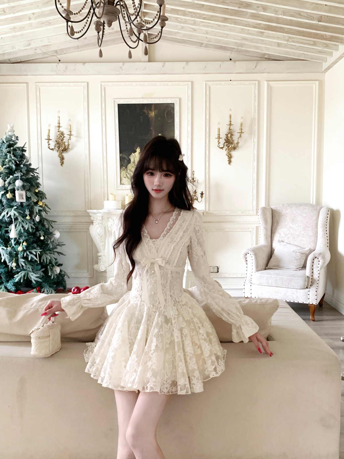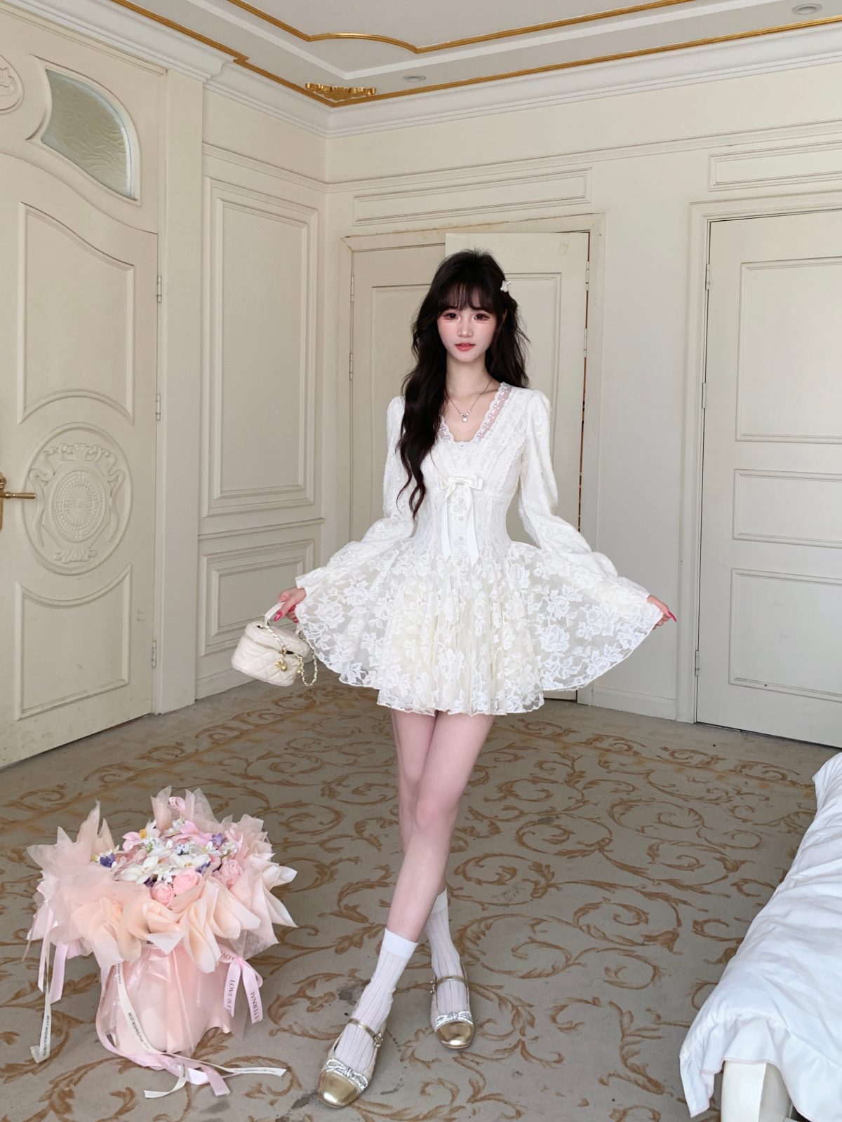 Korean and Vietnamese style angel wings French pure and sexy lace dress, waist-cinching, elegant style birthday puff skirt for women in autumn.