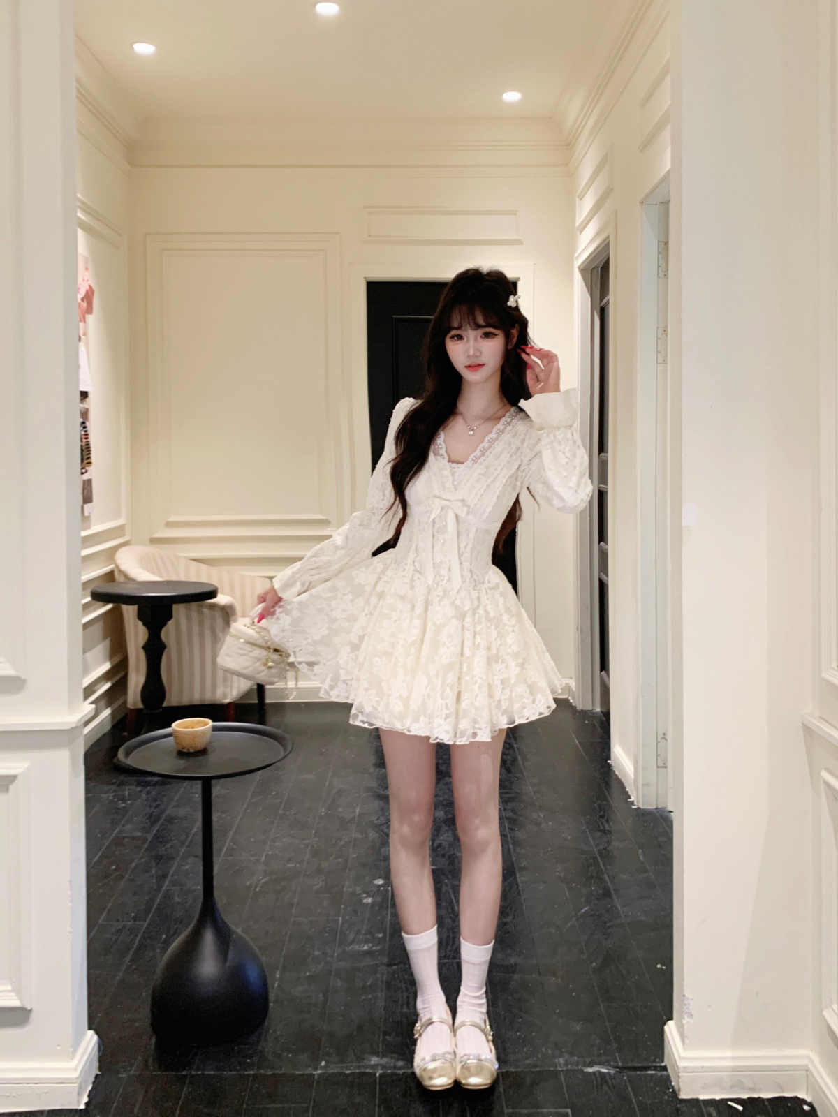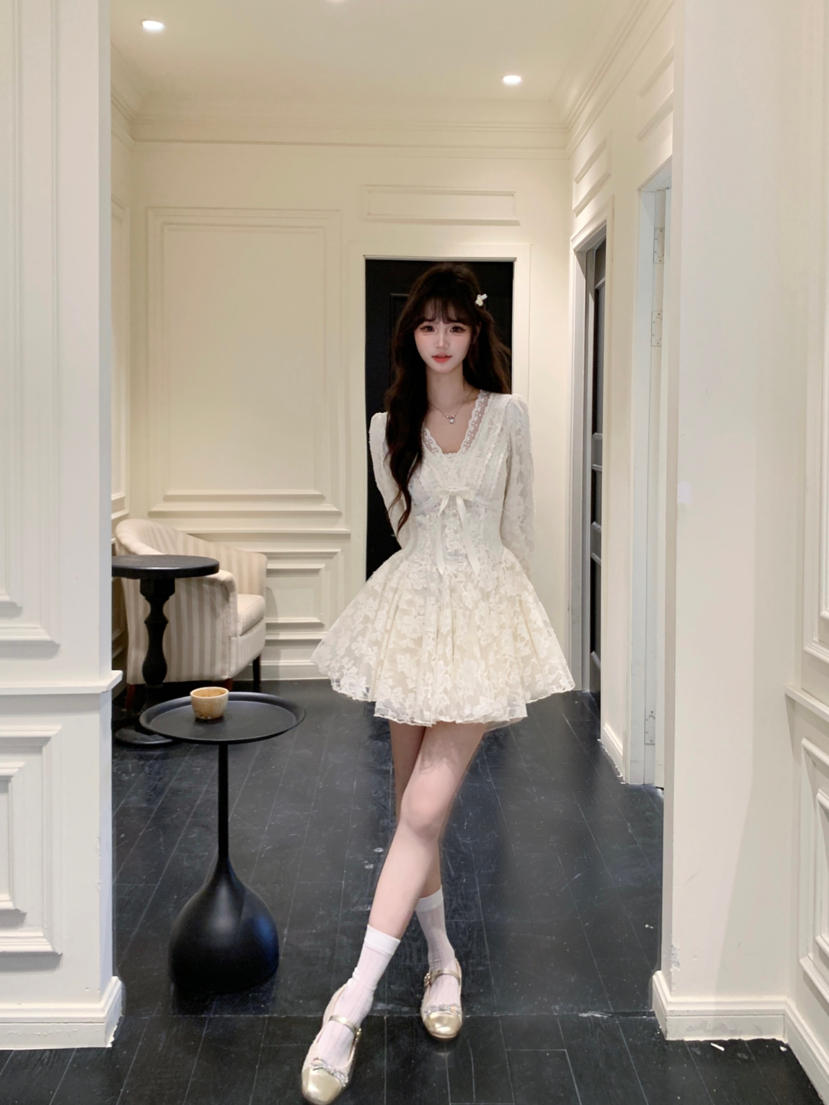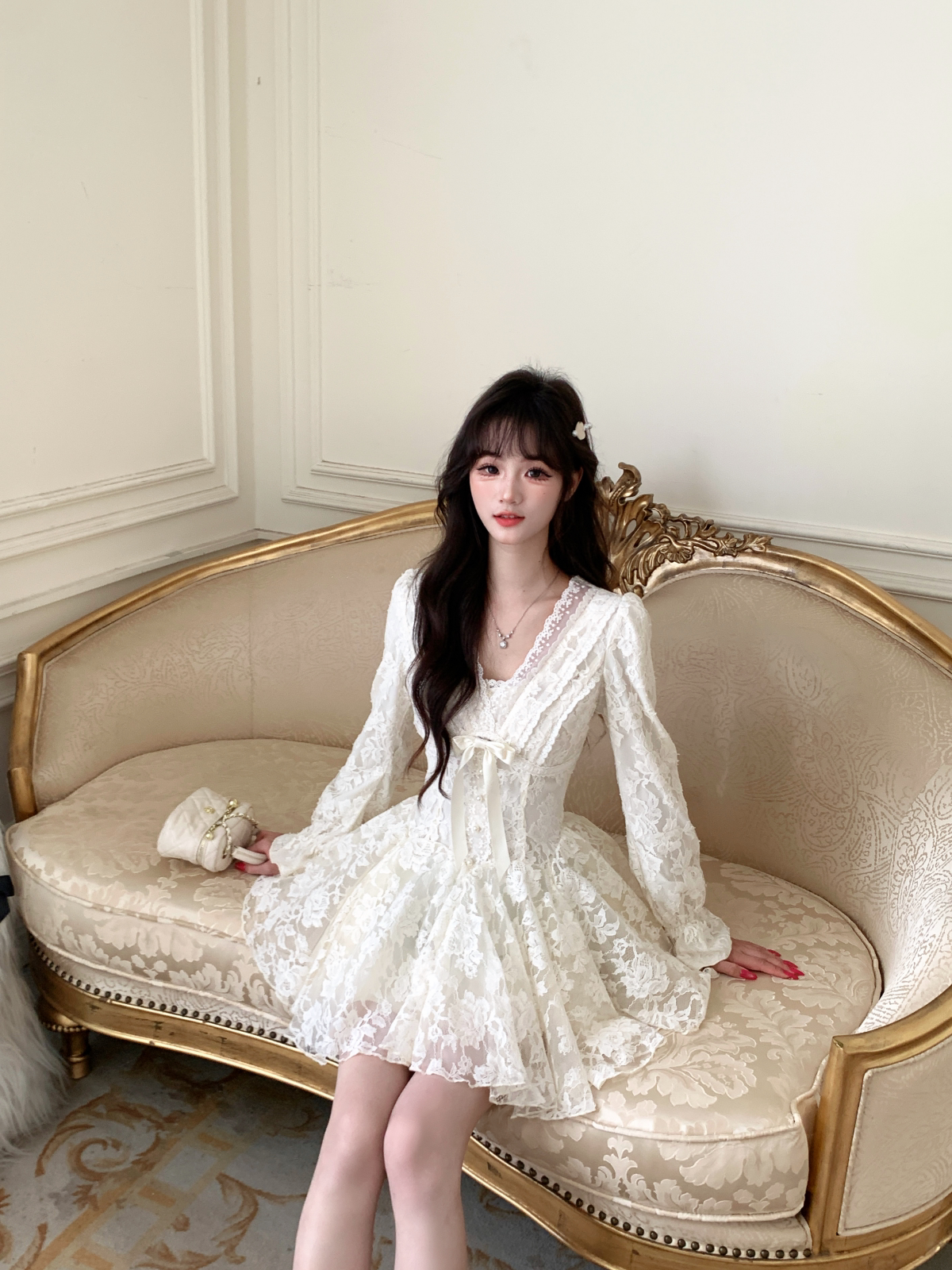 Korean and Vietnamese style angel wings French pure and sexy lace dress, waist-cinching, elegant style birthday puff skirt for women in autumn.