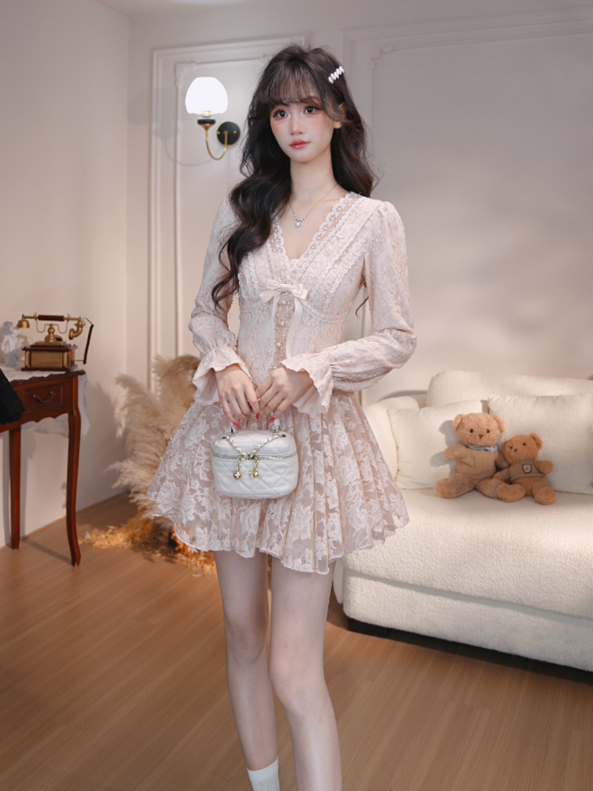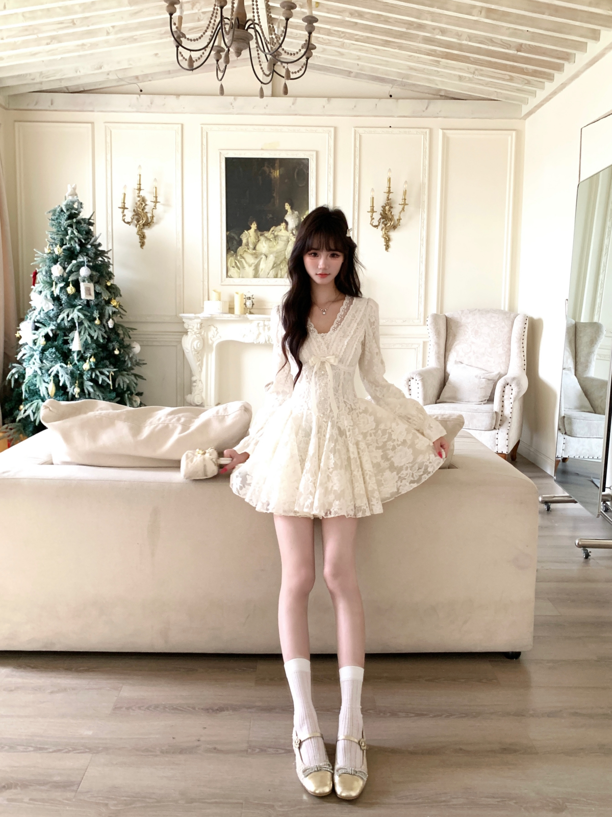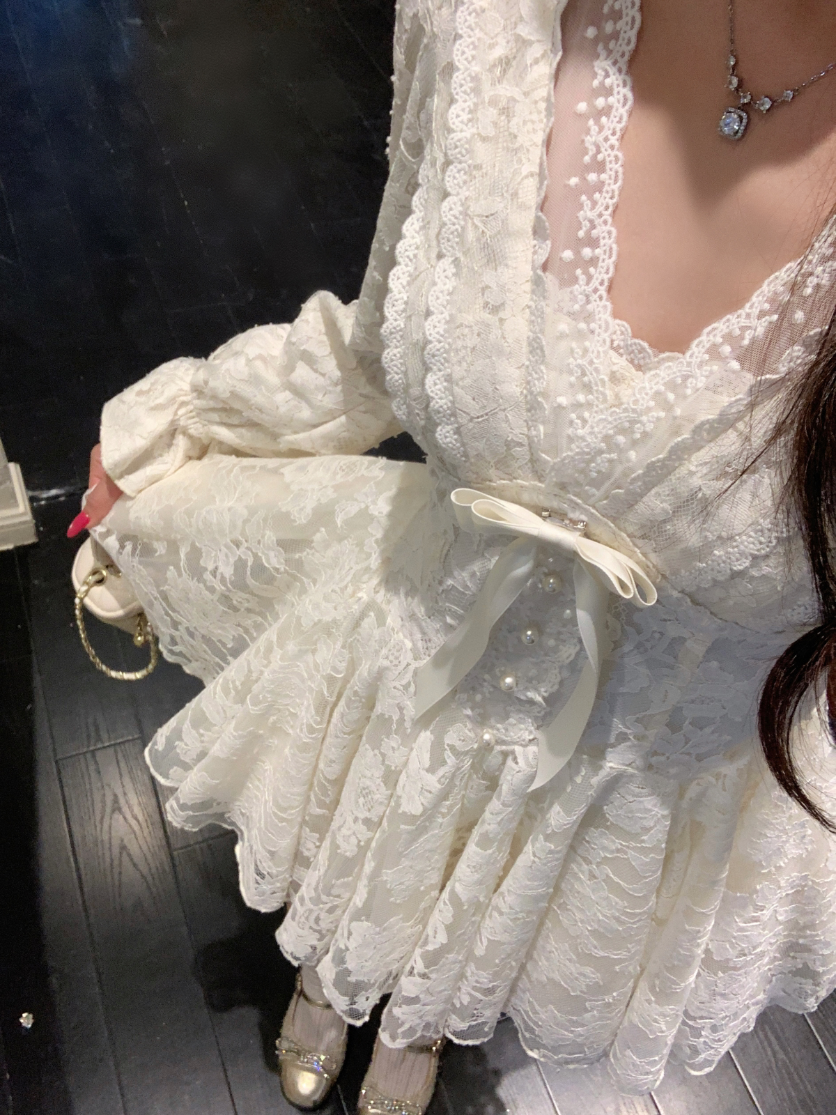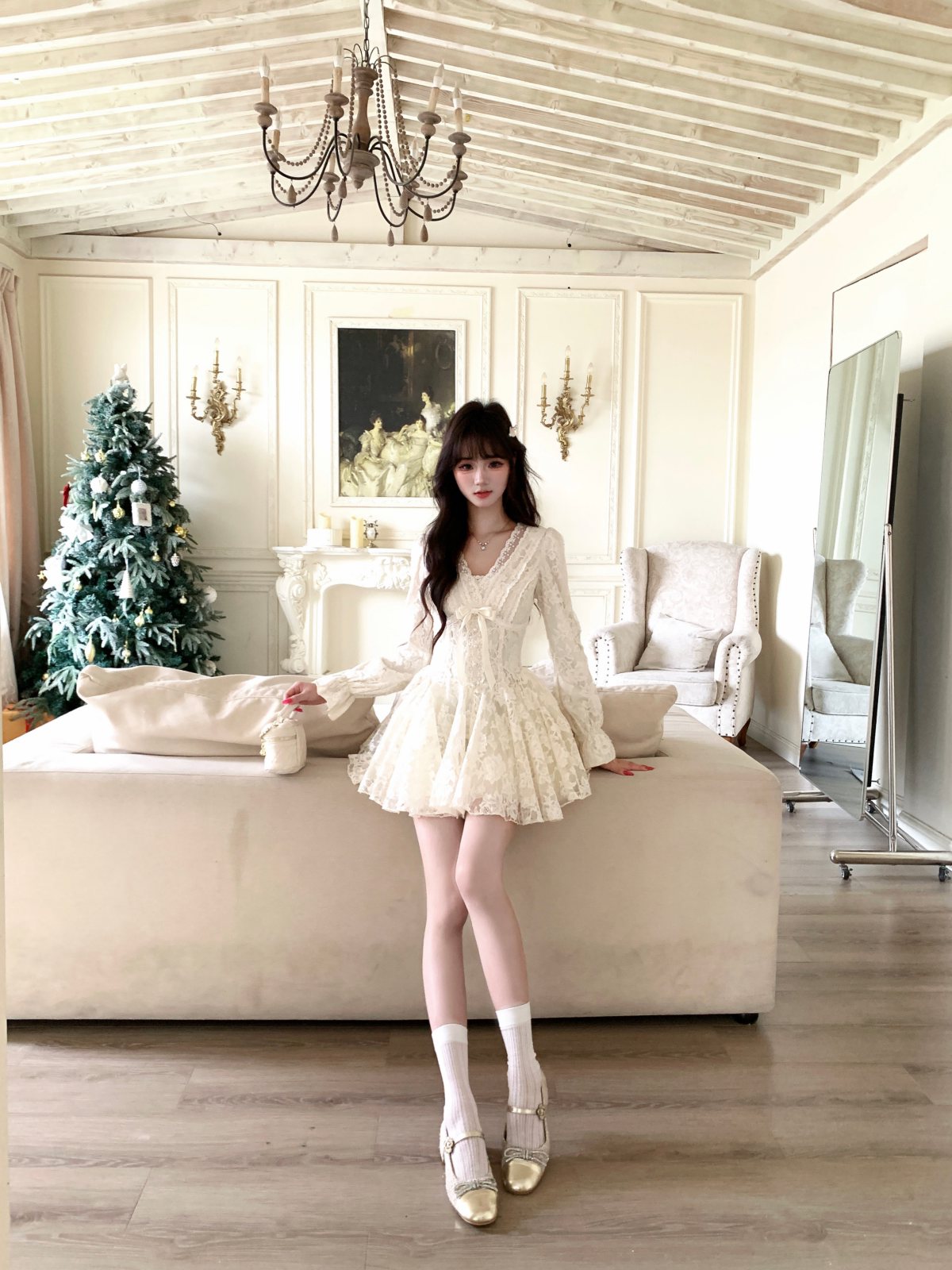 Korean and Vietnamese style angel wings French pure and sexy lace dress, waist-cinching, elegant style birthday puff skirt for women in autumn.