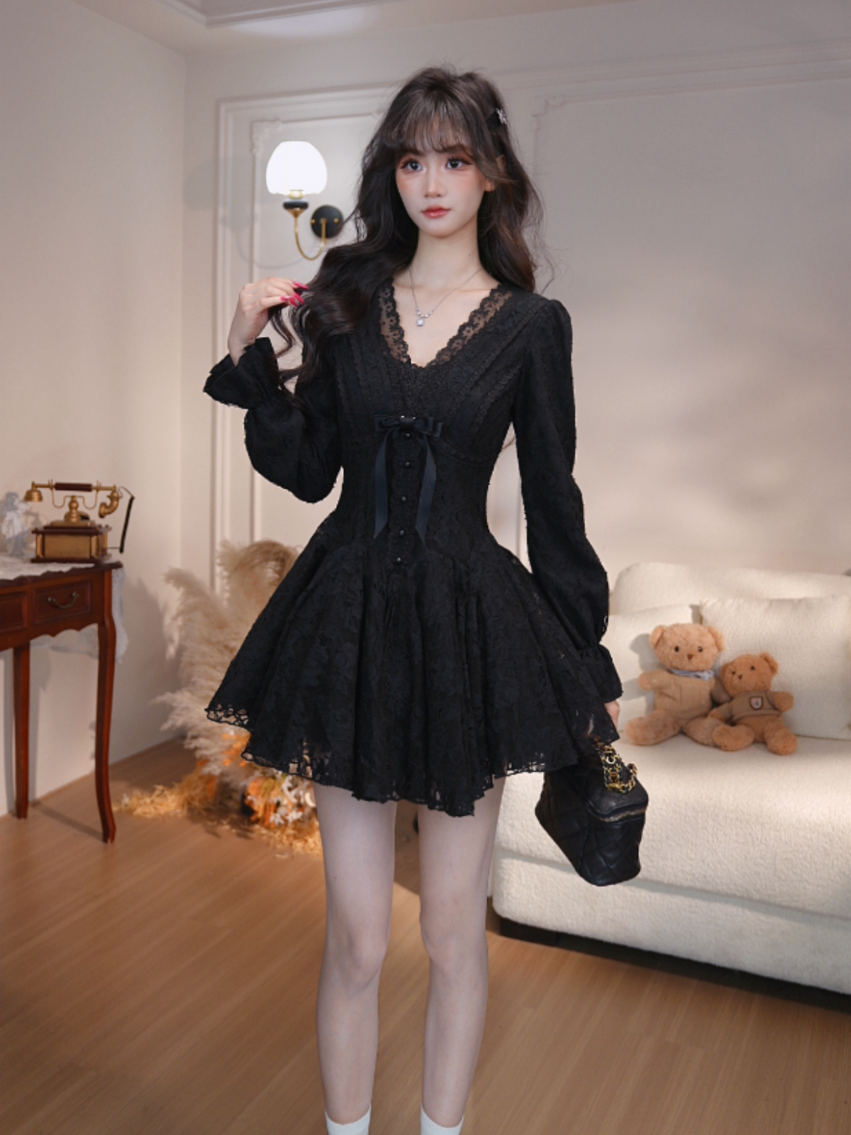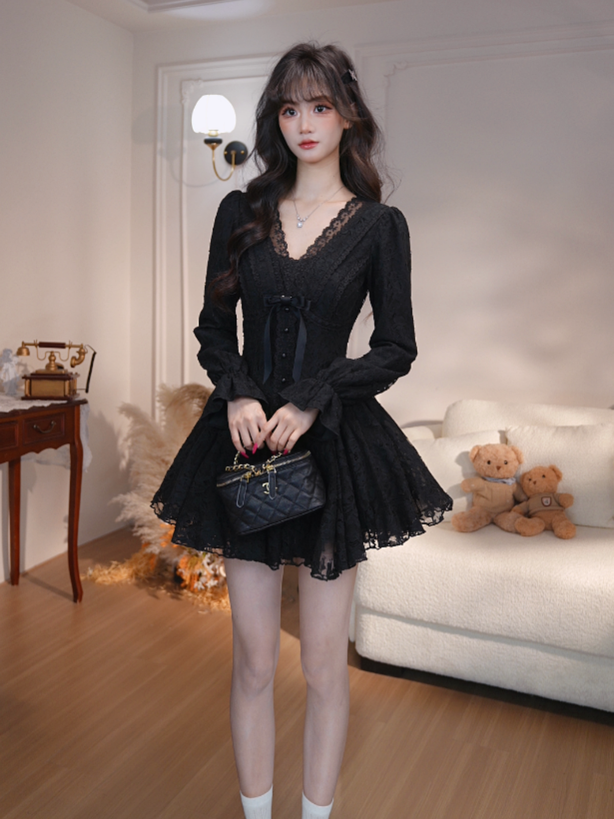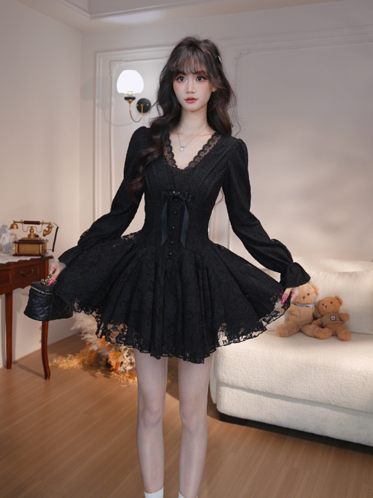 越韩小鱼 天使之翼 法式纯欲蕾丝连衣裙收腰千金风生日蓬蓬裙女秋 [Original Page Link]