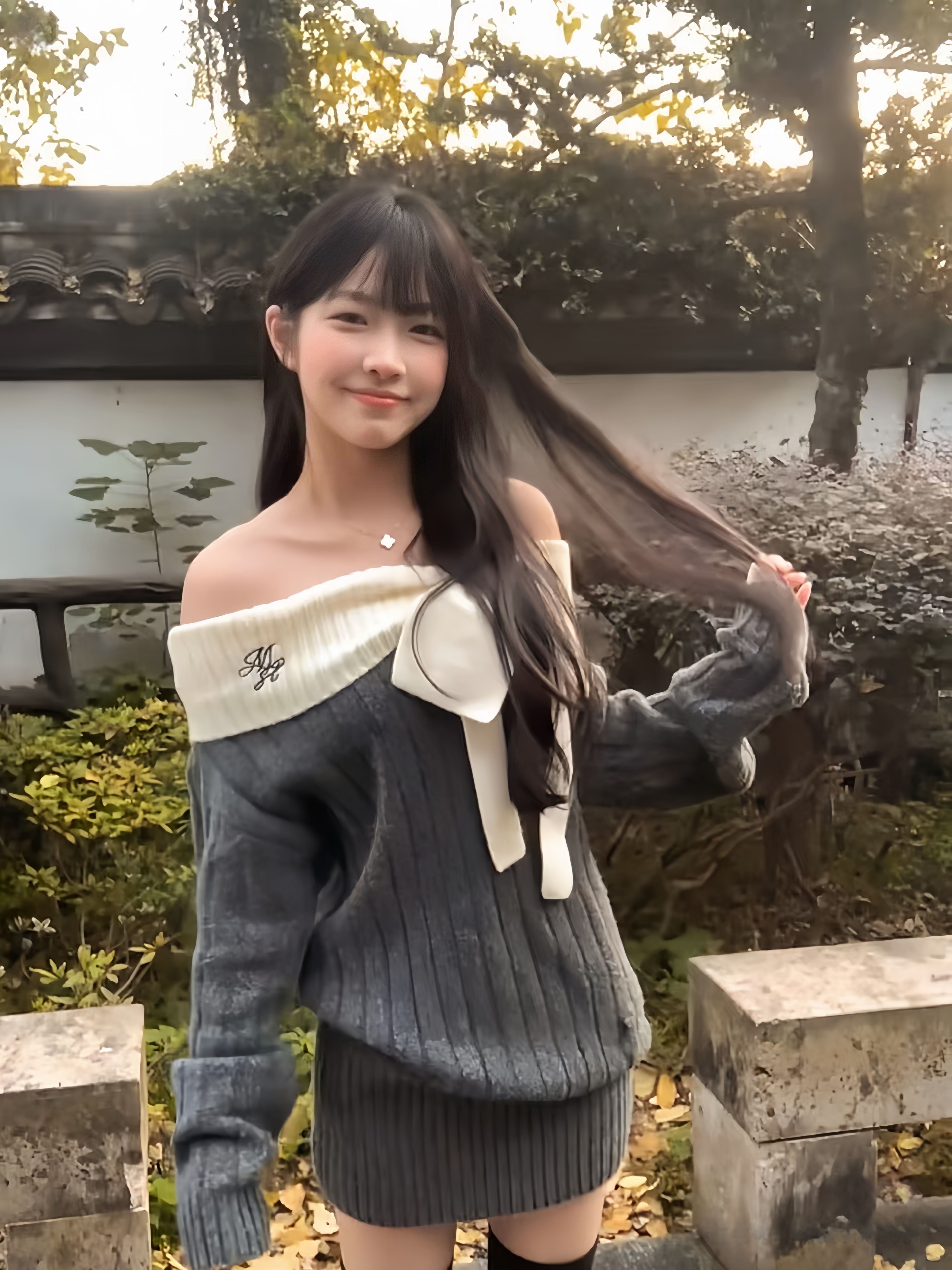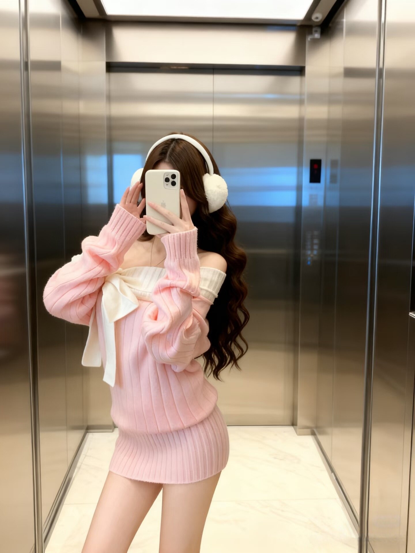 法式纯欲蝴蝶结一字领长袖针织连衣裙气质女收腰毛衣包臀短裙秋冬 [Original Page Link]