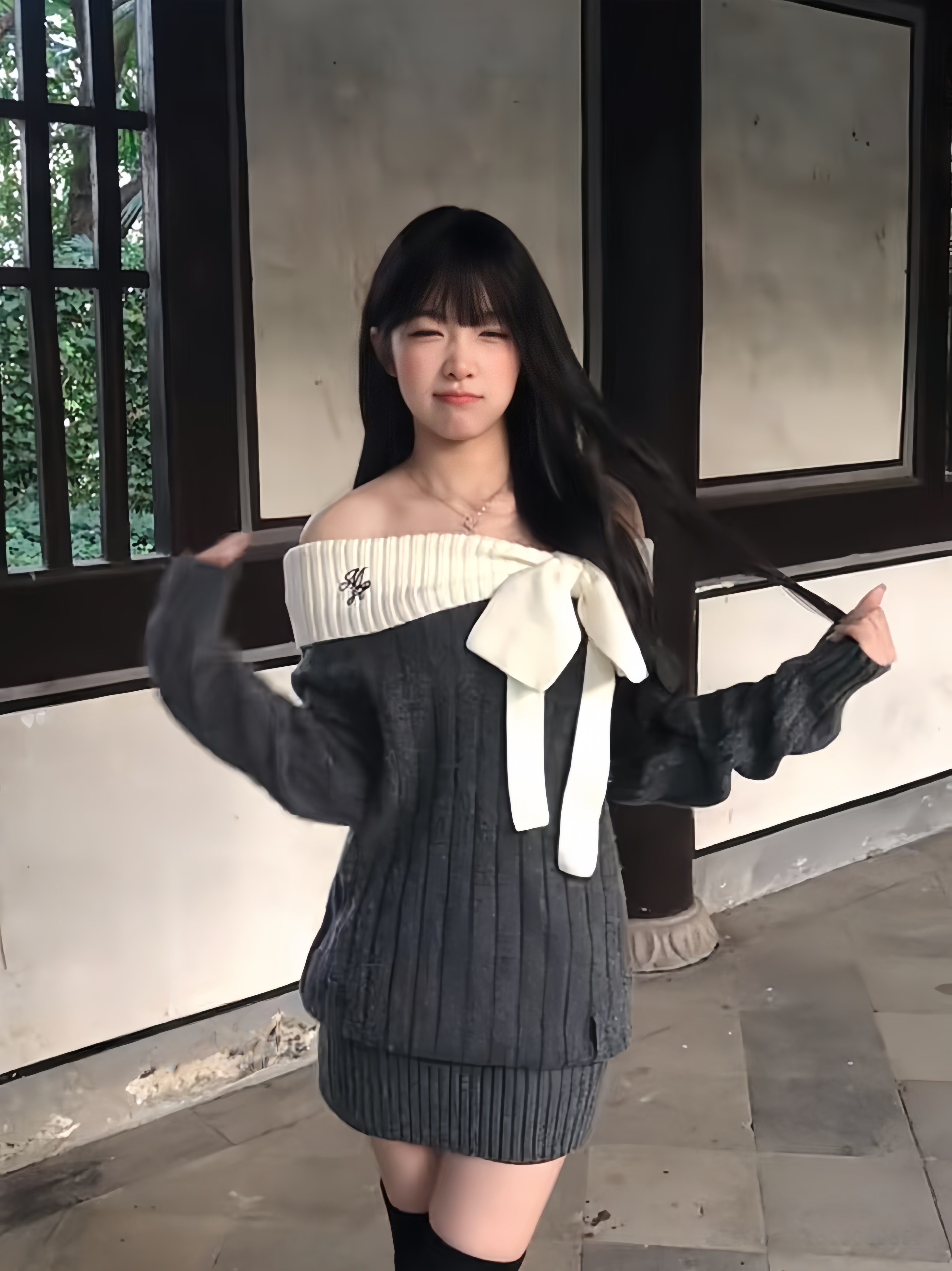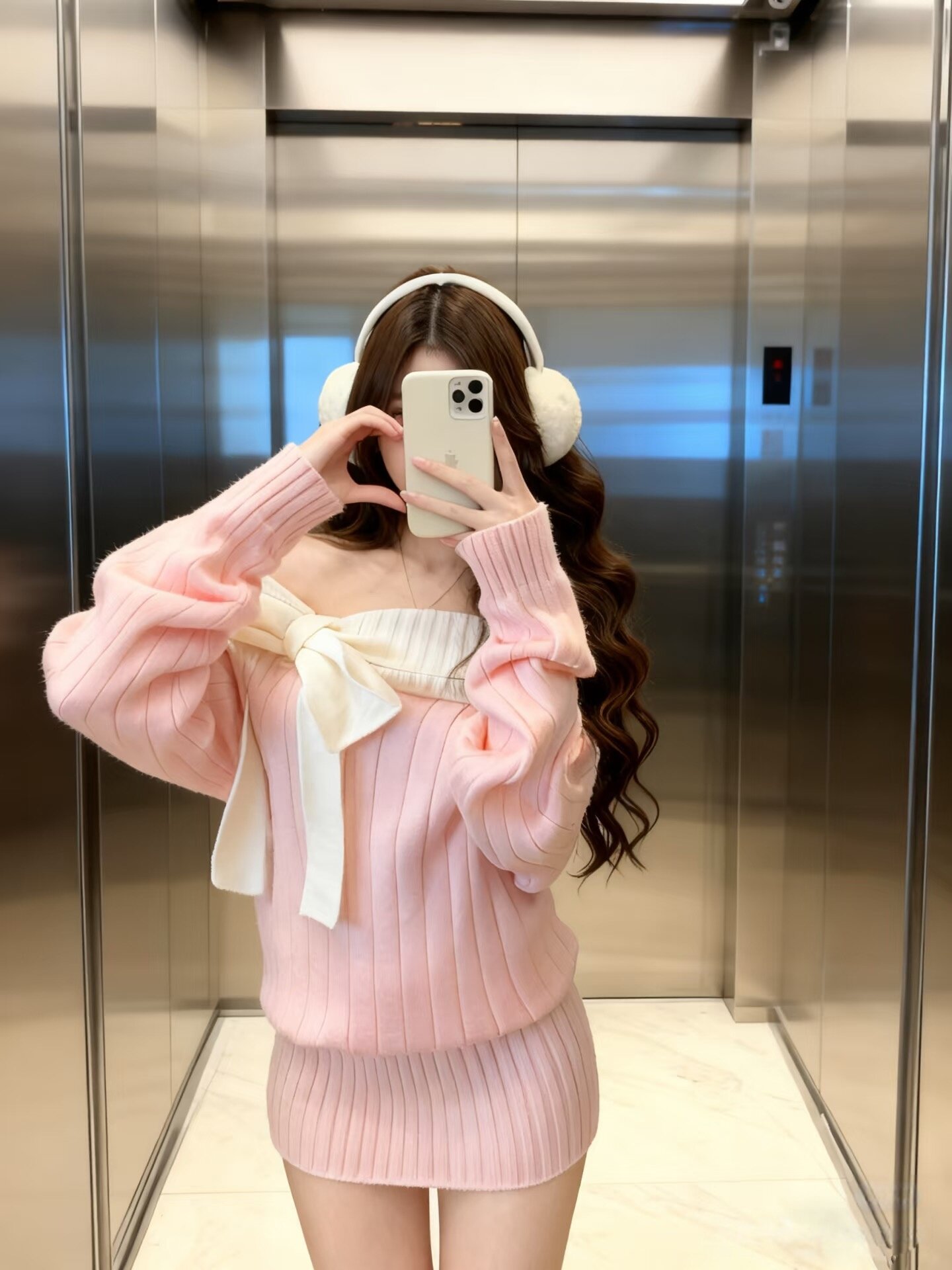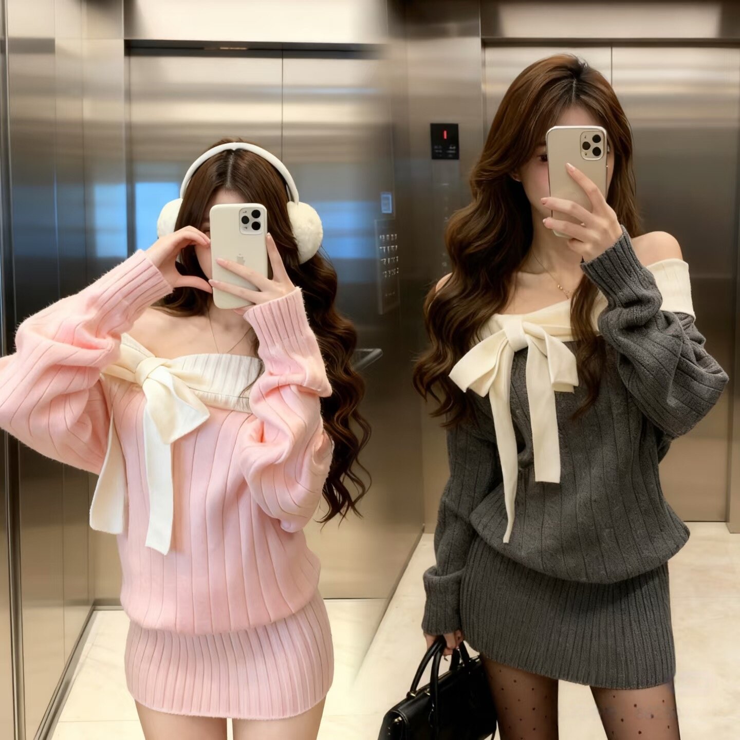 French-style off-the-shoulder long-sleeved knit dress with a bow, elegant and flattering, fitted waist and bodycon skirt, perfect for autumn and winter.