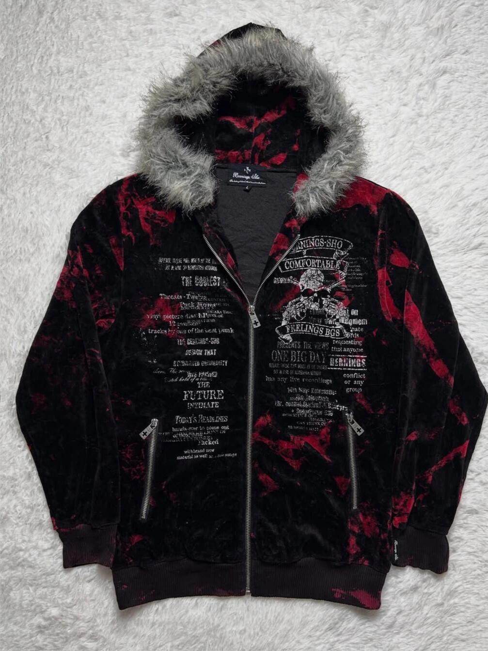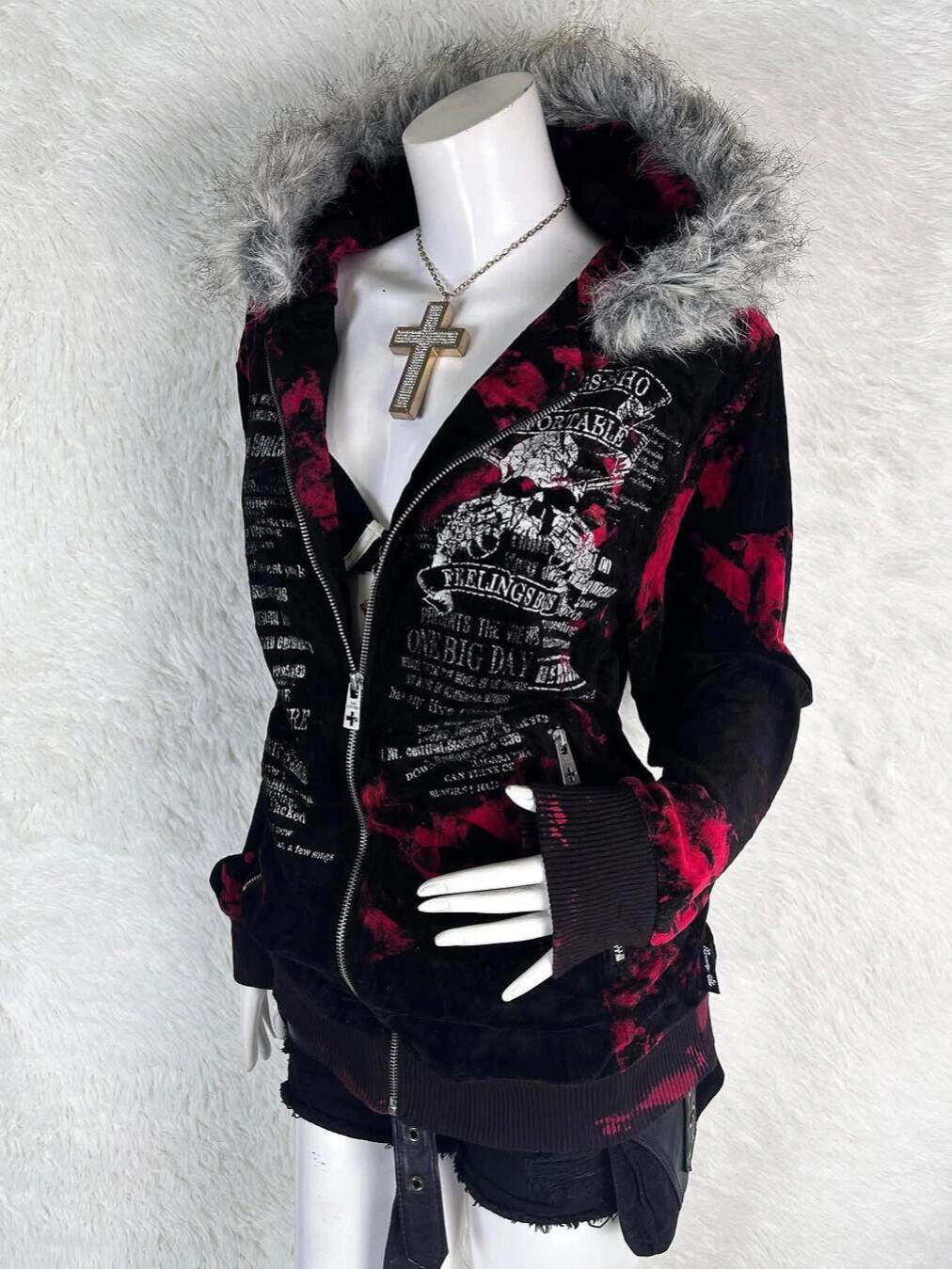 美式复古暗黑哥特风红黑扎染大毛领连帽卫衣骷髅印花朋克拉链外套 [Original Page Link]
