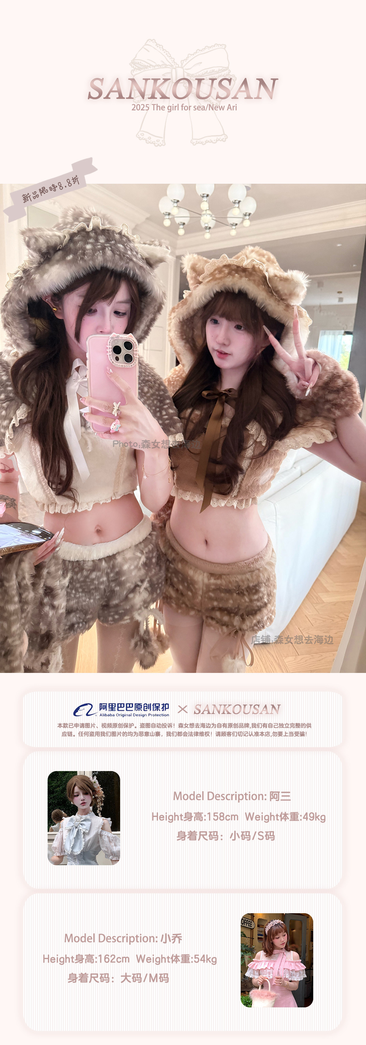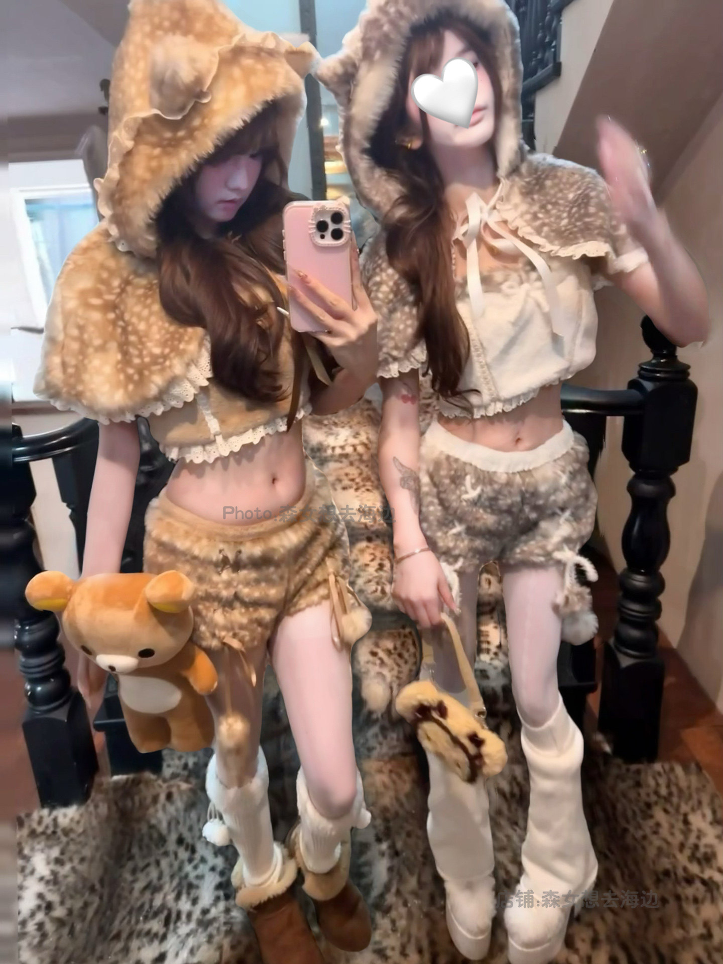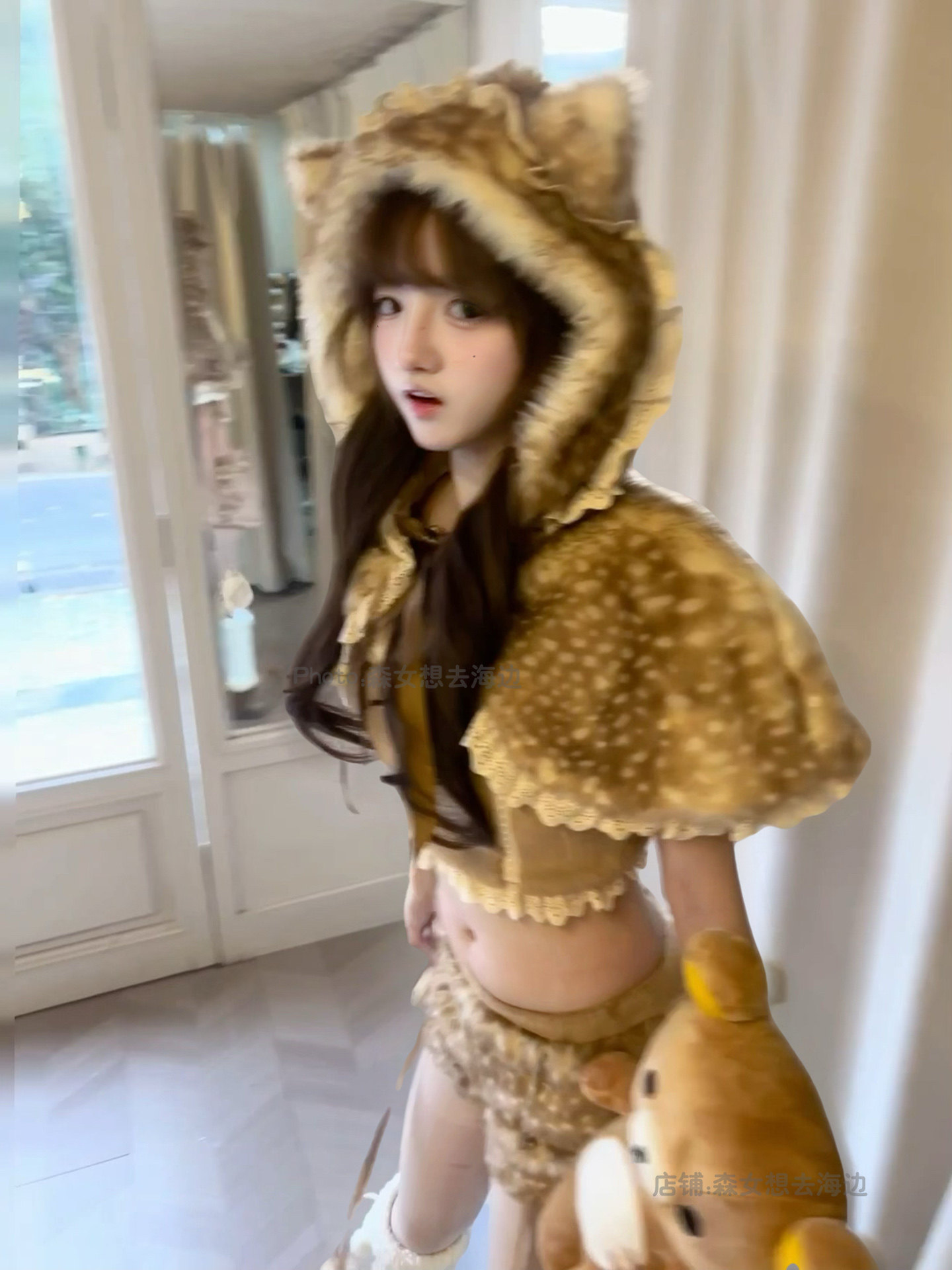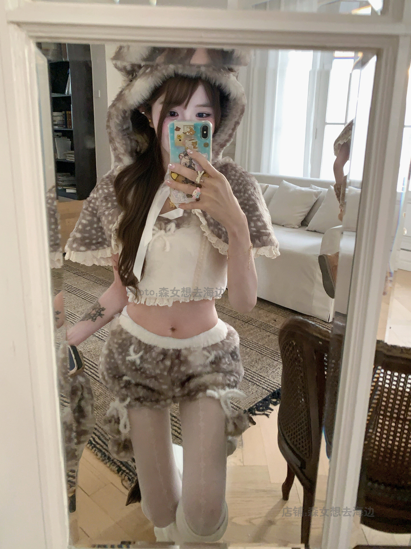 森女系原创想去海边 饼干小鹿 可爱小鹿纹圣诞风套装斗篷短裤吊带 [Original Page Link]