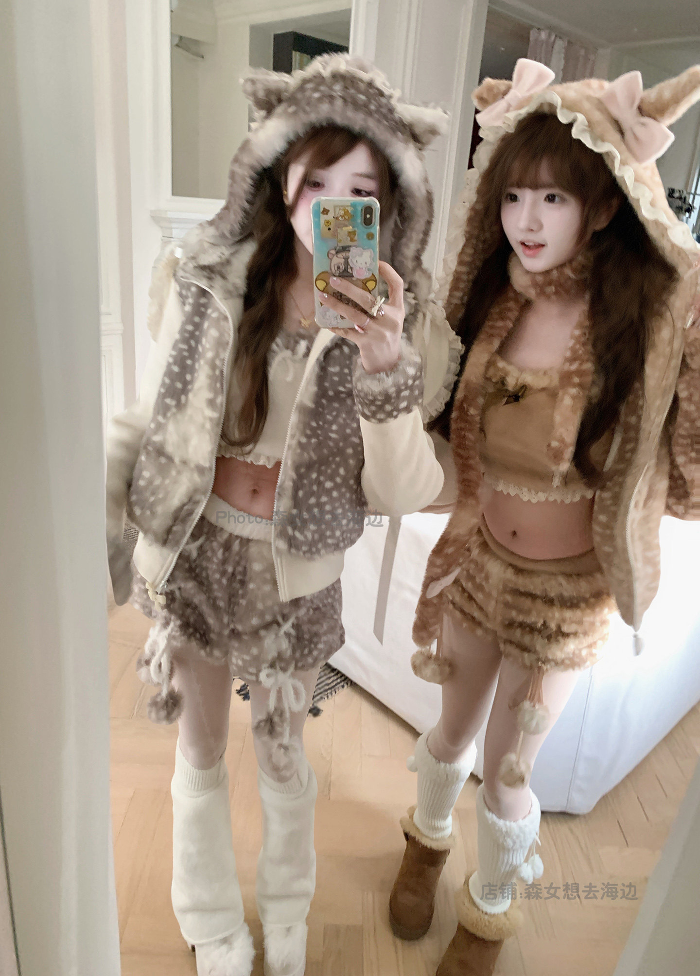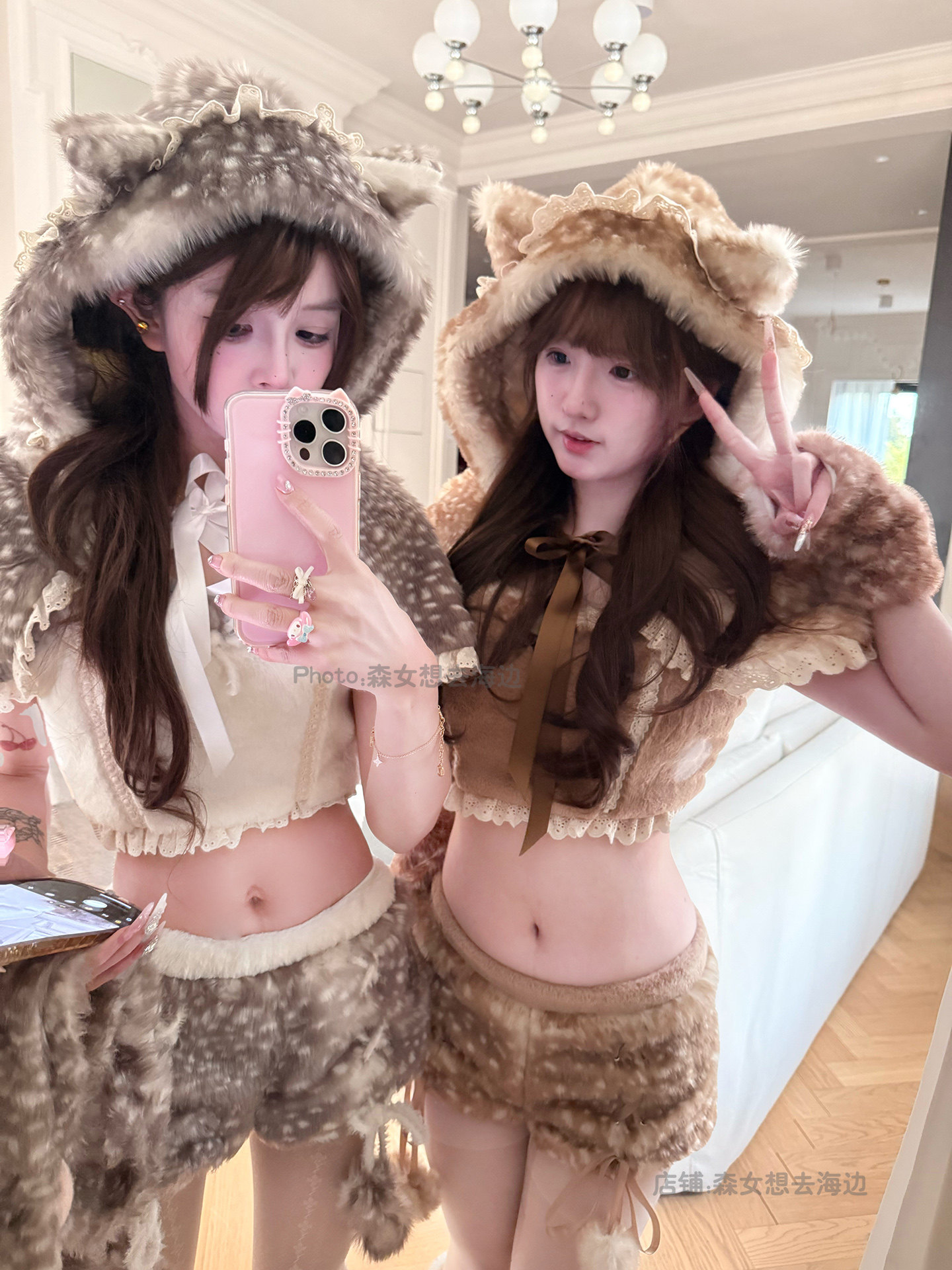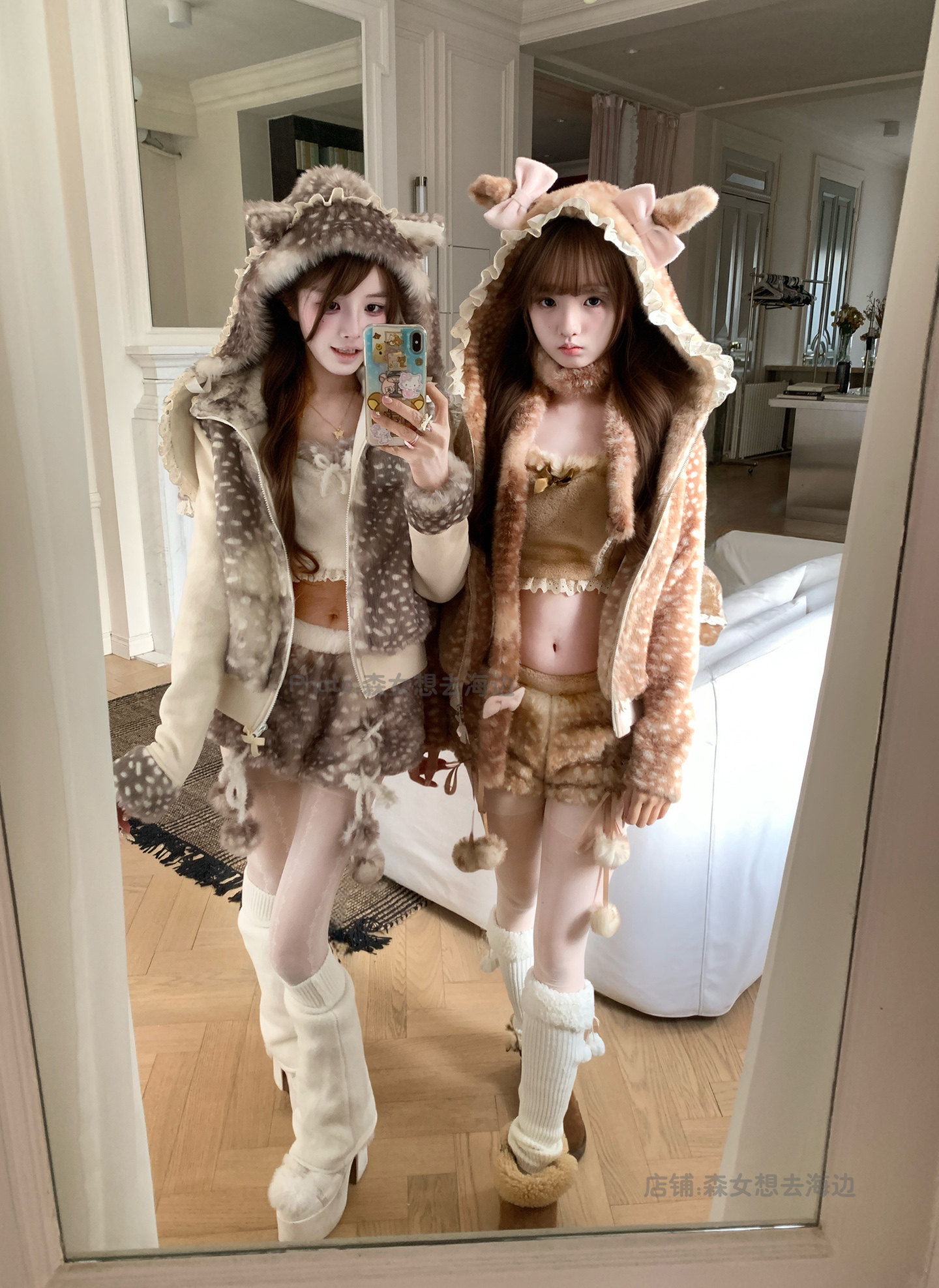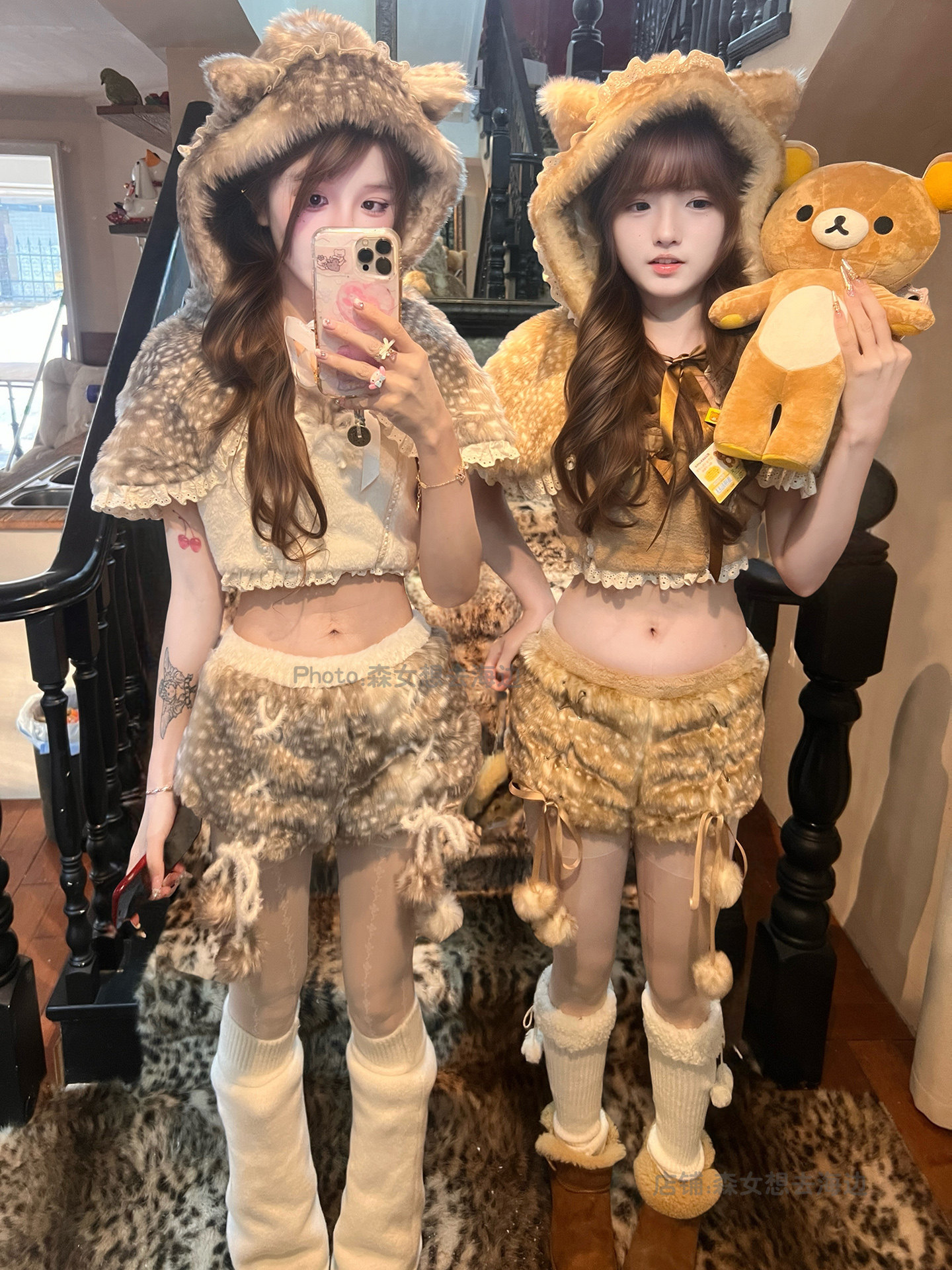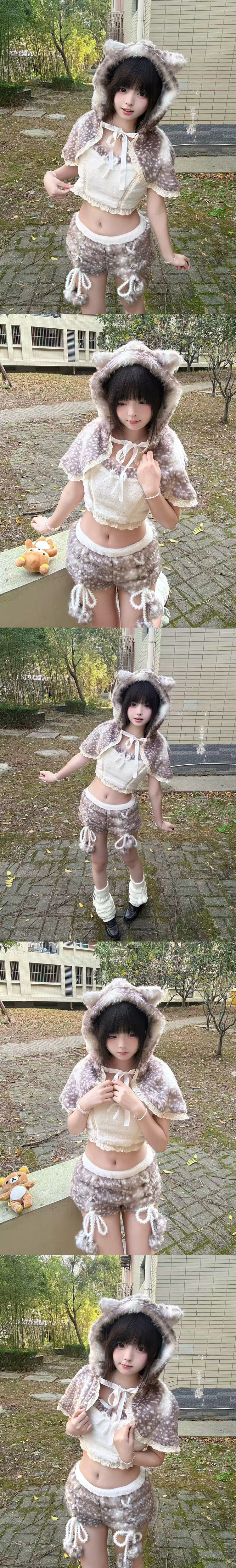 森女系原创想去海边 饼干小鹿 可爱小鹿纹圣诞风套装斗篷短裤吊带 [Original Page Link]