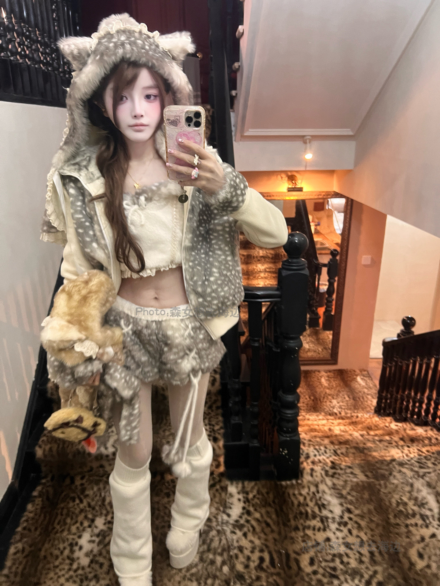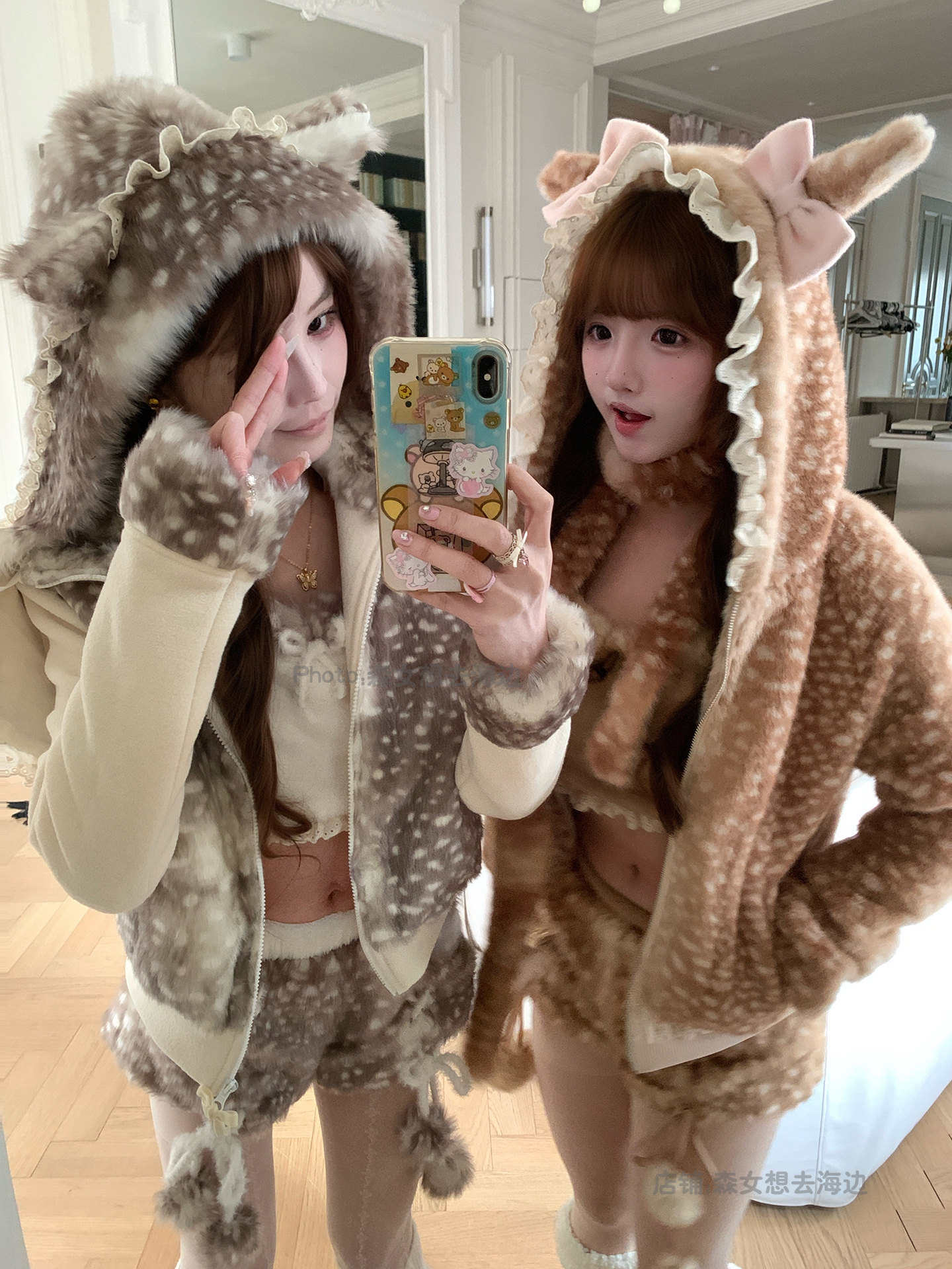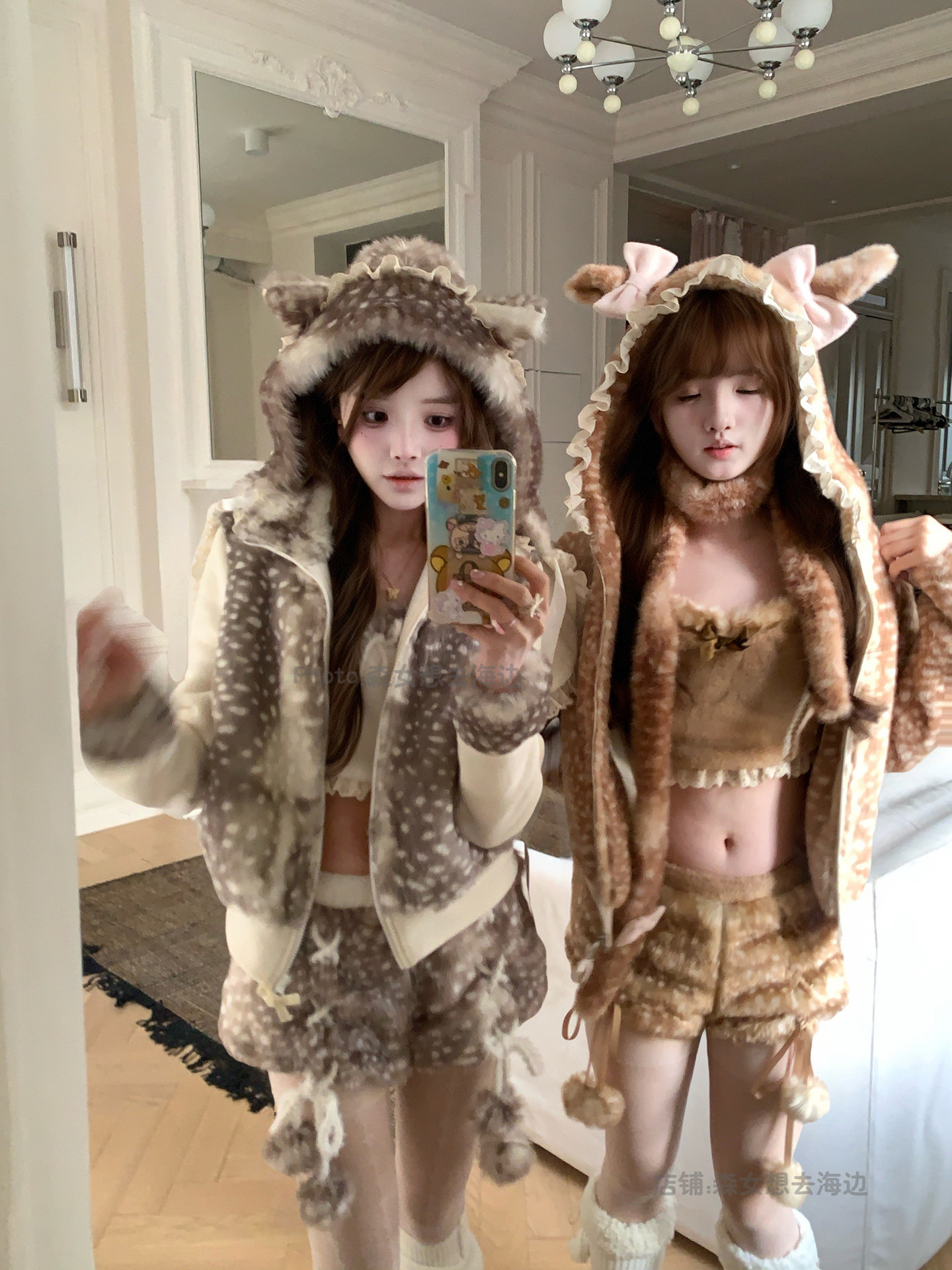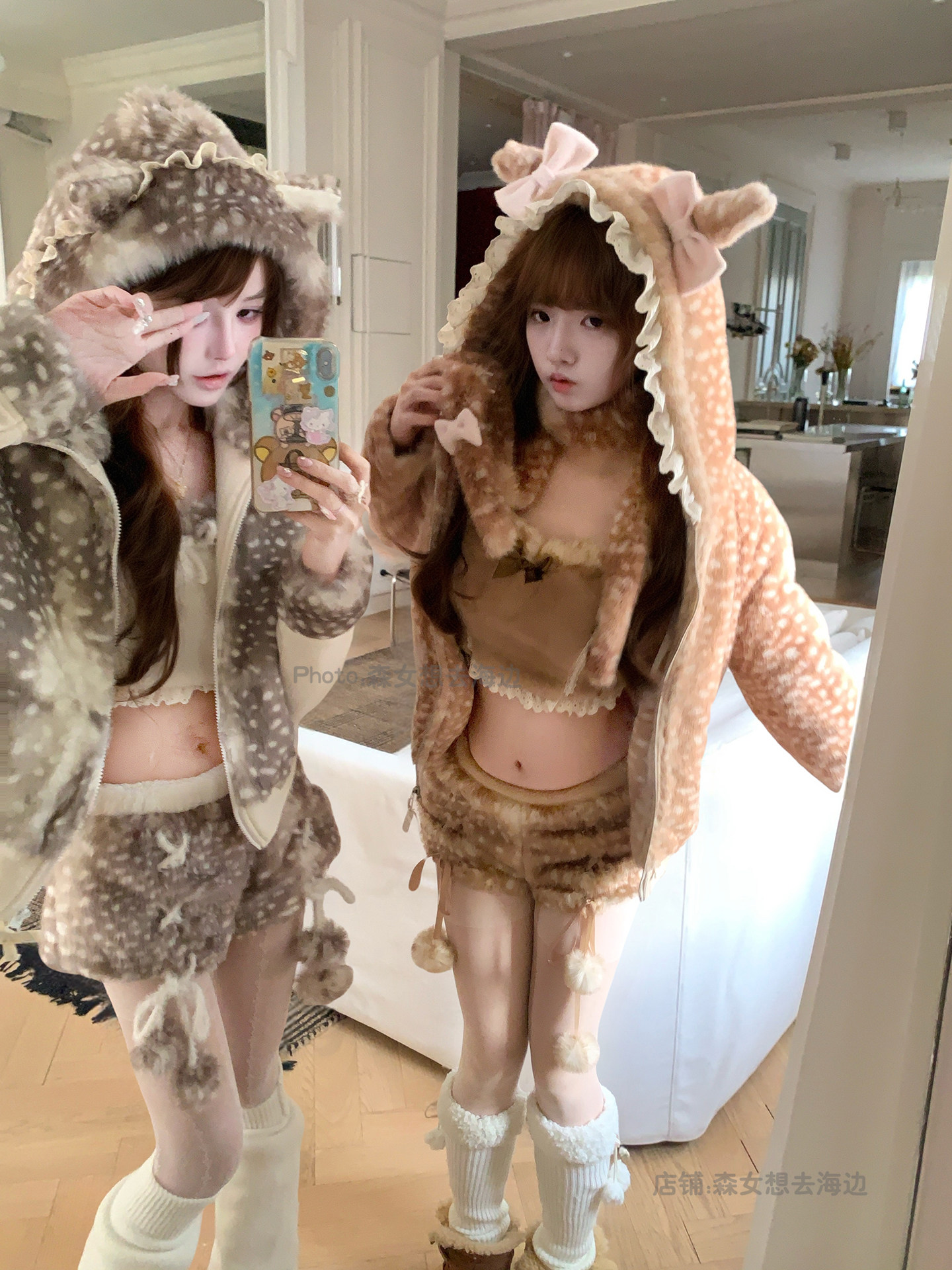 森女系原创想去海边 饼干小鹿 可爱小鹿纹圣诞风套装斗篷短裤吊带 [Original Page Link]