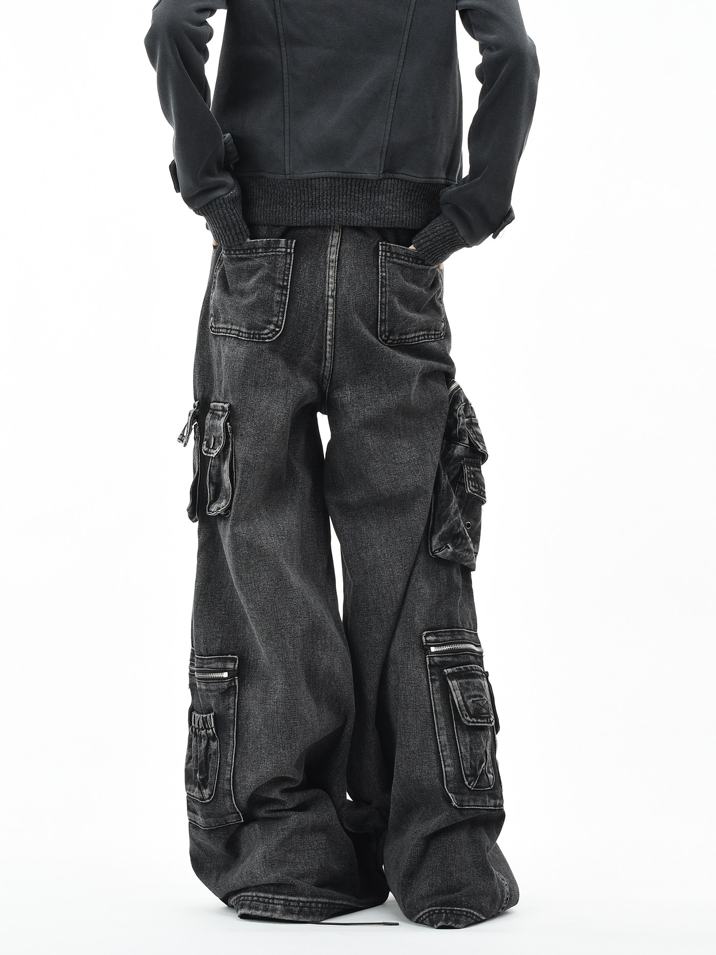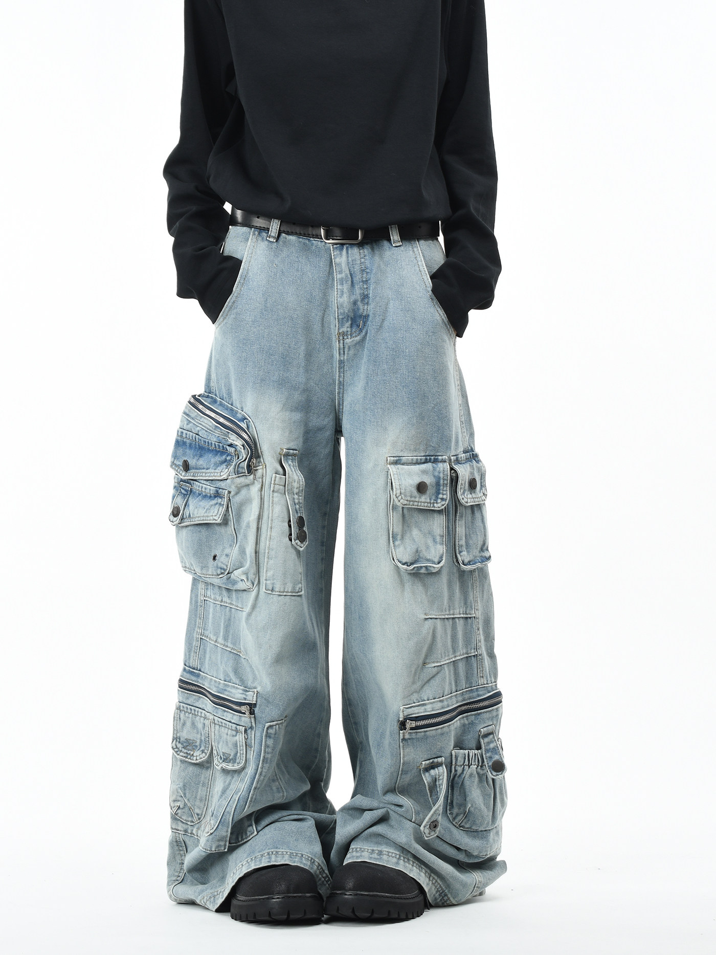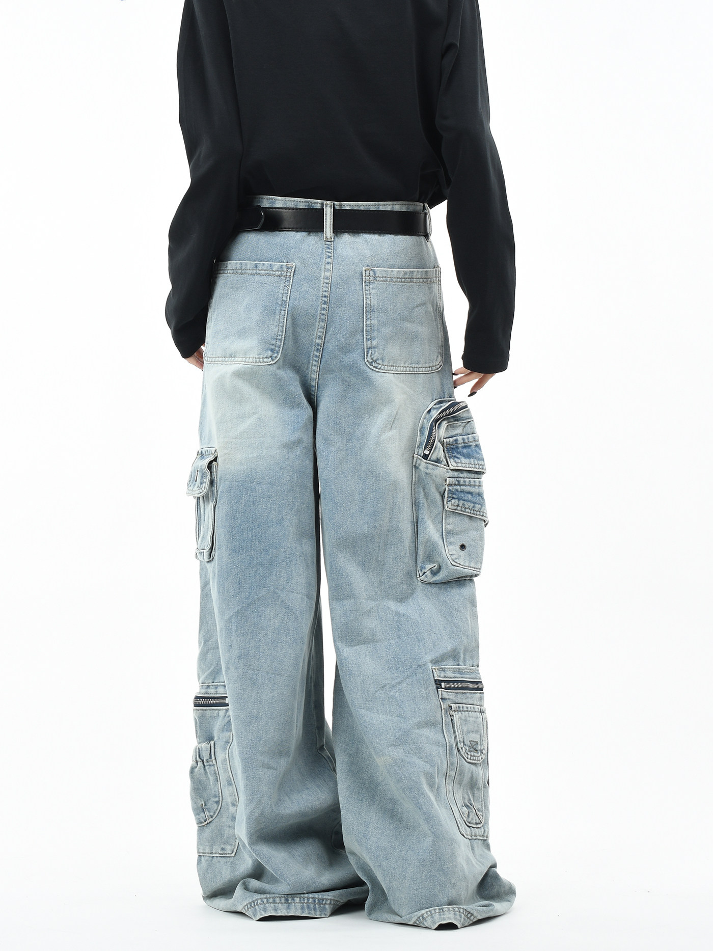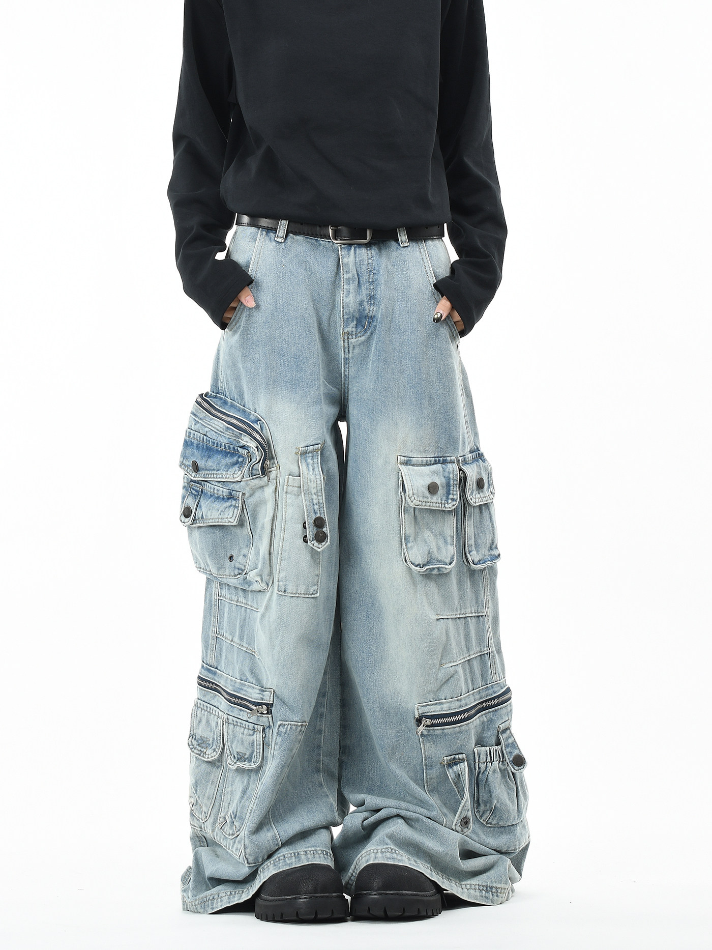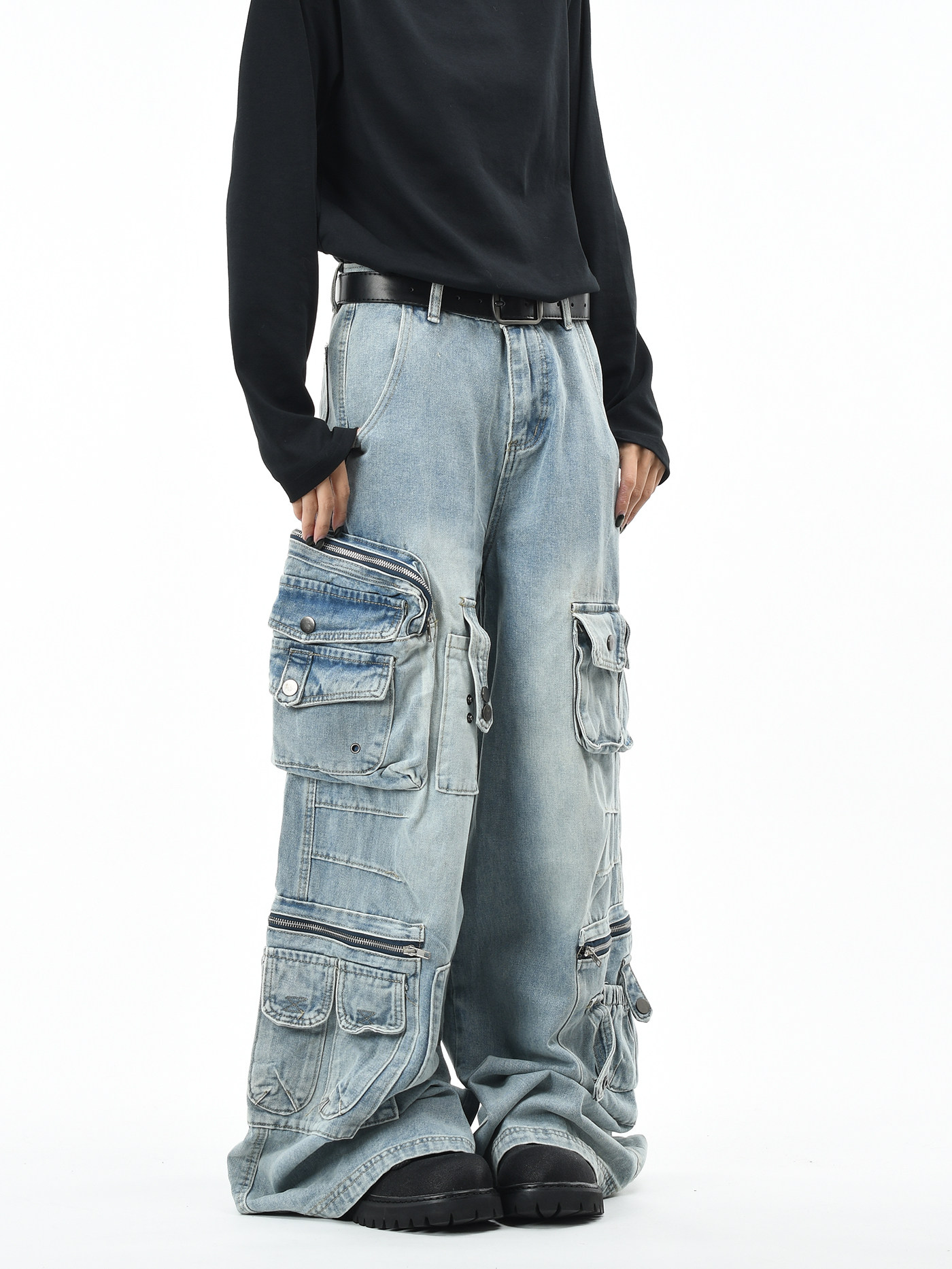 OV Original American Workwear Heavyweight Multi-Pocket Washed Jeans for Men and Women, Loose Fit Wide Leg High Street Functional Pants Trendy