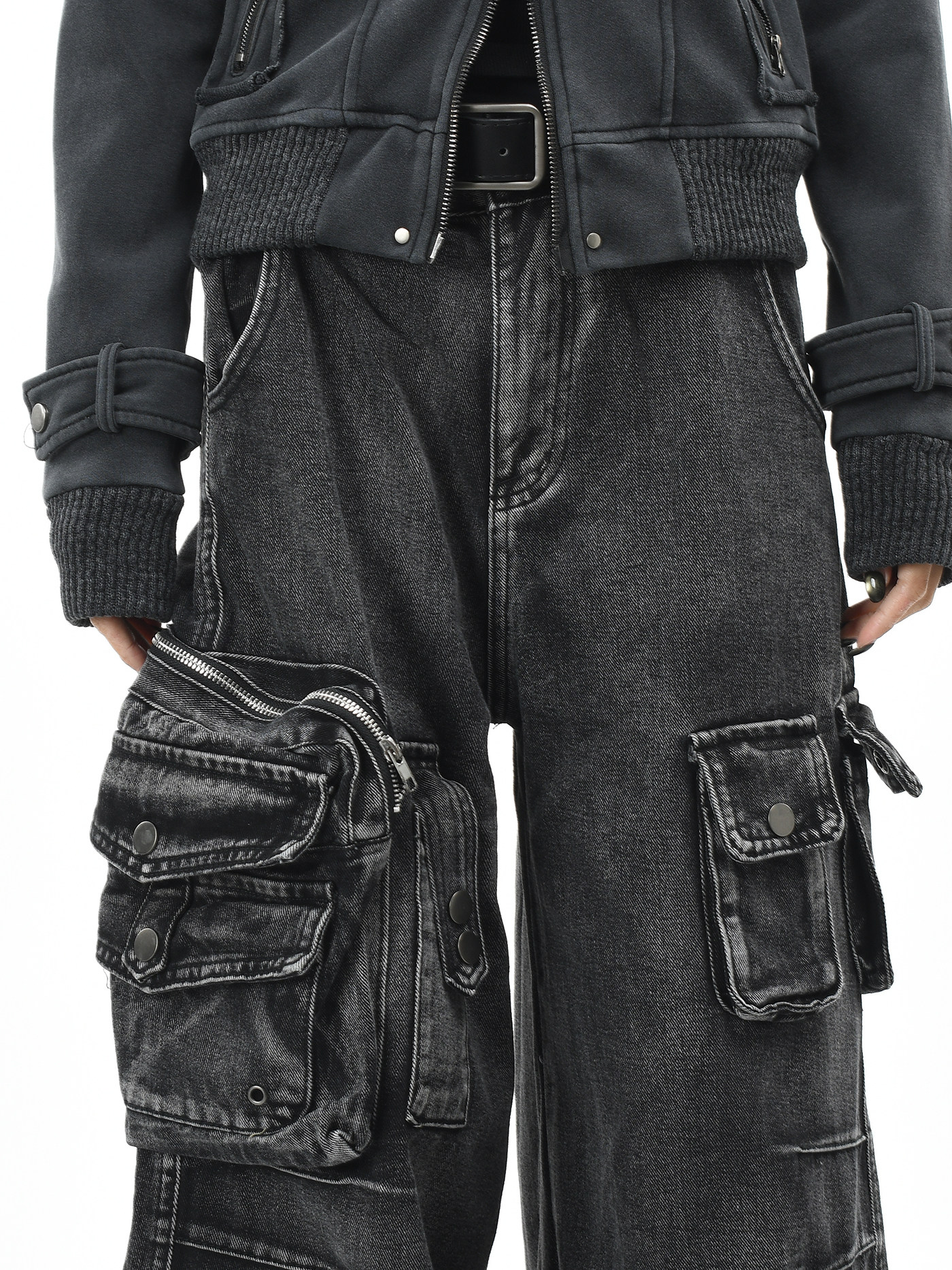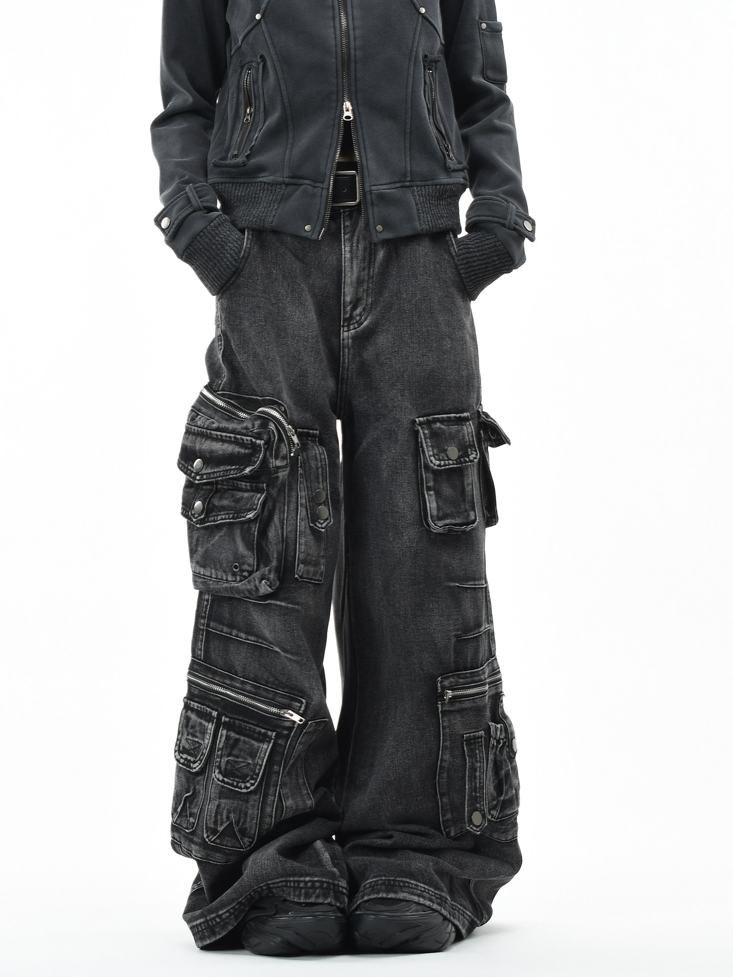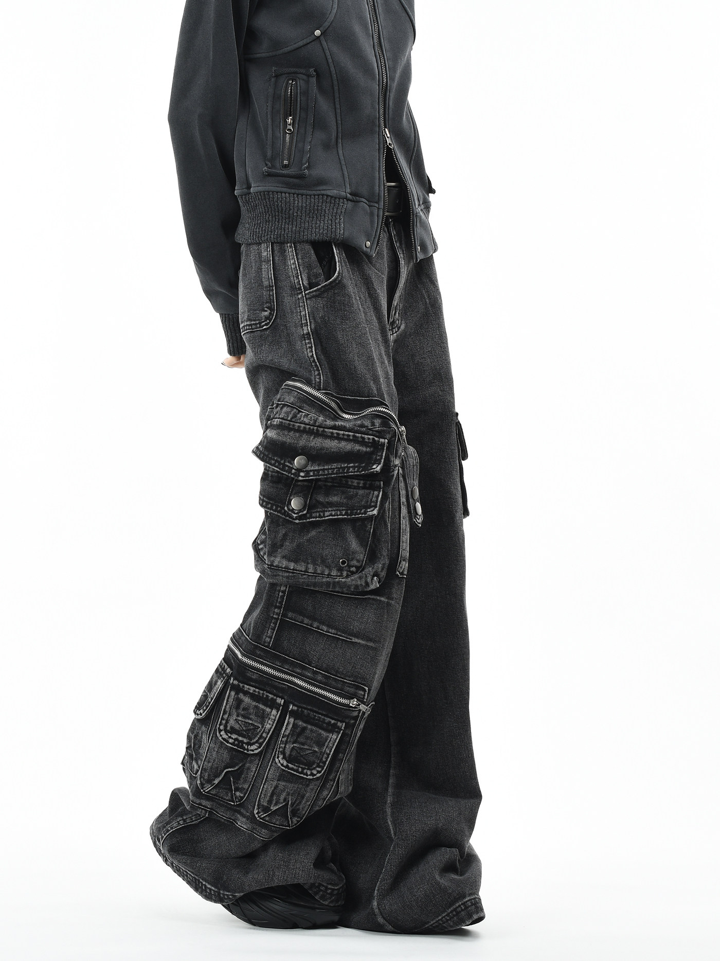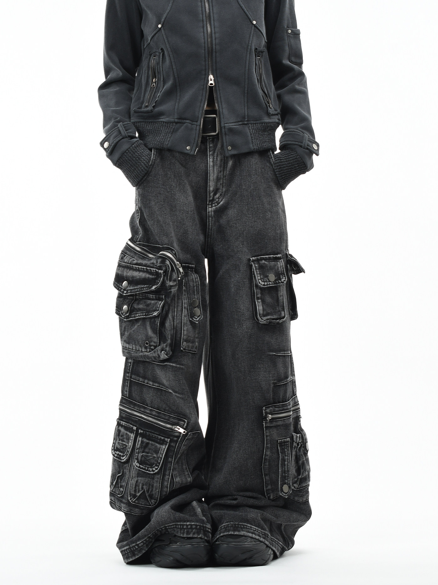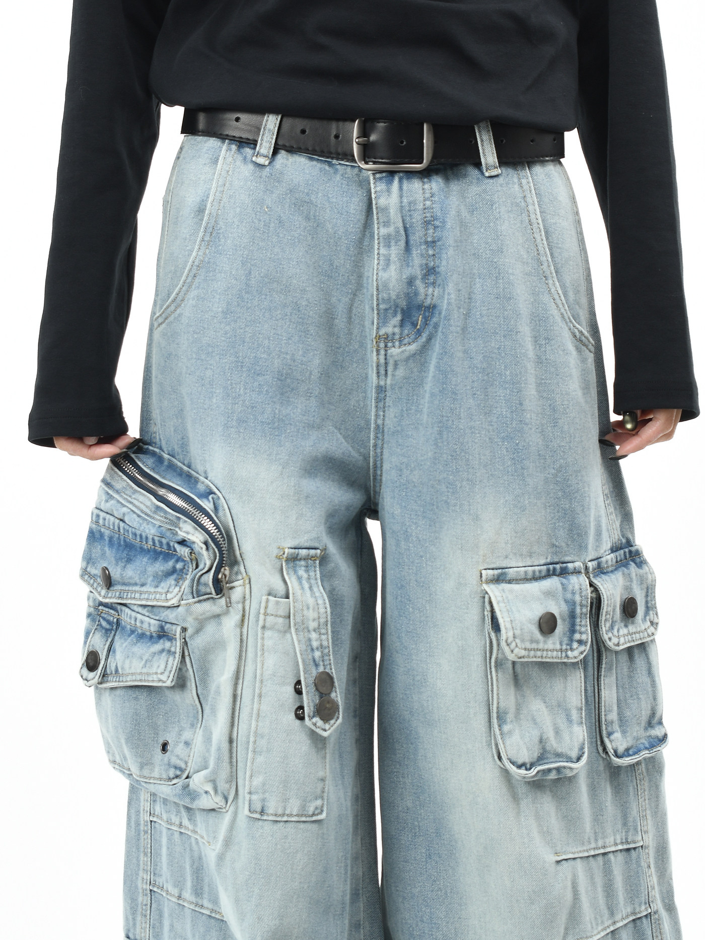 OV Original American Workwear Heavyweight Multi-Pocket Washed Jeans for Men and Women, Loose Fit Wide Leg High Street Functional Pants Trendy