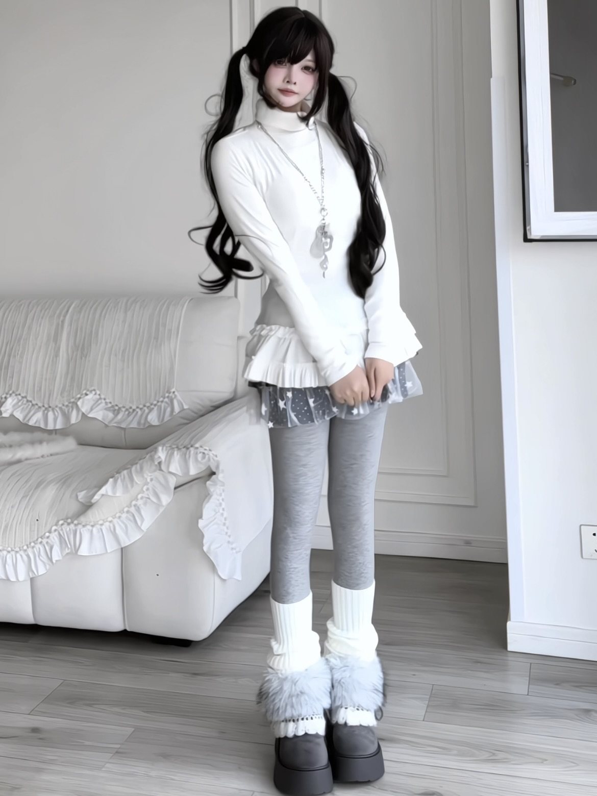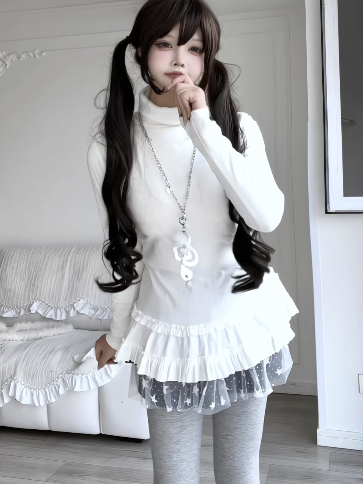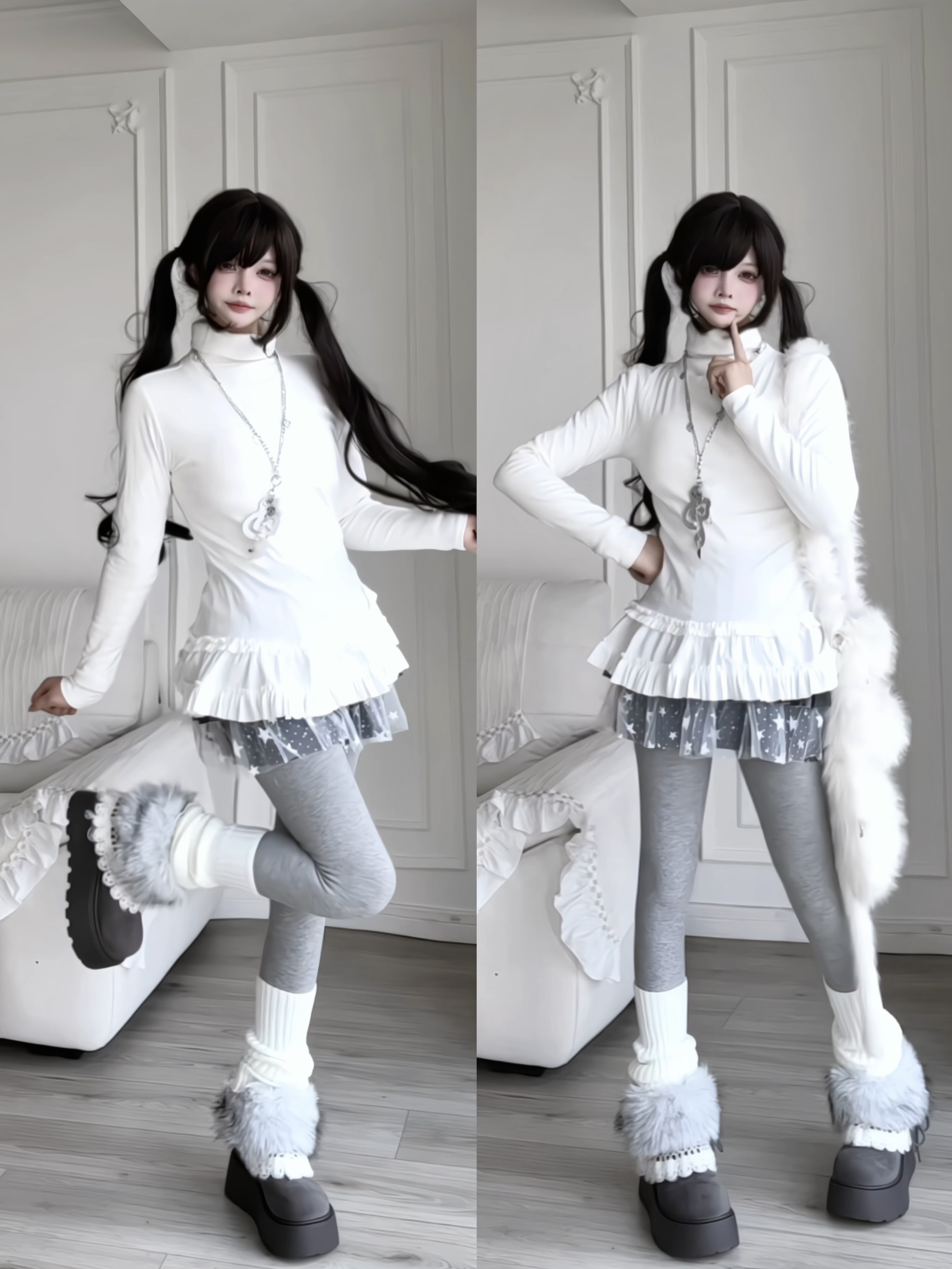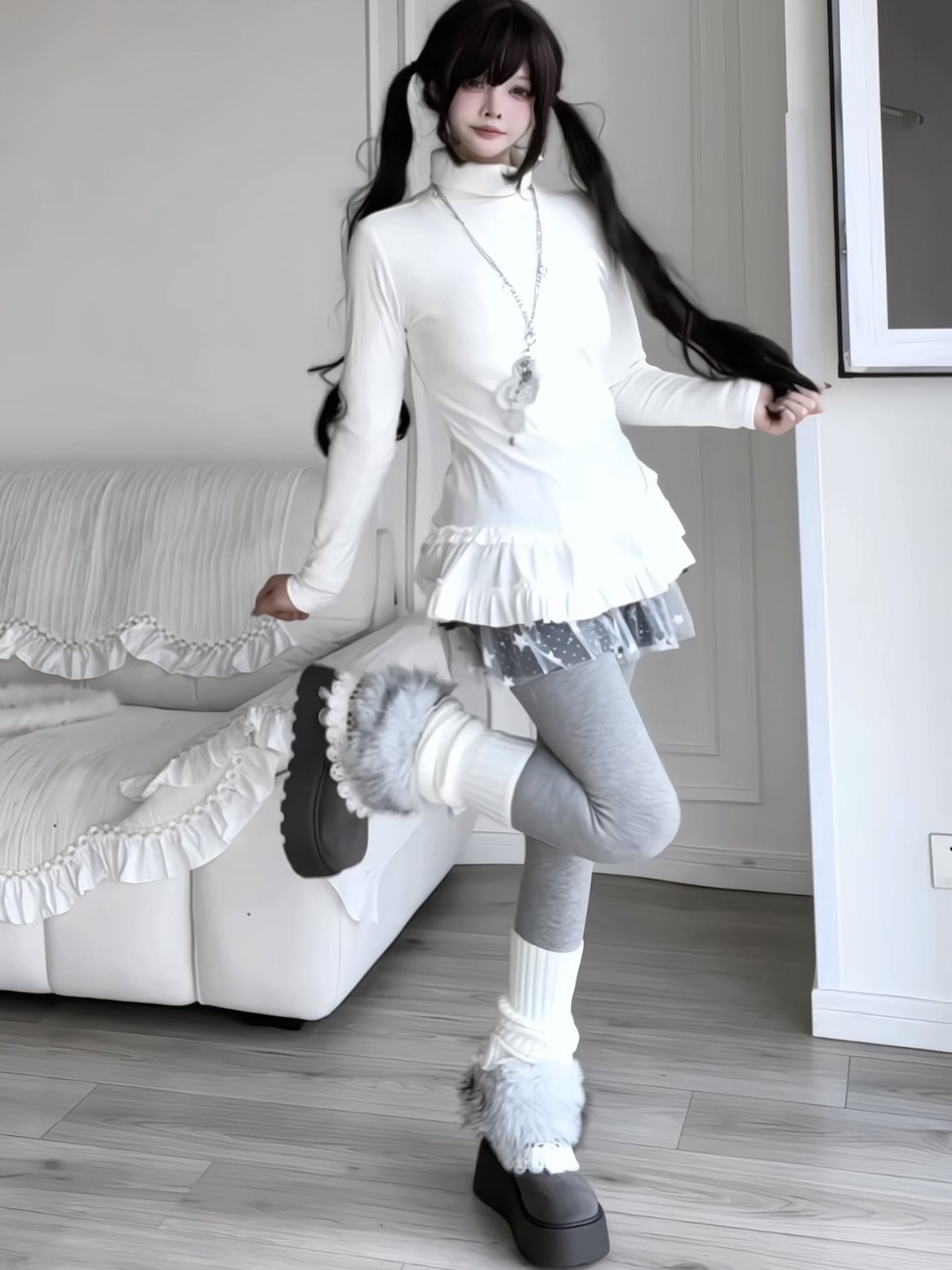 次时代/自制芭蕾风木耳边圆领打底衫女秋冬白色内搭T恤修身显瘦 [Original Page Link]