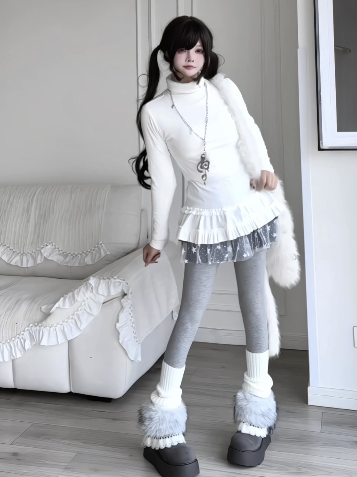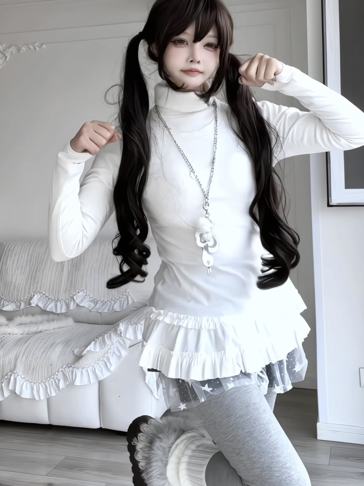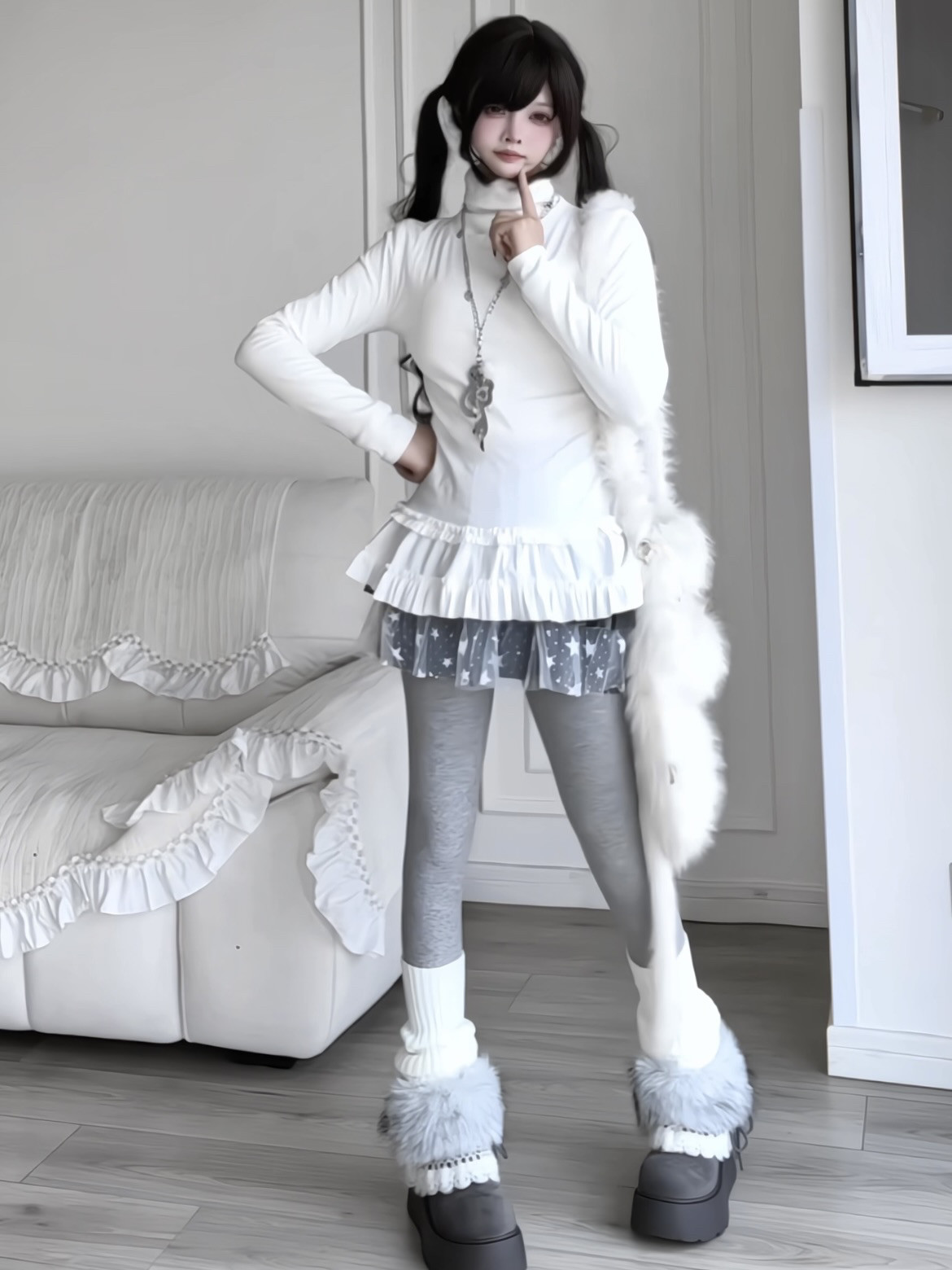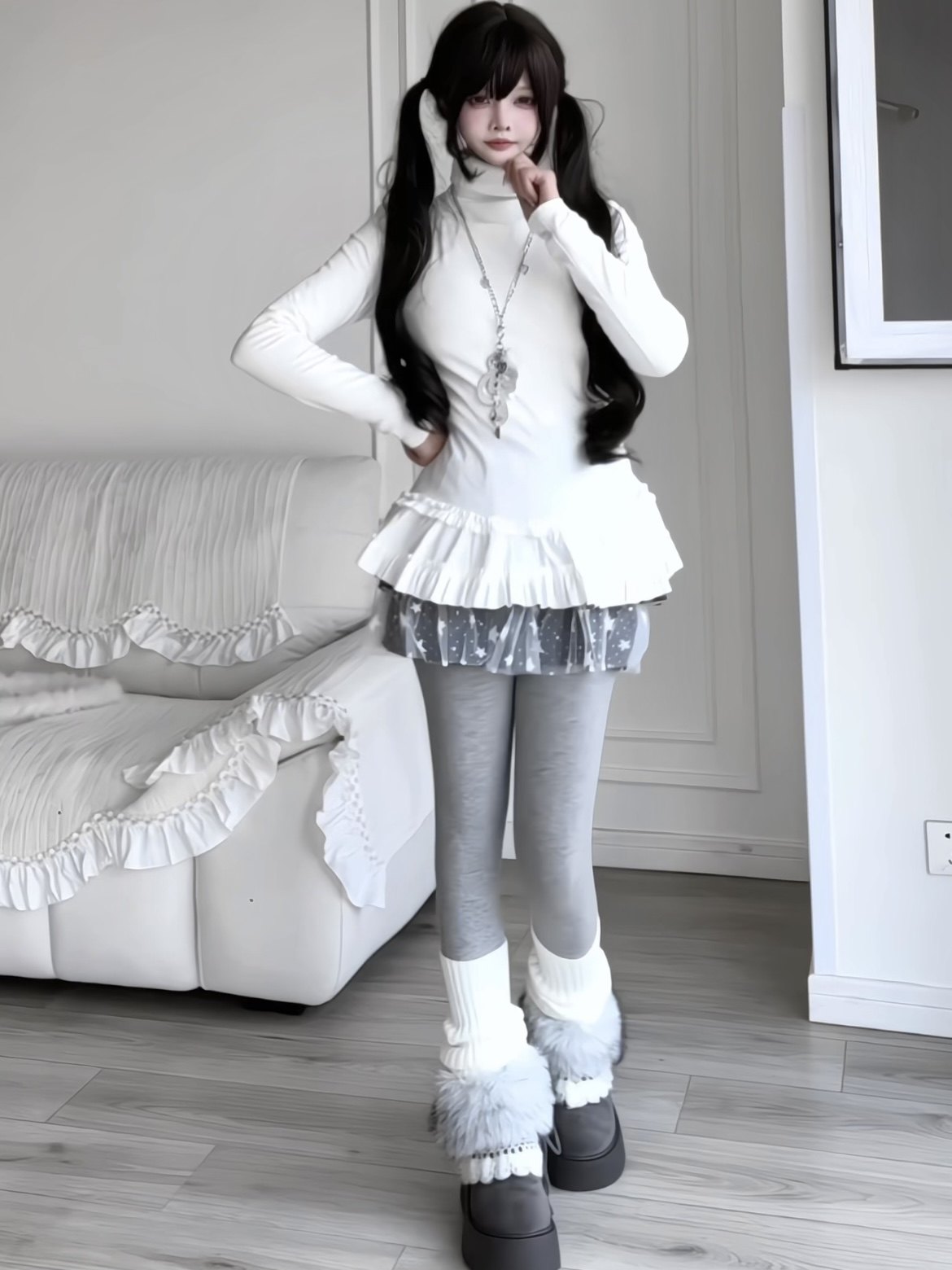次时代/自制芭蕾风木耳边圆领打底衫女秋冬白色内搭T恤修身显瘦 [Original Page Link]