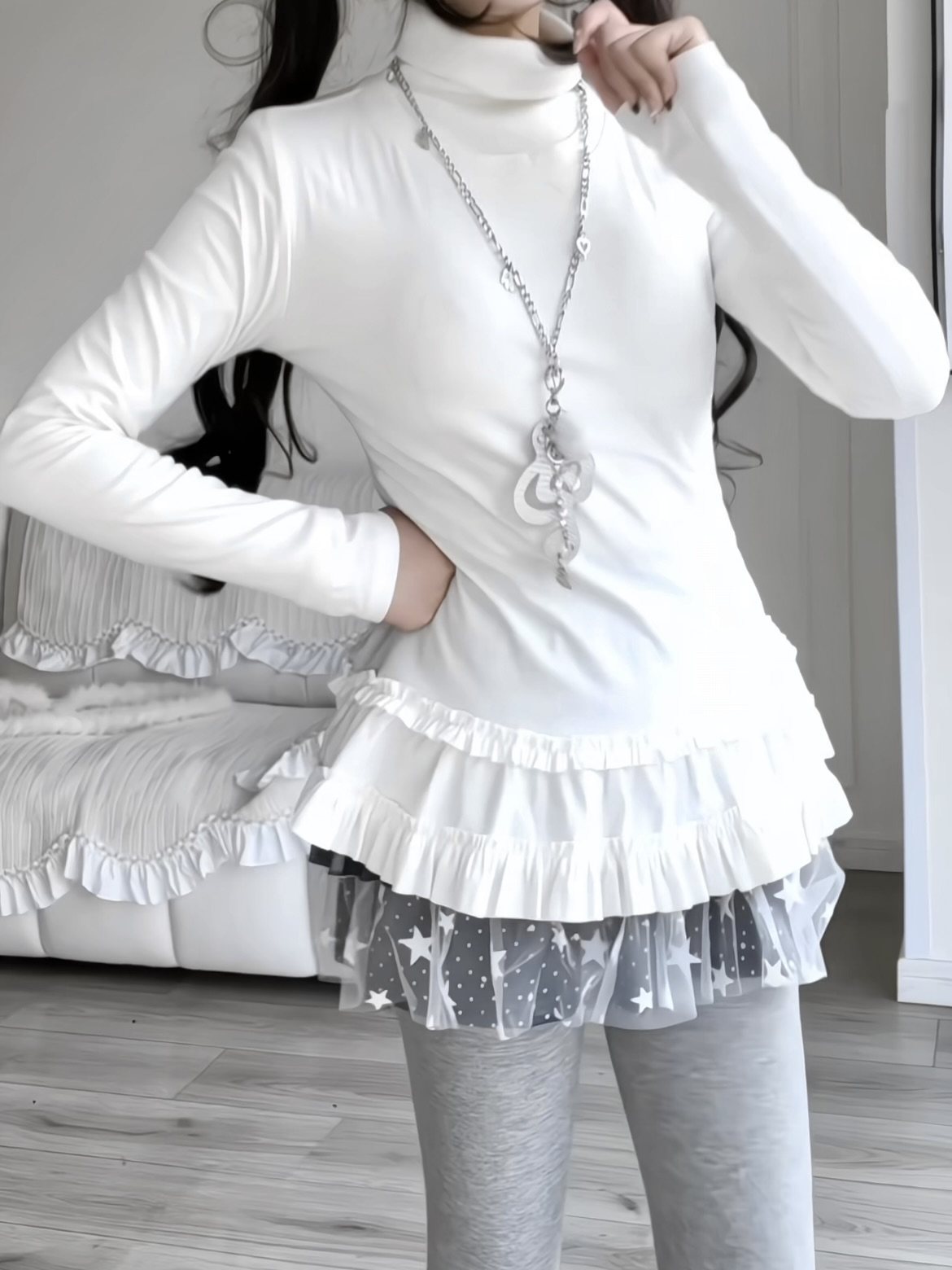 Next-generation/DIY ballet-style ruffled round neck base layer top for women, autumn and winter white inner T-shirt, slim fit and flattering.